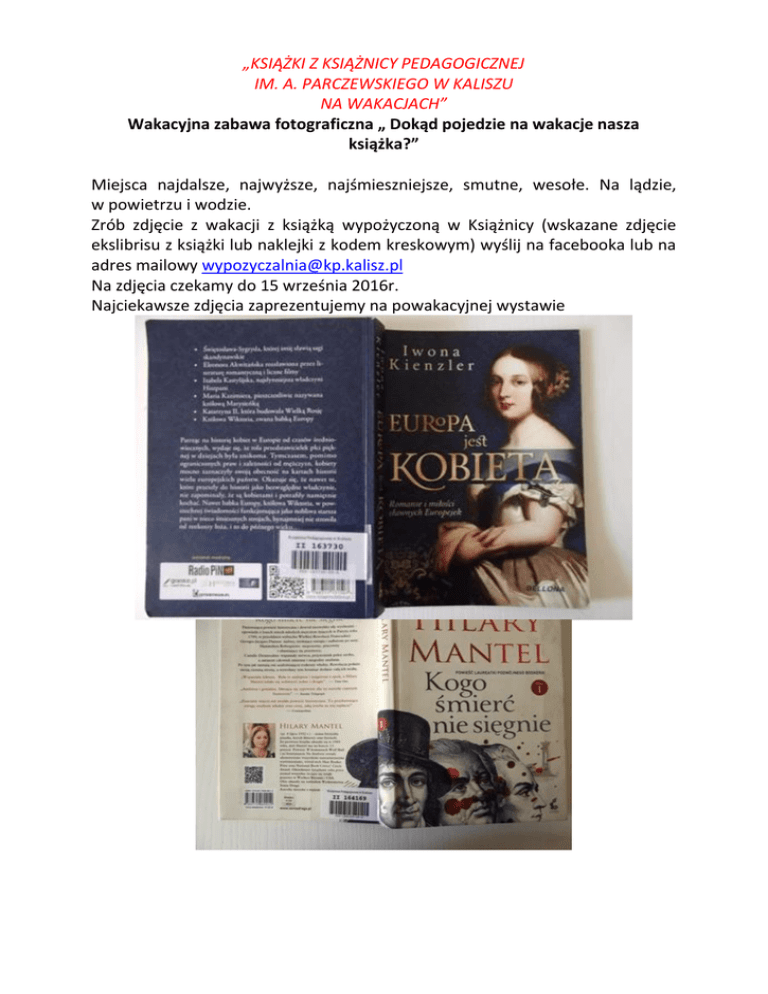 „KSIĄŻKI Z KSIĄŻNICY PEDAGOGICZNEJ IM. A. PARCZEWSKIEGO W KALISZU NA WAKACJACH” Wakacyjna zabawa fotograficzna „ Dokąd pojedzie na wakacje nasza książka?” Miejsca najdalsze, najwyższe, najśmieszniejsze, smutne, wesołe. Na lądzie, w powietrzu i wodzie. Zrób zdjęcie z wakacji z książką wypożyczoną w Książnicy (wskazane zdjęcie ekslibrisu z książki lub naklejki z kodem kreskowym) wyślij na facebooka lub na adres mailowy [email protected] Na zdjęcia czekamy do 15 września 2016r. Najciekawsze zdjęcia zaprezentujemy na powakacyjnej wystawie