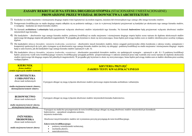ZASADY REKRUTACJI NA STUDIA DRUGIEGO STOPNIA (STACJONARNE I NIESTACJONARNE) PROWADZONE PRZEZ WYDZIAŁ BUDOWNICTWA I ARCHITEKTURY 1) 2) Kandydaci na studia stacjonarne i niestacjonarne drugiego stopnia winni legitymować się tytułem magistra, inżyniera lub równorzędnym tego samego albo innego kierunku studiów. 3) Na kierunek architektura i urbanistyka będą przyjmowani wyłącznie absolwenci studiów inżynierskich tego kierunku. Na kierunek budownictwo będą przyjmowani wyłącznie absolwenci studiów inżynierskich tego kierunku. 4) Dla kandydatów – absolwentów tego samego kierunku studiów, podstawą kwalifikacji na studia stacjonarne i niestacjonarne drugiego stopnia będzie ocena wpisana do dyplomu ukończonych studiów (pierwszego lub drugiego stopnia lub jednolitych magisterskich). W przypadku gdy kryterium to okaże się niewystarczające, brana będzie pod uwagę średnia ocen ze studiów określona przez uczelnię wydającą dyplom. 5) Dla kandydatów (dotyczy kierunków: inżynieria środowiska, wzornictwo) – absolwentów innych kierunków studiów, którzy osiągnęli porównywalne efekty kształcenia z zakresu wiedzy, umiejętności i kompetencji społecznych do tych, jakie wymagane są od absolwentów tego samego kierunku studiów (na który się ubiegają) - podstawą kwalifikacji na studia stacjonarne i niestacjonarne drugiego stopnia będą te same kryteria, jak dla kandydatów tego samego kierunku studiów (opisanych w pkt. 4). 6) Dla kandydatów (dotyczy kierunków: inżyniera środowiska, wzornictwo) - absolwentów pozostałych kierunków studiów, nie spełniających wymogów - opisanych w pkt. 4) i 5) podstawą kwalifikacji będzie: pozytywny wynik testu kwalifikacyjnego/ rozmowy kwalifikacyjnej/ przeglądu portfolio przeprowadzonego w zakresie ustalonym przez radę wydziału oraz ocena wpisana do dyplomu ukończenia studiów (pierwszego lub drugiego stopnia lub jednolitych magisterskich). W przypadku gdy kryterium to okaże się niewystarczające, brana będzie pod uwagę średnia ocen ze studiów określona przez uczelnię wydającą dyplom. Postępowanie kwalifikacyjne na studia drugiego stopnia odbędzie się na podstawie rankingu, z tym że w pierwszej kolejności przyjmowani są kandydaci po ukończeniu tego samego kierunku studiów, w następnej – kandydaci po innym kierunku studiów. KRYTERIA PRZYJĘĆ ZAKRES TESTU KWALIFIKACYJNEGO KIERUNEK forma studiów/ termin rozpoczęcia studiów (semestr) ARCHITEKTURA I URBANISTYKA obszar nauk technicznych O przyjęcie ubiegać się mogą wyłącznie absolwenci studiów pierwszego stopnia kierunku architektura i urbanistyka studia stacjonarne/semestr zimowy, niestacjonarne/semestr zimowy BUDOWNICTWO obszar nauk technicznych studia stacjonarne/semestr zimowy, niestacjonarne/semestr zimowy INŻYNIERIA ŚRODOWISKA O przyjęcie ubiegać się mogą wyłącznie absolwenci studiów inżynierskich kierunku budownictwo. O przyjęcie na studia bez przystępowania do testu kwalifikacyjnego ubiegać się mogą absolwenci studiów inżynierskich po kierunkach: budownictwo – specjalność urządzenia sanitarne, inżynieria środowiska. Absolwenci innych kierunków studiów niż wymienione powyżej przystępują do testu kwalifikacyjnego. obszar nauk technicznych studia stacjonarne/semestr zimowy Zakres testu kwalifikacyjnego: • podstawy termodynamiki technicznej, • mechanika płynów, • materiałoznawstwo, studia niestacjonarne /semestr zimowy • • • • • • • • hydrologia, podstawy technologii wody i ścieków, podstawy uzdatniania wody i oczyszczania ścieków, sieci i instalacje wodno-kanalizacyjne, ciepłej wody i gazu, ogrzewalnictwo, wentylacja i klimatyzacja, wodociągi i kanalizacje, melioracje O przyjęcie na studia bez przystępowania do rozmowy kwalifikacyjnej/przeglądu portfolio ubiegać się mogą kandydaci który ukończył studia w dziedzinie wzornictwa w specjalnościach takich jak: wzornictwo, wzornictwo przemysłowe, projektowanie form przemysłowych, projektowanie produktu, projektowanie ubioru, komunikacja wizualna Kandydat, który ukończył studia, zawierające kształcenie plastyczne i projektowe, jak na przykład architektura, architektura wnętrz, projektowanie krajobrazu czy projektowanie mebli prezentuje: • projekt dyplomowy, • prace projektowe wykonane w trakcie studiów ewentualnie praktyki zawodowej, • wybrane prace plastyczne. Kandydat, którego poświadczona praktyka zawodowa związana jest z dziedziną sztuk projektowych • prezentuje własne zawodowe prace projektowe w formie portfolio. WZORNICTWO studia stacjonarne/semestr zimowy Kandydat, który nie jest absolwentem: architektury, architektury wnętrz, projektowania krajobrazu, jak również nie ma praktyki zawodowej związanej z dziedziną sztuk projektowych, prezentuje: • zadanie projektowe zbliżone do projektów realizowanych w trakcie studiów w dziedzinie wzornictwa, • w trakcie rozmowy kwalifikacyjnej prezentuje zadanie projektowe, które ma na celu zweryfikowanie predyspozycji kierunkowych kandydata. ZADANIE PROJEKTOWE TEMAT - PLECAK Na podstawie analizy istniejących produktów i własnych doświadczeń oraz obserwacji, należy zaprojektować nowy produkt, charakteryzujący się innowacyjną stylistyką oraz uwzględniający osobiste potrzeby. W pracy należy uwzględnić: • opis produktu, • szkice koncepcyjne wraz ze szczegółami, • wizualizacje. Całość przedstawić na trzech planszach formatu A2 (50 cm x 70 cm) więcej informacji na stronie http://www.wzornictwo.zut.edu.pl/kierunek.html