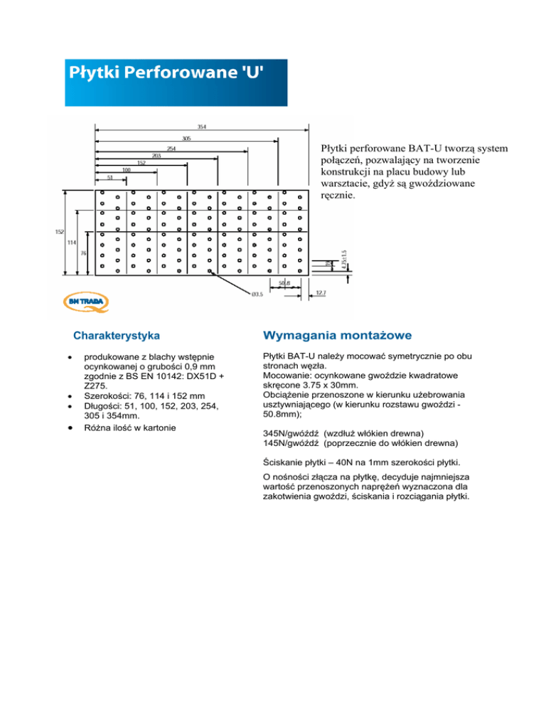 Płytki perforowane BAT-U tworzą system połączeń, pozwalający na tworzenie konstrukcji na placu budowy lub warsztacie, gdyż są gwoździowane ręcznie. Charakterystyka • • • • produkowane z blachy wstępnie ocynkowanej o grubości 0,9 mm zgodnie z BS EN 10142: DX51D + Z275. Szerokości: 76, 114 i 152 mm Długości: 51, 100, 152, 203, 254, 305 i 354mm. Różna ilość w kartonie Wymagania montażowe Płytki BAT-U należy mocować symetrycznie po obu stronach węzła. Mocowanie: ocynkowane gwoździe kwadratowe skręcone 3.75 x 30mm. Obciążenie przenoszone w kierunku użebrowania usztywniającego (w kierunku rozstawu gwoździ 50.8mm); 345N/gwóźdź (wzdłuż włókien drewna) 145N/gwóźdź (poprzecznie do włókien drewna) Ściskanie płytki – 40N na 1mm szerokości płytki. O nośności złącza na płytkę, decyduje najmniejsza wartość przenoszonych naprężeń wyznaczona dla zakotwienia gwoździ, ściskania i rozciągania płytki.