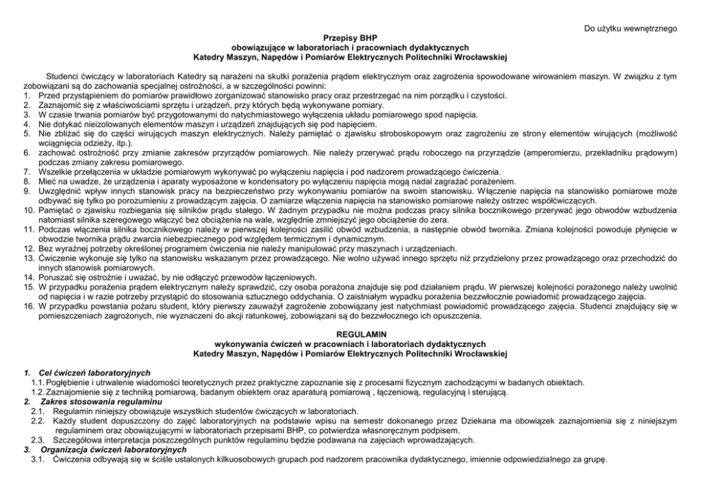 Do użytku wewnętrznego Przepisy BHP obowiązujące w laboratoriach i pracowniach dydaktycznych Katedry Maszyn, Napędów i Pomiarów Elektrycznych Politechniki Wrocławskiej Studenci ćwiczący w laboratoriach Katedry są narażeni na skutki porażenia prądem elektrycznym oraz zagrożenia spowodowane wirowaniem maszyn. W związku z tym zobowiązani są do zachowania specjalnej ostrożności, a w szczególności powinni: 1. Przed przystąpieniem do pomiarów prawidłowo zorganizować stanowisko pracy oraz przestrzegać na nim porządku i czystości. 2. Zaznajomić się z właściwościami sprzętu i urządzeń, przy których będą wykonywane pomiary. 3. W czasie trwania pomiarów być przygotowanymi do natychmiastowego wyłączenia układu pomiarowego spod napięcia. 4. Nie dotykać nieizolowanych elementów maszyn i urządzeń znajdujących się pod napięciem. 5. Nie zbliżać się do części wirujących maszyn elektrycznych. Należy pamiętać o zjawisku stroboskopowym oraz zagrożeniu ze strony elementów wirujących (możliwość wciągnięcia odzieży, itp.). 6. zachować ostrożność przy zmianie zakresów przyrządów pomiarowych. Nie należy przerywać prądu roboczego na przyrządzie (amperomierzu, przekładniku prądowym) podczas zmiany zakresu pomiarowego. 7. Wszelkie przełączenia w układzie pomiarowym wykonywać po wyłączeniu napięcia i pod nadzorem prowadzącego ćwiczenia. 8. Mieć na uwadze, że urządzenia i aparaty wyposażone w kondensatory po wyłączeniu napięcia mogą nadal zagrażać porażeniem. 9. Uwzględnić wpływ innych stanowisk pracy na bezpieczeństwo przy wykonywaniu pomiarów na swoim stanowisku. W łączenie napięcia na stanowisko pomiarowe może odbywać się tylko po porozumieniu z prowadzącym zajęcia. O zamiarze włączenia napięcia na stanowisko pomiarowe należy ostrzec współćwiczących. 10. Pamiętać o zjawisku rozbiegania się silników prądu stałego. W żadnym przypadku nie można podczas pracy silnika bocznikowego przerywać jego obwodów wzbudzenia natomiast silnika szeregowego włączyć bez obciążenia na wale, względnie zmniejszyć jego obciążenie do zera. 11. Podczas włączenia silnika bocznikowego należy w pierwszej kolejności zasilić obwód wzbudzenia, a następnie obwód twornika. Zmiana kolejności powoduje płynięcie w obwodzie twornika prądu zwarcia niebezpiecznego pod względem termicznym i dynamicznym. 12. Bez wyraźnej potrzeby określonej programem ćwiczenia nie należy manipulować przy maszynach i urządzeniach. 13. Ćwiczenie wykonuje się tylko na stanowisku wskazanym przez prowadzącego. Nie wolno używać innego sprzętu niż przydzielony przez prowadzącego oraz przechodzić do innych stanowisk pomiarowych. 14. Poruszać się ostrożnie i uważać, by nie odłączyć przewodów łączeniowych. 15. W przypadku porażenia prądem elektrycznym należy sprawdzić, czy osoba porażona znajduje się pod działaniem prądu. W pierwszej kolejności porażonego należy uwolnić od napięcia i w razie potrzeby przystąpić do stosowania sztucznego oddychania. O zaistniałym wypadku porażenia bezzwłocznie powiadomić prowadzącego zajęcia. 16. W przypadku powstania pożaru student, który pierwszy zauważył zagrożenie zobowiązany jest natychmiast powiadomić prowadzącego zajęcia. Studenci znajdujący się w pomieszczeniach zagrożonych, nie wyznaczeni do akcji ratunkowej, zobowiązani są do bezzwłocznego ich opuszczenia. REGULAMIN wykonywania ćwiczeń w pracowniach i laboratoriach dydaktycznych Katedry Maszyn, Napędów i Pomiarów Elektrycznych Politechniki Wrocławskiej 1. Cel ćwiczeń laboratoryjnych 1.1. Pogłębienie i utrwalenie wiadomości teoretycznych przez praktyczne zapoznanie się z procesami fizycznym zachodzącymi w badanych obiektach. 1.2. Zaznajomienie się z techniką pomiarową, badanym obiektem oraz aparaturą pomiarową , łączeniową, regulacyjną i sterującą. 2. Zakres stosowania regulaminu 2.1. Regulamin niniejszy obowiązuje wszystkich studentów ćwiczących w laboratoriach. 2.2. Każdy student dopuszczony do zajęć laboratoryjnych na podstawie wpisu na semestr dokonanego przez Dziekana ma obowiązek zaznajomienia się z niniejszym regulaminem oraz obowiązującymi w laboratoriach przepisami BHP, co potwierdza własnoręcznym podpisem. 2.3. Szczegółowa interpretacja poszczególnych punktów regulaminu będzie podawana na zajęciach wprowadzających. 3. Organizacja ćwiczeń laboratoryjnych 3.1. Ćwiczenia odbywają się w ściśle ustalonych kilkuosobowych grupach pod nadzorem pracownika dydaktycznego, imiennie odpowiedzialnego za grupę. 3.2. Przed rozpoczęciem ćwiczenia prowadzący sprawdza stopień opanowania przez studentów wiedzy teoretycznej wchodzącej w zakres danego ćwiczenia. Przygotowanie do ćwiczeń powinno odbywać się na podstawie wykładów, instrukcji do ćwiczeń oraz wskazanych skryptów i podręczników. 3.3. Każda grupa przystępująca do ćwiczeń powinna mieć przygotowany protokół do zapisywania wyników pomiarów. 3.4. Przed przystąpieniem do ćwiczeń studenci wyznaczają sposób składu osobowego grupy: a) kierującego, do obowiązków którego należy podział czynności w ramach grupy i kierowania całością pracy, b) prowadzącego protokół z pomiarów. O podziale funkcji w grupie studenci informują prowadzącego ćwiczenia. 3.5. Studenci wykonują ćwiczenia samodzielnie z tym, że włączenie układu do sieci może nastąpić tylko po sprawdzeniu go przez prowadzącego ćwiczenia. Każda zmiana układu połączeń wymaga oddzielnego uzgodnienia z prowadzącym. W przypadku posługiwaniem się kosztowną i skomplikowaną aparaturą, do jej obsługi może być przydzielony laborant. 3.6. Za uszkodzenia wynikłe z samodzielnego włączenia nie sprawdzonego układu lub wykonywania pomiarów niezgodnego z instrukcją, studenci odpowiadają dyscyplinarnie i materialnie. 3.7. Wszelkie dostrzeżone w czasie wykonywania pomia