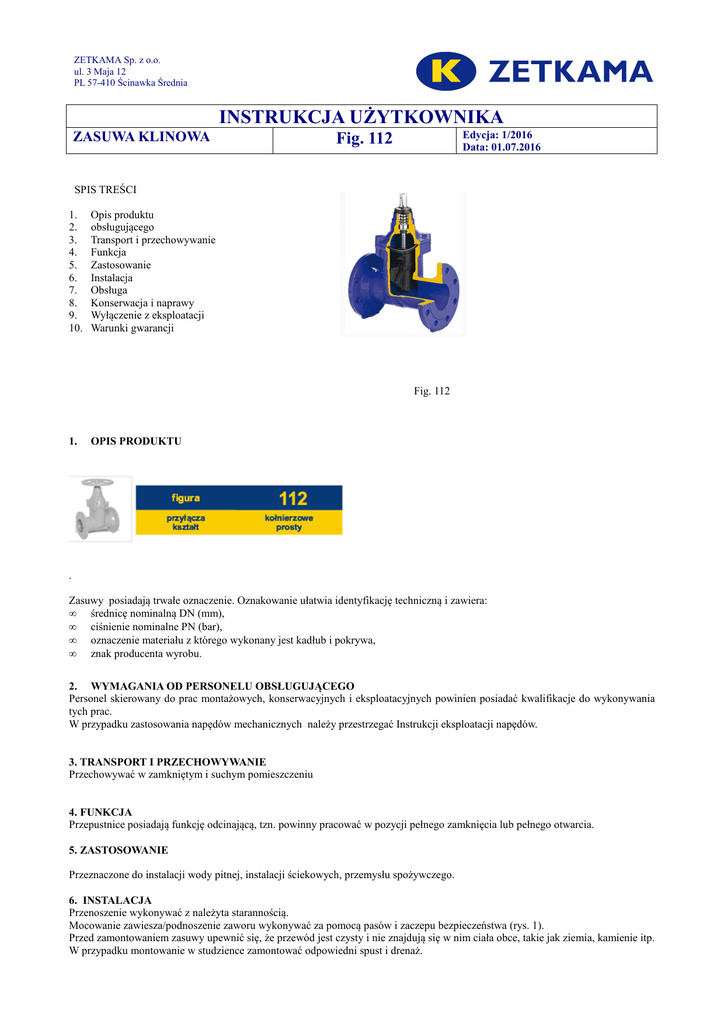 ZETKAMA Sp. z o.o. ul. 3 Maja 12 PL 57-410 Ścinawka Średnia INSTRUKCJA UŻYTKOWNIKA ZASUWA KLINOWA Edycja: 1/2016 Data: 01.07.2016 Fig. 112 SPIS TREŚCI 1. 2. 3. 4. 5. 6. 7. 8. 9. 10. Opis produktu obsługującego Transport i przechowywanie Funkcja Zastosowanie Instalacja Obsługa Konserwacja i naprawy Wyłączenie z eksploatacji Warunki gwarancji Fig. 112 1. OPIS PRODUKTU . Zasuwy posiadają trwałe oznaczenie. Oznakowanie ułatwia identyfikację techniczną i zawiera: • średnicę nominalną DN (mm), • ciśnienie nominalne PN (bar), • oznaczenie materiału z którego wykonany jest kadłub i pokrywa, • znak producenta wyrobu. 2. WYMAGANIA OD PERSONELU OBSŁUGUJĄCEGO Personel skierowany do prac montażowych, konserwacyjnych i eksploatacyjnych powinien posiadać kwalifikacje do wykonywania tych prac. W przypadku zastosowania napędów mechanicznych należy przestrzegać Instrukcji eksploatacji napędów. 3. TRANSPORT I PRZECHOWYWANIE Przechowywać w zamkniętym i suchym pomieszczeniu 4. FUNKCJA Przepustnice posiadają funkcję odcinającą, tzn. powinny pracować w pozycji pełnego zamknięcia lub pełnego otwarcia. 5. ZASTOSOWANIE Przeznaczone do instalacji wody pitnej, instalacji ściekowych, przemysłu spożywczego. 6. INSTALACJA Przenoszenie wykonywać z należyta starannością. Mocowanie zawiesza/podnoszenie zaworu wykonywać za pomocą pasów i zaczepu bezpieczeństwa (rys. 1). Przed zamontowaniem zasuwy upewnić się, że przewód jest czysty i nie znajdują się w nim ciała obce, takie jak ziemia, kamienie itp. W przypadku montowanie w studzience zamontować odpowiedni spust i drenaż. W przypadku montowania zasuw o średnicy powyżej DN200, zaleca się stosowanie złącza demontującego w celu ułatwienia czynności montażu/demontażu. Śruby dokręcać metodą krzyżową, rozkładając równomiernie nacisk aż do zetknięcia się korpusu zaworu z kołnierzami. Rys. 1 TEMPERATURA EPDM Ciecze inne, niż niebezpieczne Tmin °C -10 Tmaks°C +70 Tkrótkotrwale +80 Maksymalne ciśnienie 0-16 barów DN40-300 W przypadku pracy z cieczami innymi, niż wyszczególnione, zwrócić się do producenta o określenie zgodności oraz warunków pracy. 7. OBSŁUGA - Nie pozostawiać zasuw wypełnionych wodą w miejscach narażonych na spadki temperatury powodujące zamarzanie, jeżeli nie występuje przepływ cieczy. W takim przypadku należy opróżnić rurociąg. - Uderzenia ciśnienia mogą powodować uszkodzenia i awarie. Należy zapobiegać ich występowaniu lub montować elastyczne złącza, w celu zmniejszenia skutków wystąpienia uderzeń. 8. KONSERWACJA I NAPRAWA Zasuwy z klinem ogumowanym ZETKAMA spełniają wymogi normy ISO 7259. Umożliwia to wymianę uszczelnień wału sterującego bez demontowania zasuwy oraz podczas gdy instalacja pozostaje pod ciśnieniem. 1. 2. 3. 4. 5. 6. Otworzyć całkowicie zawór. Zdemontować pokrywę/pokrętło, odkręcając śrubę (1 na rys. 2). Zdemontować osłonę przeciwpyłową (2 na rys. 2). Wyciągnąć tuleję (3 na rys. 2). Wymienić uszczelnienie wału. Zamontować ponownie zdemontowane części. Interwencje w obrębie innych części wewnętrznych można wykonywać po odcięciu linii oraz obniżeniu ciśnienia, ale bez konieczności demontowania korpusu zasuwy. Rys 2 9.WYŁĄCZENIE Z EKSPLOATACJI Po wyłączeniu z eksploatacji i zdemontowaniu zasuw nie wolno wyrzucać razem z odpadami gospodarczymi. Zasuwy zbudowane są z materiałów podlegających odzyskowi. W tym celu należy dostarczyć je do punktu recyklingu. 10. WARUNKI GWARANCJI - ZETKAMA udziela gwarancji jakości zapewniając poprawne funkcjonowanie swoich produktów, pod warunkiem montażu zgodnie z instrukcją użytkownika i eksploatacji zgodnej z warunkami technicznymi oraz parametrami określonymi w kartach katalogowych ZETKAMY. Termin gwarancji wynosi 18 miesięcy od daty instalacji, nie dłużej jednak niż 24 miesiące od daty sprzedaży. - roszczeniom gwarancyjnym nie podlega montaż obcych części oraz zmiany konstrukcyjne dokonane przez użytkownika jak również naturalne zużycie. − − o wadach ukrytych wyrobu użytkownik powinien poinformować ZETKAMĘ natychmiast po ich stwierdzeniu. reklamacja wymaga zachowania formy pisemnej. Adres do korespondencji ZETKAMA Sp. z o.o. ul. 3 Maja12 57-410 Ścinawka Średnia Telefon (0048) (74) 8652111 Telefax (0048) (74) 8652101 Internet: http:// www.zetkama.pl