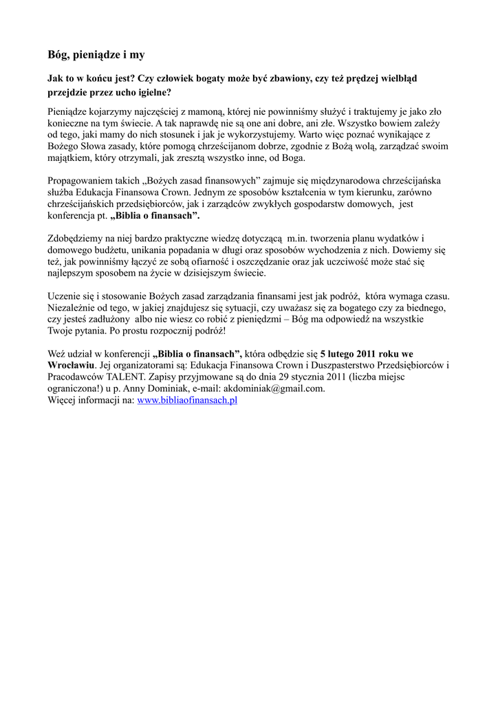 Bóg, pieniądze i my Jak to w końcu jest? Czy człowiek bogaty może być zbawiony, czy też prędzej wielbłąd przejdzie przez ucho igielne? Pieniądze kojarzymy najczęściej z mamoną, której nie powinniśmy służyć i traktujemy je jako zło konieczne na tym świecie. A tak naprawdę nie są one ani dobre, ani złe. Wszystko bowiem zależy od tego, jaki mamy do nich stosunek i jak je wykorzystujemy. Warto więc poznać wynikające z Bożego Słowa zasady, które pomogą chrześcijanom dobrze, zgodnie z Bożą wolą, zarządzać swoim majątkiem, który otrzymali, jak zresztą wszystko inne, od Boga. Propagowaniem takich „Bożych zasad finansowych” zajmuje się międzynarodowa chrześcijańska służba Edukacja Finansowa Crown. Jednym ze sposobów kształcenia w tym kierunku, zarówno chrześcijańskich przedsiębiorców, jak i zarządców zwykłych gospodarstw domowych, jest konferencja pt. „Biblia o finansach”. Zdobędziemy na niej bardzo praktyczne wiedzę dotyczącą m.in. tworzenia planu wydatków i domowego budżetu, unikania popadania w długi oraz sposobów wychodzenia z nich. Dowiemy się też, jak powinniśmy łączyć ze sobą ofiarność i oszczędzanie oraz jak uczciwość może stać się najlepszym sposobem na życie w dzisiejszym świecie. Uczenie się i stosowanie Bożych zasad zarządzania finansami jest jak podróż, która wymaga czasu. Niezależnie od tego, w jakiej znajdujesz się sytuacji, czy uważasz się za bogatego czy za biednego, czy jesteś zadłużony albo nie wiesz co robić z pieniędzmi – Bóg ma odpowiedź na wszystkie Twoje pytania. Po prostu rozpocznij podróż! Weź udział w konferencji „Biblia o finansach”, która odbędzie się 5 lutego 2011 roku we Wrocławiu. Jej organizatorami są: Edukacja Finansowa Crown i Duszpasterstwo Przedsiębiorców i Pracodawców TALENT. Zapisy przyjmowane są do dnia 29 stycznia 2011 (liczba miejsc ograniczona!) u p. Anny Dominiak, e-mail: [email protected]. Więcej informacji na: www.bibliaofinansach.pl