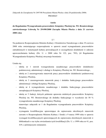 Załącznik do Zarządzenia Nr 2497/08 Prezydenta Miasta Płocka z dnia 20 października 2008r. PROJEKT Aneks do Regulaminu Wynagradzania pracowników Książnicy Płockiej im. Wł. Broniewskiego zatwierdzonego Uchwałą Nr 29/490/2000 Zarządu Miasta Płocka z dnia 21 czerwca 2000 roku §1 Na podstawie Rozporządzenia Ministra Kultury i Dziedzictwa Narodowego z dnia 19 czerwca 2008 roku zmieniającego rozporządzenie w sprawie zasad wynagradzania pracowników zatrudnionych w instytucjach kultury prowadzących w szczególności działalność w zakresie upowszechniania kultury (Dz. U. z 2008 roku Nr 122, poz. 785), §4 Regulaminu Wynagradzania Książnicy Płockiej otrzymuje brzmienie: Ustala się: - tabelę nr 1 stawek wynagrodzenia zasadniczego pracowników działalności podstawowej, administracji i obsługi w Książnicy Płockiej im. Wł. Broniewskiego , - tabelę nr 2 zaszeregowania stanowisk pracy pracowników działalności podstawowej Książnicy Płockiej, - tabelę nr 3 zaszeregowania stanowisk pracy i dodatku funkcyjnego pracowników administracji i obsługi Książnicy Płockiej, - tabelę nr 4 wynagrodzenia zasadniczego i dodatku funkcyjnego pracowników zarządzających Książnicy Płockiej, - tabelę nr 5 funkcji, których pełnienie uprawnia niektórych pracowników Książnicy Płockiej im. Wł. Broniewskiego do dodatku funkcyjnego w wysokości do 50 % wynagrodzenia zasadniczego Książnicy Płockiej, stanowiące załącznik nr 1 do Regulaminu wynagradzania pracowników Książnicy Płockiej, - wymagania kwalifikacyjne uprawniające do zajmowania określonych stanowisk zawarte w Rozporządzeniu Ministra Kultury i Sztuki z 9 marca 1999 roku w sprawie wymagań kwalifikacyjnych uprawniających do zajmowania określonych stanowisk w bibliotekach o raz trybu stwierdzania tych kwalifikacji (Dz. U. z 1999 roku nr 41, poz. 419, z późniejszymi zmianami). §2 Pozostałe postanowienia Regulaminu Wynagradzania pracowników Książnicy Płockiej im. Wł. Broniewskiego pozostają bez zmian. §3 Aneks stanowi integralną część Regulaminu Wynagradzania pracowników Książnicy Płockiej im. Wł. Broniewskiego §4 Aneks wchodzi w życie z dniem 1 sierpnia 2008 roku. Jednocześnie traci moc Zarządzenie Nr 3516/05 Prezydenta Miasta Płocka z dnia 2 czerwca 2005r. w sprawie zmiany Uchwały nr 29/490/2000 Zarządu Miasta Płocka z dnia 21 czerwca 2000r. w sprawie zatwierdzenia Regulaminu wynagradzania pracowników Książnicy Płockiej im Wł. Broniewskiego TABELA NR 1 DO ZAŁĄCZNIKA NR 1 TABELA STAWEK WYNAGRODZENIA ZASADNICZEGO PRACOWNIKÓW DZIAŁALNOŚCI PODSTAWOWEJ, ADMINISTRACJI I OBSŁUGI W KSIĄŻNICY PŁOCKIEJ IM. WŁ. BRONIEWSKIEGO Kategoria zaszeregowania I II III IV V VI VII VIII IX X XI XII XIII XIV XV XVI XVII XVIII XIX XX XXI Stawki miesięczne w złotych 1.000 – 1.300 1.010 – 1.400 1.020 – 1.500 1.030 – 1.600 1.040 – 1.700 1.050 – 1.800 1.060 – 1.900 1.070 – 2.000 1.080 – 2.100 1.090 – 2.250 1.100 – 2.400 1.110 – 2.550 1.120 – 2.700 1.130 – 2.850 1.140 – 3.000 1.150 – 3.300 1.160 – 3.600 1.170 – 3.900 1.190 – 4.200 1.210 – 4.500 1.270 – 5.000 TABELA NR 2 DO ZAŁĄCZNIKA NR 1 TABELA ZASZEREGOWANIA STANOWISK PRACY PRACOWNIKÓW DZIAŁALNOŚCI PODSTAWOWEJ KSIĄŻNICY PŁOCKIEJ Lp. Stanowisko Kategoria zaszeregowania 1 Starszy kustosz, główny instruktor, główny specjalista XVIII-XXI 2 Kustosz XV-XVI 3 Starszy specjalista XIV-XV 4 Starszy bibliotekarz XIII-XIV 5 Starszy instruktor, specjalista XII-XIII 6 Bibliotekarz, instruktor 7 Starszy magazynier biblioteczny X-XI 8 Młodszy bibliotekarz, młodszy instruktor, magazynier biblioteczny IX-X XI-XII TABELA NR 3 DO ZAŁĄCZNIKA NR 1 TABELA ZASZEREGOWANIA STANOWISK PRACY I DODATKU FUNKCYJNEGO PRACOWNIKÓW ADMINISTRACJI I OBSŁUGI KSIĄŻNICY PŁOCKIEJ Lp. 1 Stanowisko Kategoria zaszeregowania Dodatek funkcyjny procent wynagrodzenia zasadniczego do: 1 Kierownik administracyjny (jeżeli nie utworzono stanowiska zastępcy dyrektora do spraw administracyjnych) XIV-XVII 50 % 2 Główny specjalista1, radca prawny XIV-XVI 50 % 3 Kierownik: wydziału, działu, oddziału XIII-XV 50 % 4 Specjalista do spraw obsługi i konserwacji urządzeń: elektronicznych, audiowizualnych, akustycznych, komputerowych, elektrycznych, automatyki XI-XIV 50 % 5 Kierownik sekcji (referatu), zastępca kierownika: wydziału, działu, oddziału XI-XIII 50 % 6 Specjalista (inny niż wymieniony w lp. 4) X-XIII 50 % 7 Kierowca autobusu X-XI - 8 Starszy księgowy, starszy operator obsługi i naprawy urządzeń technicznych (audiowizualnych itp.) IX-XI - 9 Kierowca samochodu ciężarowego IX-X - 10 Kierownik magazynu VIII-X 50 % 11 Introligator, plastyk, rysownik, fotograf VIII-X - 12 Kierownik: kancelarii, archiwum, powielarni VII- IX 50 % 13 Księgowy, starszy referent, montażysta wystaw, kwalifikowany opiekun ekspozycji, starszy magazynier, operator obsługi i naprawy urządzeń technicznych (audiowizualnych itp.), ogrodnik, palacz centralnego ogrzewania VI-IX - 14 Kierowca samochodu osobowego VII-VIII - 15 Archiwista, referent, kasjer, sekretarka, magazynier, operator urządzeń powielających VI-VIII - 16 Pomocnik biblioteczny, telefonista, korektor V-VII - 17 Robotnik: magazynowy, gospodarczy IV-VI - 18 Starszy: dozorca, portier, szatniarz III-V - 19 Strażnik, woźny, portier, dozorca, szatniarz, dźwigowy, goniec, sprzątaczka I-IV - Dodatek funkcyjny przysługuje za kierowanie zespołem pracowników. TABELA NR 4 DO ZAŁĄCZNIKA NR 1 TABELA WYNAGRODZENIA ZASADNICZEGO I DODATKU FUNKCYJNEGO PRACOWNIKÓW ZARZĄDZAJĄCYCH KSIĄŻNICY PŁOCKIEJ Lp. Stanowisko Miesięczne wynagrodzenie zasadnicze w zł Dodatek funkcyjny - procent wynagrodzenia zasadniczego do: 1 Dyrektor do 6 000 50 % 2 Zastępca dyrektora do 5 000 50 % 3 Główny księgowy TABELA NR 5 DO ZAŁĄCZNIKA NR 1 TABELA FUNKCJI, KTÓRYCH PEŁNIENIE UPRAWNIA NIEKTÓRYCH PRACOWNIKÓW KSIĄŻNICY PŁOCKIEJ IM. WŁ. BRONIEWSKIEGO DO DODATKU FUNKCYJNEGO W WYSOKO