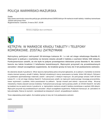 POLICJA WARMIŃSKO-MAZURSKA Źródło: http://www.warminsko-mazurska.policja.gov.pl/ol/aktualnosci/16593,Ketrzyn-W-markecie-kradli-tablety-i-telefony-komorkowe -Zostali-zatrzymani.html Wygenerowano: Czwartek, 9 marca 2017, 02:09 Strona znajduje się w archiwum. KĘTRZYN: W MARKECIE KRADLI TABLETY I TELEFONY KOMÓRKOWE. ZOSTALI ZATRZYMANI Kętrzyńscy policjanci zatrzymali 20-letniego Łukasza M. i o rok od niego młodszego Dawida K. Mężczyźni w jednym z marketów na terenie miasta ukradli 2 tablety o wartości blisko 540 złotych. Funkcjonariusze ustalili, że nie było to jedyne przestępstwo dokonane przez Dawida K. Na swoim koncie ma także kradzież 2 telefonów komórkowych. Mężczyźni przyznali się przedstawionych zarzutów i złożyli szczegółowe wyjaśnienia. Za kradzież grożą im kary do 5 lat pozbawienia wolności. Do zdarzenia doszło 5 grudnia br. Oficer dyżurny kętrzyńskiej policji otrzymał zgłoszenie, że w jednym z marketów na terenie miasta nieznani sprawcy ukradli 2 tablety. Wartość skradzionych rzeczy oszacowano na kwotę blisko 540 złotych. Policjanci na podstawie zgromadzonego materiału ustalili i zatrzymali 2 młodych mężczyzn. Do policyjnego aresztu trafił 20-letni Łukasz M. i o rok od niego młodszy Dawid K. Funkcjonariusze ustalili, że mężczyźni wykorzystując nieuwagę pracowników, towar wyjmowali z pudełek, które pozostawiali na półkach. Sprzęt chowali pod odzież i opuszczali sklep. Wczoraj mieszkańcy miasta usłyszeli zarzuty kradzieży. Funkcjonariusze pracując nad tą sprawą ustalili, że 19-letni Dawid K. nie tylko tą kradzież ma na swoim koncie.1 grudnia br. w kętrzyńskim markecie ukradł 2 telefony komórkowe o wartości 450 złotych. Mężczyźni przyznali się przedstawionych zarzutów i złożyli szczegółowe wyjaśnienia. Podejrzani tłumaczyli, że potrzebne im były pieniądze. Rzeczy te wynosili, i sprzedawali po okazyjnych cenach przypadkowym osobom. Teraz odpowiedzą przed sądem. Za kradzież grożą im kary do 5 lat pozbawienia wolności. md/in Ocena: 0/5 (0) Tweetnij