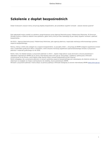 Gmina Dobrcz Szkolenie z dopłat bezpośrednich Dzięki funduszom unijnym rolnicy otrzymują dopłaty bezpośrednie. Jak prawidłowo wypełnić wniosek - zawsze stanowi pytanie? Dziś odpowiedź można znaleźć na szkoleniu zorganizowanym przez Agencję Restrukturyzacji i Modernizacji Rolnictwa. W Gminnym Ośrodku Kultury w Dobrczu właśnie trwa spotkanie, gdzie rolnicy krok po kroku dowiadują się jak należy wypełnić wniosek o płatność bezpośrednią. Od 2015 r. Agencja Restrukturyzacji i Modernizacji Rolnictwa, jako agencja płatnicza, rozpoczęła realizację zreformowanego systemu wsparcia bezpośredniego. Rolnicy, którzy w 2015 roku ubiegali się o wsparcie bezpośrednie, na początku 2016 r., otrzymają od ARiMR wstępnie wypełnione wnioski wraz z materiałem graficznym.Wraz z wnioskiem, rolnik otrzyma instrukcję wypełniania spersonalizowanego wniosku o przyznanie płatności i materiału graficznego na rok 2016. Rolnik, który nie składał wniosku o przyznanie płatności w 2015 r., będzie mógł pobrać czysty formularz w biurze powiatowym i oddziałach regionalnych ARiMR lub ze strony internetowej www.arimr.gov.pl. Korzystając z platformy aplikacyjnej e-Wniosek umieszczonej na tej stronie, rolnik będzie mógł również złożyć wniosek bezpośrednio przez Internet. Rolnik ubiegający się o przyznanie płatności w ramach systemów wsparcia bezpośredniego jest zobowiązany do złożenia wniosku we właściwym ze względu na miejsce zamieszkania lub siedzibę, biurze powiatowym ARiMR. Wniosek o przyznanie płatności można złożyć za pomocą aplikacji e-Wniosek dostępnej na stronie internetowej ARiMR www.arimr.gov.pl. 1