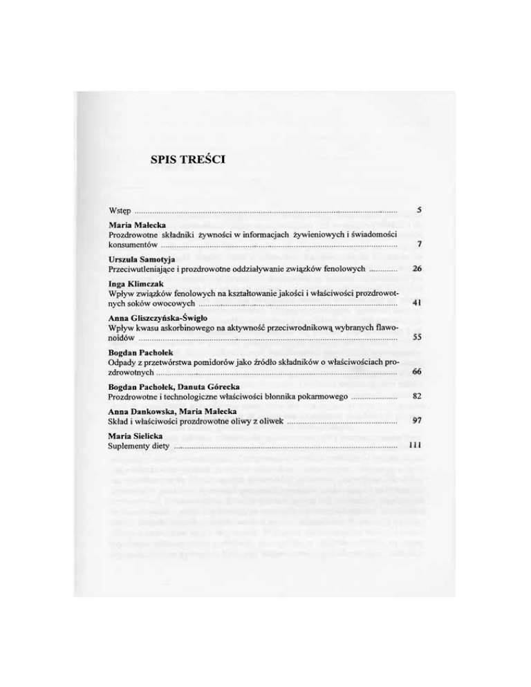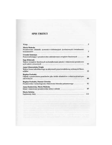 SPIS TREŚCI Wstęp 5 Maria Małecka Prozdrowotne składniki żywności w informacjach żywieniowych i świadomości konsumentów 7 Urszula Samotyja Przeciwutleniające i prozdrowotne oddziaływanie związków fenolowych 26 Inga Klimczak Wpływ związków fenolowych na kształtowanie jakości i właściwości prozdrowotnych soków owocowych 41 Anna Gliszczyńska-Świgło Wpływ kwasu askorbinowego na aktywność przeciwrodnikową wybranych flawonoidów 55 Bogdan Pachołek Odpady z przetwórstwa pomidorów jako źródło składników o właściwościach prozdrowotnych 66 Bogdan Pachołek, Danuta Górecka Prozdrowotne i technologiczne właściwości błonnika pokarmowego 82 Anna Dankowska, Maria Małecka Skład i właściwości prozdrowotne oliwy z oliwek 97 Maria Sielicka Suplementy diety 111