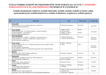 WYKAZ PODRĘCZNIKÓW DO PRZEDMIOTÓW OGÓLNOKSZTAŁCĄCYCH NA POZIOMIE PODSTAWOWYM W KLASIE PIERWSZEJ TECHNIKUM W ZAWODACH : technik mechanizacji rolnictwa, technik elektronik, technik awionik, technik żywienia i usług gastronomicznych, technik hotelarstwa, technik architektury krajobrazu, technik spedytor Lp. 1. 2 3. 4. 5. 6. 7. 8. 9. Podręcznik Autor Wydawnictwo Język polski Ponad słowami . kl.I ,cz.I .Zakres podstawowy i rozszerzony do nowej podstawy programowej M. Chmiel, E. Kostrzewa Nowa Era Język angielski Grupa zaawansowana - New Matura Solutions – poziom elementary Grupa początkująca - New Horizons 1 do nowej podstawy programowej T. Falla, P. Davies, M. Wieruszewska P. Radley, D. Sinson, M. Wieruszewska Oxford Grupa zaawansowana – Welttour – Podręcznik z zeszytem ćwiczeń. – 2 Grupa podstawowa - Welttour – Podręcznik z zeszytem ćwiczeń – 1 do nowej podstawy programowej S. Mróz-Dwornikowska, U. Górecka, K.Szachowska Nowa Era Język rosyjski Grupa początkująca -Wot i my 1. Podręcznik z płytą CD, Język rosyjski do szkół ponadgimnazjalnych do nowej podstawy programowej Grupa podstawowa- Wot i my 2 Podręcznik z płytą CD, Język rosyjski dla szkół ponadgimnazjalnych. HistoriaPoznać przeszłość. Wiek XX Zakres podstawowy do nowej podstawy programowej Matematyka Matematyka w otaczającym nas świecie. Zakres podstawowy do nowej podstawy programowej Fizyka Odkryć fizykę . Zakres podstawowy do nowej podstawy programowej Chemia To jest chemia. Zakres podstawowy do nowej podstawy programowej Biologia Biologia na czasie .Zakres podstawowy. Karty pracy ucznia. Zakres podstawowy do nowej podstawy programowej M. Wiatr – Kmieciak S. Wujec Język niemiecki Oxford Nr ewidencyjny 425/1/2012 297/1/2010 459/2/2012 459/1/2012 PWN 324/1/2011 324/2/2012 S. Roszak, J. Kłaczkow Nowa Era 2012 A. Cewa, M. Krawczyk, M. Kruk. H. Nachorska Podkowa 549/1/2012 M. Braun, W. Śliwa Nowa Era 447/2012 R. Hussa, A. Mrzigod, J. Mrzigod Nowa Era E. Bonar, W. Krzeszowiec-Jeleń, Nowa Era S. Czachorowski J. Pawłowski, J. Holeczek 438/2012 450/2012 10. Geografia Oblicza geografii . Zakres podstawowy do nowej podstawy programowej 11. Informatyka Informatyka nie tylko dla uczniów . Zakres podstawowy do nowej podstawy programowej 12. Edukacja dla bezpieczeństwa Żyję i działam bezpiecznie. do nowej podstawy programowej R. Uliszak, K. Wiedermann Nowa Era 433/2012 E. Krawczyński, Z. Talaga, M. Wilk PWN J. Słoma Nowa Era 13. Wiedza o społeczeństwie Ciekawi świata. Zakres podstawowy do nowej podstawy programowej M. Batorski Operon 14. Wiedza o kulturze Spotkanie z kulturą. do nowej podstawy programowej M. Bokiniec B. Forysiewicz J. Michałowski Nowa Era 15. Religia Moje miejsce w Kościele. AZ-41-01/10-PO-1/11 (5 działów) do nowej podstawy programowej- zgodny z programem nauczania AZ-4-01/10 Ks.J. Szpet, D. Jackowiak Św. Wojciech 414/2012 426/2012 2012 449/2012 2011 WYKAZ PODRĘCZNIKÓW DO PRZEDMIOTÓW ZAWODOWYCH W KLASIE PIERWSZEJ TECHNIKUM W ZAWODACH: technik mechanizacji rolnictwa 1. 2. 3. 4. Przepisy ruchu drogowego (1 godz.) Kodeks drogowy – aktualny, materiały własne Podręcznik kierowcy kategorii T Podstawy techniki (2 godz.) Podstawy techniki Użytkowanie maszyn i pojazdów rolniczych (2 godz.) Maszyny rolnicze do produkcji roślinnej- cz. I Pojazdy rolnicze. Zajęcia praktyczne (6 godz.) Materiały własne. Podręcznik niewymagany. Karty pracy. W. Kędziora SPH Credo 01/2013 A .Lisowski Rea 01/2008 Cz. Waszkiewicz, J. Kuczewski A .Skrobacki WSiP WSiP 16/1995 technik awionik 1. 2. 3. 4. 5. Podstawy elektrotechniki (2 godz.) Podstawy elektroniki Podstawy elektroniki (2 godz.) Podstawy elektroniki Materiałoznawstwo (1 godz.) Materiały i wyroby metalowe. Pracownia elektroniki i technik pomiarowych (4 godz.) Podstawy elektroniki Zajęcia praktyczne (2 godz.) Podstawy ślusarstwa. Materiały własne. E. Dekler i inni Rea E. Dekler i inni Rea J. Godzimirski WAT E. Dekler i inni Rea A.Kosiński WSiP E. Dehler i inni Rea Z. Celiński E. Dehler i inni WSiP Rea J. Długokęcka, S. Chadaj WSiP Sebastian Chadaj WSiP 23/2005 23/2005 23/2005 technik elektronik 1. 2. 3. 4. Podstawy elektrotechniki (2 godz.) Podstawy elektroniki Materiałoznawstwo (2 godz.) Materiałoznawstwo w elektronice Laboratorium elektrotechniczne (6 godz.) Podstawy elektroniki Język obcy zawodowy (1 godz.) Język niemiecki. Podręcznik J. niemiecki zawodowy w branży elektronicznej, informatycznej i elektrycznej Język angielski. Podręcznik J. angielski zawodowy w branży elektronicznej, informatycznej i elektrycznej 23/2005 14/2007 23/2005 2012 2013 technik hotelarstwa 1. 2. 3. 4. Organizacja pracy w hotelarstwie (4 godz.) Hotelarstwo – organizacja i technika pracy. Podstawy prawa w działalności hotelarskiej (2 godz.) Ekonomia i prawo w hotelarstwie Obsługa informatyczna w hotelarstwie (4 godz.) Obsługa informatyczna w hotelarstwie + CD - ROM Język obcy zawodowy (1 godz.) Język niemiecki. Podręcznik Język niemiecki zawodowy w branży turystyczno - hotelarskiej Język angielski Podręcznik Język angielski zawodowy w branży turystyczno - hotelarskiej D.Koniuszewska, E. Mitura Difin 25/2007 R. Tyliński, M. Wajgner Rea M. Milewska, A. Stasiak WSiP P. Chomicki M. Samulczyk -Wolska WSiP WSiP 2013 2013 A. Kmiołek WSiP 8/2010 E. Superczyńska, M. Żylińska Kaczmarek eMP i2 22/2007 2012 technik żywienia i usług gastronomicznych 1. 2. Technologia gastronomiczna (4 godz.) Technologia gastronomiczna cz. I i II Zajęcia praktyczne – sporządzanie potraw i napojów (7 godz.) Technologia gastronomiczna z towaroznawstwem w pytaniach i zadaniach cz. I, technik architektury krajobrazu 1. 2. 3. 4. 5. Podstawy architektury krajobrazu (1 godz.) Podstawy architektury krajobrazu. Cz.II E. Gadomska, A. Różańska, D Sikora Hortpress Rośliny ozdobne w architekturze krajobrazu (4 godz.) Rośliny ozdobne w architekturze krajobrazu. Cz. I E. Gadomska, P. Sikorski, W. Smogorzewska Hortpress Przepisy r