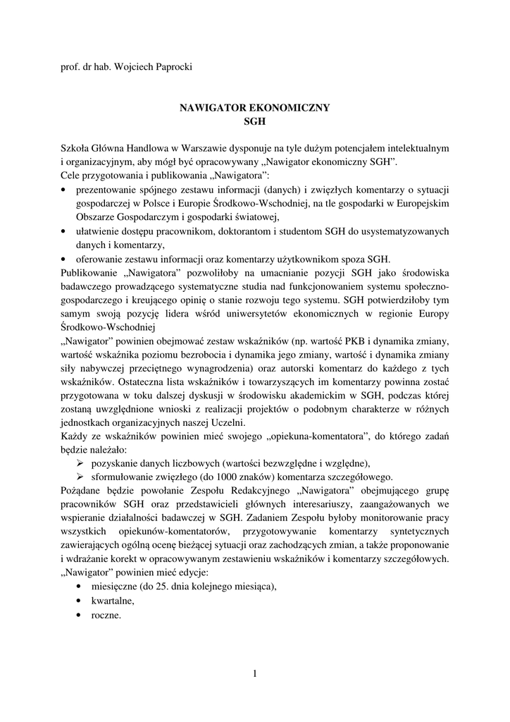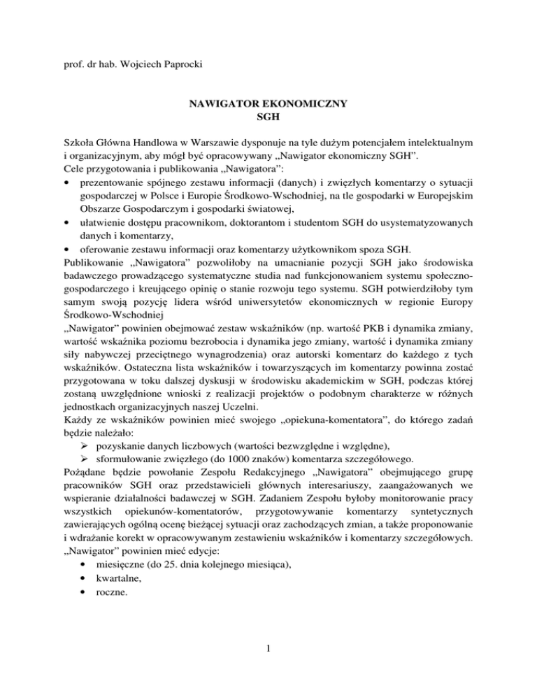prof. dr hab. Wojciech Paprocki NAWIGATOR EKONOMICZNY SGH Szkoła Główna Handlowa w Warszawie dysponuje na tyle dużym potencjałem intelektualnym i organizacyjnym, aby mógł być opracowywany „Nawigator ekonomiczny SGH”. Cele przygotowania i publikowania „Nawigatora”: • prezentowanie spójnego zestawu informacji (danych) i zwięzłych komentarzy o sytuacji gospodarczej w Polsce i Europie Środkowo-Wschodniej, na tle gospodarki w Europejskim Obszarze Gospodarczym i gospodarki światowej, • ułatwienie dostępu pracownikom, doktorantom i studentom SGH do usystematyzowanych danych i komentarzy, • oferowanie zestawu informacji oraz komentarzy użytkownikom spoza SGH. Publikowanie „Nawigatora” pozwoliłoby na umacnianie pozycji SGH jako środowiska badawczego prowadzącego systematyczne studia nad funkcjonowaniem systemu społecznogospodarczego i kreującego opinię o stanie rozwoju tego systemu. SGH potwierdziłoby tym samym swoją pozycję lidera wśród uniwersytetów ekonomicznych w regionie Europy Środkowo-Wschodniej „Nawigator” powinien obejmować zestaw wskaźników (np. wartość PKB i dynamika zmiany, wartość wskaźnika poziomu bezrobocia i dynamika jego zmiany, wartość i dynamika zmiany siły nabywczej przeciętnego wynagrodzenia) oraz autorski komentarz do każdego z tych wskaźników. Ostateczna lista wskaźników i towarzyszących im komentarzy powinna zostać przygotowana w toku dalszej dyskusji w środowisku akademickim w SGH, podczas której zostaną uwzględnione wnioski z realizacji projektów o podobnym charakterze w różnych jednostkach organizacyjnych naszej Uczelni. Każdy ze wskaźników powinien mieć swojego „opiekuna-komentatora”, do którego zadań będzie należało: pozyskanie danych liczbowych (wartości bezwzględne i względne), sformułowanie zwięzłego (do 1000 znaków) komentarza szczegółowego. Pożądane będzie powołanie Zespołu Redakcyjnego „Nawigatora” obejmującego grupę pracowników SGH oraz przedstawicieli głównych interesariuszy, zaangażowanych we wspieranie działalności badawczej w SGH. Zadaniem Zespołu byłoby monitorowanie pracy wszystkich opiekunów-komentatorów, przygotowywanie komentarzy syntetycznych zawierających ogólną ocenę bieżącej sytuacji oraz zachodzących zmian, a także proponowanie i wdrażanie korekt w opracowywanym zestawieniu wskaźników i komentarzy szczegółowych. „Nawigator” powinien mieć edycje: • miesięczne (do 25. dnia kolejnego miesiąca), • kwartalne, • roczne. 1 Zespół Redakcyjny mógłby inicjować wydania specjalne „Nawigatora”, jeśli zachodziłyby ku temu szczególne okoliczności, np. wystąpienie załamania na giełdach światowych lub wybuch konfliktu międzynarodowego. Treść edycji „Nawigatora” publikowanej po zakończeniu roku powinna być przedmiotem dyskusji z udziałem pracowników SGH i wybranych przedstawicieli interesariuszy, być może także z udziałem partnerów zagranicznych. Relacjonowanie dyskusji w formie videokonferencji i zapewnienie dostępu do tej relacji w Internecie zarówno online, jak i ex post, służyłoby upowszechnianiu wiedzy wewnątrz środowiska SGH, w tym wśród zagranicznych studentów i doktorantów, a także na zewnątrz przyczyniając się do upowszechniania informacji o kompetencji i dorobku SGH. Pełna treść „Nawigatora ekonomicznego SGH” byłaby udostępniana przez Internet w formule otwartej dla społeczności akademickiej (zarówno SGH, jak i z innych uczelni w kraju i za granicą) w wersjach polskiej i angielskiej. Pożądane byłoby doprowadzenie do sytuacji, w której dostęp do „Nawigatora” byłby możliwy także w formule komercyjnej. Po pewnym okresie (np. dwunastu miesięcy) redagowania „Nawigatora” i po upewnieniu się, że ta forma upubliczniania kompetencji SGH znalazła akceptację w szerszym gronie odbiorców w kraju i za granicą, podmioty gospodarcze, w tym różne zespoły profesjonalnych konsultantów, mogłyby partycypować w kosztach opracowywania „Nawigatora”. Wojciech Paprocki Warszawa, 20 listopada 2015 r. 2