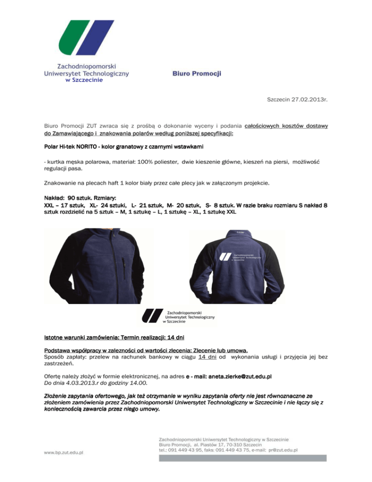 w Szczecinie Szczecin 27.02.2013r. Biuro Promocji ZUT zwraca się z prośbą o dokonanie wyceny i podania całościowych kosztów dostawy do Zamawiającego i znakowania polarów według poniższej specyfikacji: Polar HiHi-tek NORITO - kolor granatowy z czarnymi wstawkami wstawkami - kurtka męska polarowa, materiał: 100% poliester, dwie kieszenie główne, kieszeń na piersi, możliwość regulacji pasa. Znakowanie na plecach haft 1 kolor biały przez całe plecy jak w załączonym projekcie. Nakład: 90 sztuk. Rzmiary: XXL – 17 sztuk, sztuk, XLXL- 24 sztuki, sztuki, L- 21 sztuk, sztuk, M- 20 sztuk, sztuk, S- 8 sztuk. sztuk. W razie braku rozmiaru S nakład 8 sztuk rozdzielić na 5 sztuk – M, 1 sztukę – L, 1 sztukę – XL, 1 sztukę XXL Istotne warunki zamówienia: Termin realizacji realizacji: 14 dni Podstawa współpracy w zalezności od wartości zlecenia: zlecenia: Zlecenie lub umowa. Sposób zapłaty: przelew na rachunek bankowy w ciągu 14 dni od wykonania usługi i przyjęcia jej bez zastrzeżeń. Ofertę należy złożyć w formie elektronicznej, na adres e - mail: [email protected] Do dnia 4.03.2013.r do godziny 14.00. Złożenie zapytania ofertowego, jak też otrzymanie w wyniku zapytania oferty nie jest jest równoznaczne ze złożeniem zamówienia przez Zachodniopomorski Uniwersytet Technologiczny w Szczecinie i nie łączy się z koniecznością zawarcia przez niego umowy.