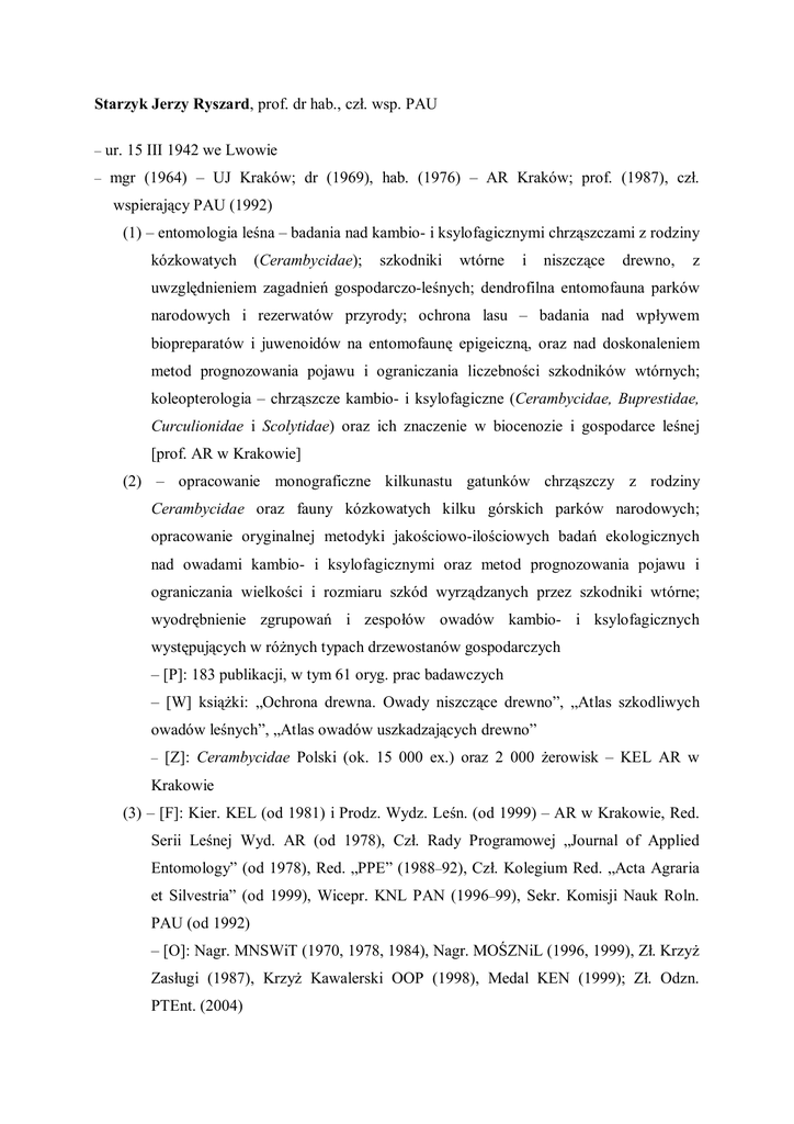 Starzyk Jerzy Ryszard, prof. dr hab., czł. wsp. PAU – ur. 15 III 1942 we Lwowie – mgr (1964) – UJ Kraków; dr (1969), hab. (1976) – AR Kraków; prof. (1987), czł. wspierający PAU (1992) (1) – entomologia leśna – badania nad kambio- i ksylofagicznymi chrząszczami z rodziny kózkowatych (Cerambycidae); szkodniki wtórne i niszczące drewno, z uwzględnieniem zagadnień gospodarczo-leśnych; dendrofilna entomofauna parków narodowych i rezerwatów przyrody; ochrona lasu – badania nad wpływem biopreparatów i juwenoidów na entomofaunę epigeiczną, oraz nad doskonaleniem metod prognozowania pojawu i ograniczania liczebności szkodników wtórnych; koleopterologia – chrząszcze kambio- i ksylofagiczne (Cerambycidae, Buprestidae, Curculionidae i Scolytidae) oraz ich znaczenie w biocenozie i gospodarce leśnej [prof. AR w Krakowie] (2) – opracowanie monograficzne kilkunastu gatunków chrząszczy z rodziny Cerambycidae oraz fauny kózkowatych kilku górskich parków narodowych; opracowanie oryginalnej metodyki jakościowo-ilościowych badań ekologicznych nad owadami kambio- i ksylofagicznymi oraz metod prognozowania pojawu i ograniczania wielkości i rozmiaru szkód wyrządzanych przez szkodniki wtórne; wyodrębnienie zgrupowań i zespołów owadów kambio- i ksylofagicznych występujących w różnych typach drzewostanów gospodarczych – [P]: 183 publikacji, w tym 61 oryg. prac badawczych – [W] książki: „Ochrona drewna. Owady niszczące drewno”, „Atlas szkodliwych owadów leśnych”, „Atlas owadów uszkadzających drewno” – [Z]: Cerambycidae Polski (ok. 15 000 ex.) oraz 2 000 żerowisk – KEL AR w Krakowie (3) – [F]: Kier. KEL (od 1981) i Prodz. Wydz. Leśn. (od 1999) – AR w Krakowie, Red. Serii Leśnej Wyd. AR (od 1978), Czł. Rady Programowej „Journal of Applied Entomology” (od 1978), Red. „PPE” (1988–92), Czł. Kolegium Red. „Acta Agraria et Silvestria” (od 1999), Wicepr. KNL PAN (1996–99), Sekr. Komisji Nauk Roln. PAU (od 1992) – [O]: Nagr. MNSWiT (1970, 1978, 1984), Nagr. MOŚZNiL (1996, 1999), Zł. Krzyż Zasługi (1987), Krzyż Kawalerski OOP (1998), Medal KEN (1999); Zł. Odzn. PTEnt. (2004) (a)