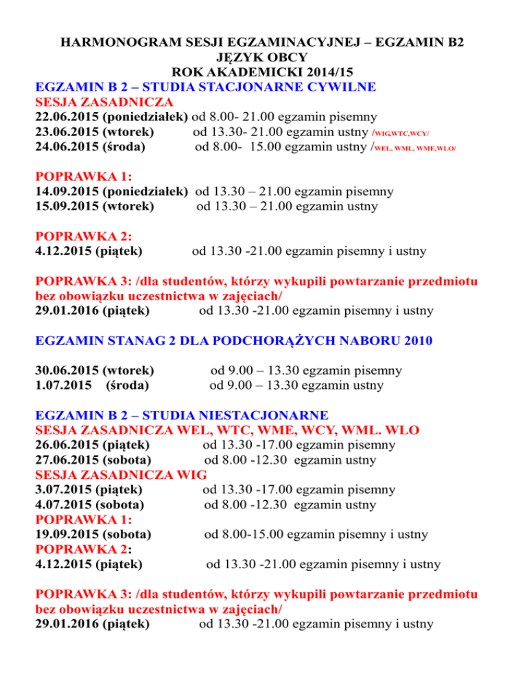 HARMONOGRAM SESJI EGZAMINACYJNEJ – EGZAMIN B2 JĘZYK OBCY ROK AKADEMICKI 2014/15 EGZAMIN B 2 – STUDIA STACJONARNE CYWILNE SESJA ZASADNICZA 22.06.2015 (poniedziałek) od 8.00- 21.00 egzamin pisemny 23.06.2015 (wtorek) od 13.30- 21.00 egzamin ustny /WIG,WTC,WCY/ 24.06.2015 (środa) od 8.00- 15.00 egzamin ustny /WEL, WML, WME,WLO/ POPRAWKA 1: 14.09.2015 (poniedziałek) od 13.30 – 21.00 egzamin pisemny 15.09.2015 (wtorek) od 13.30 – 21.00 egzamin ustny POPRAWKA 2: 4.12.2015 (piątek) od 13.30 -21.00 egzamin pisemny i ustny POPRAWKA 3: /dla studentów, którzy wykupili powtarzanie przedmiotu bez obowiązku uczestnictwa w zajęciach/ 29.01.2016 (piątek) od 13.30 -21.00 egzamin pisemny i ustny EGZAMIN STANAG 2 DLA PODCHORĄŻYCH NABORU 2010 30.06.2015 (wtorek) 1.07.2015 (środa) od 9.00 – 13.30 egzamin pisemny od 9.00 – 13.30 egzamin ustny EGZAMIN B 2 – STUDIA NIESTACJONARNE SESJA ZASADNICZA WEL, WTC, WME, WCY, WML. WLO 26.06.2015 (piątek) od 13.30 -17.00 egzamin pisemny 27.06.2015 (sobota) od 8.00 -12.30 egzamin ustny SESJA ZASADNICZA WIG 3.07.2015 (piątek) od 13.30 -17.00 egzamin pisemny 4.07.2015 (sobota) od 8.00 -12.30 egzamin ustny POPRAWKA 1: 19.09.2015 (sobota) od 8.00-15.00 egzamin pisemny i ustny POPRAWKA 2: 4.12.2015 (piątek) od 13.30 -21.00 egzamin pisemny i ustny POPRAWKA 3: /dla studentów, którzy wykupili powtarzanie przedmiotu bez obowiązku uczestnictwa w zajęciach/ 29.01.2016 (piątek) od 13.30 -21.00 egzamin pisemny i ustny