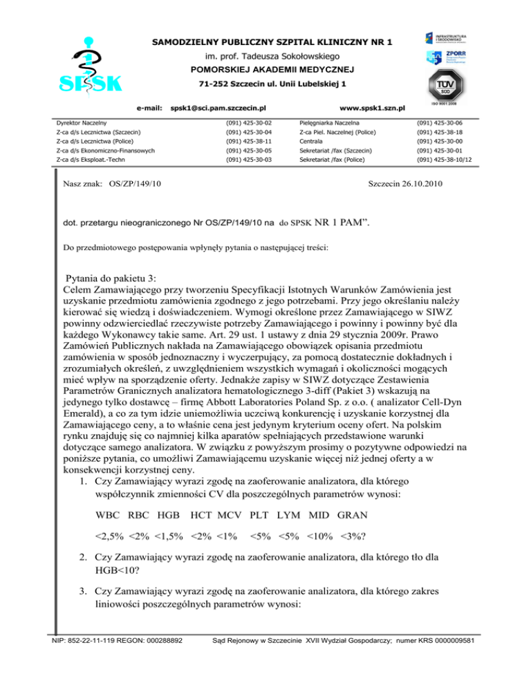 Pytania do pakietu 3 - Samodzielny Publiczny Szpital Kliniczny Nr 1