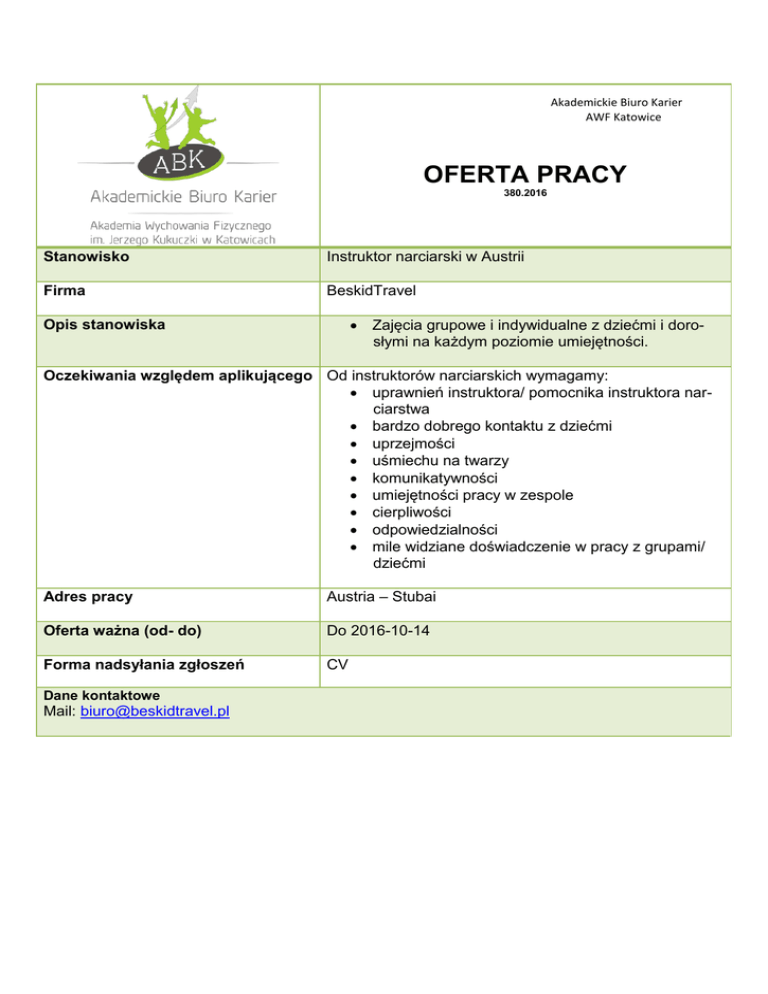 Akademickie Biuro Karier AWF Katowice OFERTA PRACY 380.2016 Stanowisko Instruktor narciarski w Austrii Firma BeskidTravel Zajęcia grupowe i indywidualne z dziećmi i dorosłymi na każdym poziomie umiejętności. Opis stanowiska Oczekiwania względem aplikującego Od instruktorów narciarskich wymagamy: uprawnień instruktora/ pomocnika instruktora narciarstwa bardzo dobrego kontaktu z dziećmi uprzejmości uśmiechu na twarzy komunikatywności umiejętności pracy w zespole cierpliwości odpowiedzialności mile widziane doświadczenie w pracy z grupami/ dziećmi Adres pracy Austria – Stubai Oferta ważna (od- do) Do 2016-10-14 Forma nadsyłania zgłoszeń CV Dane kontaktowe Mail: [email protected]