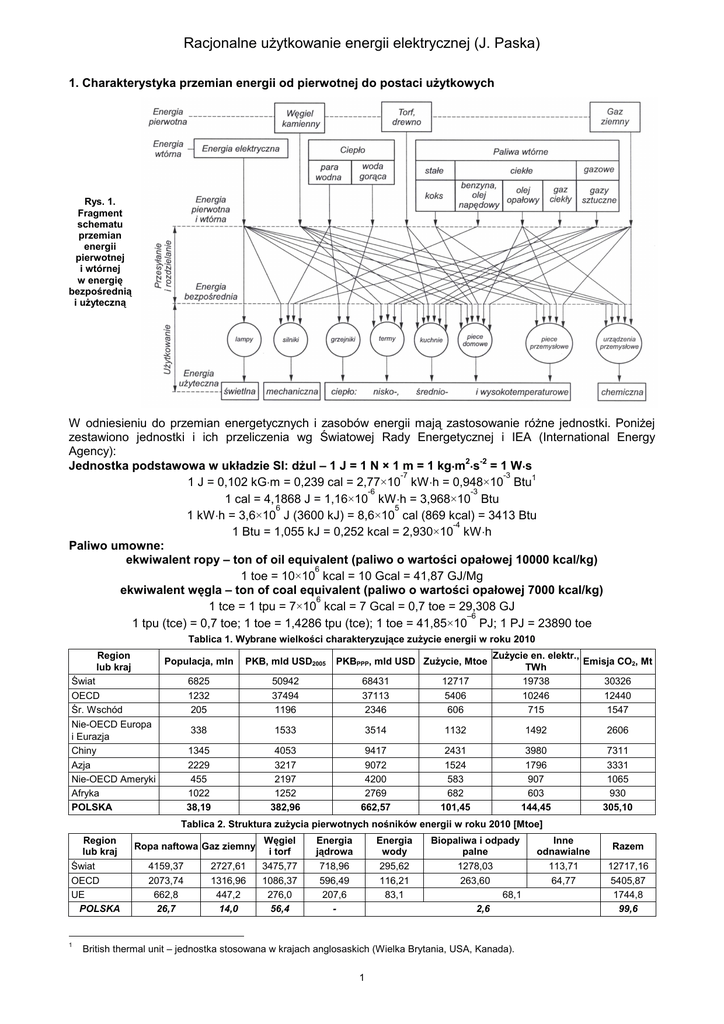 Racjonalne użytkowanie energii elektrycznej (J. Paska) 1. Charakterystyka przemian energii od pierwotnej do postaci użytkowych Rys. 1. Fragment schematu przemian energii pierwotnej i wtórnej w energię bezpośrednią i użyteczną W odniesieniu do przemian energetycznych i zasobów energii mają zastosowanie różne jednostki. Poniżej zestawiono jednostki i ich przeliczenia wg Światowej Rady Energetycznej i IEA (International Energy Agency): 2 -2 Jednostka podstawowa w układzie SI: dżul – 1 J = 1 N × 1 m = 1 kg⋅⋅m ⋅s = 1 W⋅⋅s -7 -3 1 1 J = 0,102 kG⋅m = 0,239 cal = 2,77×10 kW⋅h = 0,948×10 Btu -6 -3 1 cal = 4,1868 J = 1,16×10 kW⋅h = 3,968×10 Btu 6 5 1 kW⋅h = 3,6×10 J (3600 kJ) = 8,6×10 cal (869 kcal) = 3413 Btu -4 1 Btu = 1,055 kJ = 0,252 kcal = 2,930×10 kW⋅h Paliwo umowne: ekwiwalent ropy – ton of oil equivalent (paliwo o wartości opałowej 10000 kcal/kg) 6 1 toe = 10×10 kcal = 10 Gcal = 41,87 GJ/Mg ekwiwalent węgla – ton of coal equivalent (paliwo o wartości opałowej 7000 kcal/kg) 6 1 tce = 1 tpu = 7×10 kcal = 7 Gcal = 0,7 toe = 29,308 GJ –6 1 tpu (tce) = 0,7 toe; 1 toe = 1,4286 tpu (tce); 1 toe = 41,85×10 PJ; 1 PJ = 23890 toe Tablica 1. Wybrane wielkości charakteryzujące zużycie energii w roku 2010 Region lub kraj PKB, mld USD2005 6825 1232 205 50942 37494 1196 68431 37113 2346 12717 5406 606 338 1533 3514 1132 1492 2606 1345 2229 455 1022 38,19 4053 3217 2197 1252 382,96 9417 9072 4200 2769 662,57 2431 1524 583 682 101,45 3980 1796 907 603 144,45 7311 3331 1065 930 305,10 Świat OECD Śr. Wschód Nie-OECD Europa i Eurazja Chiny Azja Nie-OECD Ameryki Afryka POLSKA PKBPPP, mld USD Zużycie, Mtoe Zużycie en. elektr., Emisja CO2, Mt TWh 19738 30326 10246 12440 715 1547 Populacja, mln Tablica 2. Struktura zużycia pierwotnych nośników energii w roku 2010 [Mtoe] Region lub kraj Świat OECD UE POLSKA 1 Ropa naftowa Gaz ziemny 4159,37 2073,74 662,8 26,7 2727,61 1316,96 447,2 14,0 Węgiel i torf 3475,77 1086,37 276,0 56,4 Energia jądrowa 718,96 596,49 207,6 - Energia wody 295,62 116,21 83,1 Biopaliwa i odpady palne 1278,03 263,60 68,1 2,6 British thermal unit – jednostka stosowana w krajach anglosaskich (Wielka Brytania, USA, Kanada). 1 Inne odnawialne 113,71 64,77 Razem 12717,16 5405,87 1744,8 99,6 Racjonalne użytkowanie energii elektrycznej (J. Paska) Rys. 2. Struktura zużycia pierwotnych nośników energii i zużycia finalnego na świecie Rys. 3. Prognoza wielkości i struktury zużycia pierwotnych nośników energii na świecie Rys. 4. Struktura produkcji i zużycia energii elektrycznej na świecie 2 Racjonalne użytkowanie energii elektrycznej (J. Paska) 2. Syntetyczny bilans energii elektrycznej Polski Rys. 5. Struktura finalnego zużycia energii w Polsce wg nośników Rys. 6. Struktura finalnego zużycia energii w Polsce wg sektorów ENERGA SA PAK SA ENEA SA Wytwarzanie El. Kozienice Wytwarzanie Wytwarzanie El. PAK, El. Pątnów 2 El. Ostrołęka, EC Elbląg 2457 MW, 11,2 TWh Moc: 1151 MW ENERGA Moc: 3109 MW Dolna Odra ENEA SA Sprzedaż: 14,3 TWh Produkcja: 4,7 TWh ENERGA PAK (50%) Produkcja: 12,6 TWh ENERGA Obrót SA Ostrołęka Brunatnego ENEA PGE ENEA El. Kozienice Tauron Polska Energia Sprzedaż: 18,6 TWh Z. El. Ostrołęka PGE Polska Grupa Energetyczna SA Wytwarzanie PGE PAK SA RWE Wytwarzanie PKE (El. Łagisza, El. Jaworzno II & III, El. Siersza, El. Łaziska, El. Halemba, El. Blachownia, EC Katowice, EC Bielsko-Biała) Ł -2 Turów Energia Energia Pro (WGE) Opole PKE PKE RZE Jaworzno Łaziska Sprzedaż: 36,6 TWh Stalowa Wola Energetyka Siersza Enion Energia ProGigawat, Enion EC Bydgoszcz EC Rzeszów, EC Lublin Wrotków, EC Gorzów Łagisza Moc: 5574 MW Dystrybucja L -5 Kozienice Łódź Teren Bełchatów Pro El. Stalowa Wola Produkcja: 24,0 TWh El. Bełchatów, El. Opole, El. Turów, El. Dolna Odra (BOT) ŁZE Podkarpacka Enion Moc: 13002 MW Produkcja: 61,7 TWh Dystrybucja ŁZE, ZEŁT, RZE, LZE, ZEORK ZEB, ZKE, ZEW-T Tauron D. GZE SA Przesył Sprzedaż: 30,4 TWh PSE Operator SA Sieć przesyłowa Sieci 220 kV, 400 kV, 750 kV Rys. 7. Obecna (w 2011 r.) struktura polskiego sektora elektroenergetycznego (po konsolidacji) 3 Racjonalne użytkowanie energii elektrycznej (J. Paska) Elektrownie zawodowe wodne 2 529 Elektrownie zawodowe cieplne na węgiel kamienny 90 811 Elektrownie zaw. cieplne na węgiel brunatny 53 623 Elektrownie zaw. cieplne: gaz 4 355, współspalanie 4985 Elektrownie przemysłowe 9 000 El. zaw. cieplne 148 790 Elektrownie pozostałe 2 833* Elektrownie zawodowe 151 319 Produkcja krajowa brutto 163 153 Wpłynęło z zagranicy 1 743 Produkcja krajowa netto 137 889 Produkcja użyteczna (netto) 135 095 Energia wprowadzona do sieci 132 904 Wypłynęło za granicę 3 097 Zużycie krajowe netto 120 371 Sprzedaż z sieci odbiorcom krajowym 112 843 Zużycie na potrzeby własne 13 831 Zużycie na pompowanie 881 w elektrowniach Sprzedaż bezpośrednio odbiorcom 1 913 Straty i różnica bilansowa w KSE 12 533 Przemysł z własnej produkcji 5 295 Odbiorcy na WN 22 394 Odbiorcy na nN 52 330 Odbiorcy na SN 38 119 Rys. 8. Bilans energii elektrycznej Polski w 2011 r. (GWh): (x) – dane z lat wcześniejszych, (x)* – elektrownie wiatrowe i inne odnawialne 3. Elektrochłonność gospodarki polskiej na tle innych krajów Tablica 3. Energochłonność i elektrochłonność gospodarki Polski Rok 2006 2010 2015 2020 2025 2030 Energochłonność, toe/mln zł’07 89,4 73,1 56,7 46,6 36,6 33,0 Elektrochłonność, MWh/mln zł’07 137,7 110,4 90,4 77,8 67,8 60,6 4 Racjonalne użytkowanie energii elektrycznej (J. Paska) Tablica 4. Wybrane wskaźniki jednostkowe charakteryzujące zużycie energii w roku 2010 Region lub kraj Świat OECD Śr. Wschód Nie-OECD Europa i Eurazja Chiny Azja Nie-OECD Ameryki Afryka POLSKA M - mieszkaniec Emisja CO2, t kg kg CO2/M CO2/USD CO2/USDPPP 4,44 0,60 0,44 10,10 0,33 0,34 7,56 1,29 0,66 Zużycie, toe/M Zużycie/PKB, toe/1000 USD Zużycie/PKBPPP, toe/1000 USD Zużycie en. elektr., kWh/M 1,86 4,39 2,96