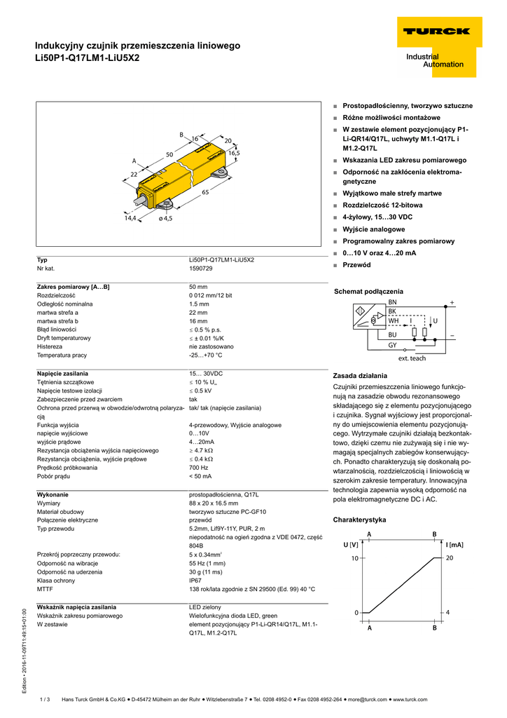 Indukcyjny czujnik przemieszczenia liniowego Li50P1-Q17LM1-LiU5X2 ■ Prostopadłościenny, tworzywo sztuczne ■ Różne możliwości montażowe ■ W zestawie element pozycjonujący P1Li-QR14/Q17L, uchwyty M1.1-Q17L i M1.2-Q17L ■ Wskazania LED zakresu pomiarowego ■ Odporność na zakłócenia elektromagnetyczne ■ Wyjątkowo małe strefy martwe ■ Rozdzielczość 12-bitowa ■ 4-żyłowy, 15…30 VDC ■ Wyjście analogowe ■ Programowalny zakres pomiarowy Typ Nr kat. Li50P1-Q17LM1-LiU5X2 1590729 Zakres pomiarowy [A…B] Rozdzielczość Odległość nominalna martwa strefa a martwa strefa b Błąd liniowości Dryft temperaturowy Histereza Temperatura pracy 50 mm 0 012 mm/12 bit 1.5 mm 22 mm 16 mm ð 0.5 % p.s. ð ± 0.01 %/K nie zastosowano -25…+70 °C Napięcie zasilania Tętnienia szczątkowe Napięcie testowe izolacji Zabezpieczenie przed zwarciem Ochrona przed przerwą w obwodzie/odwrotną polaryzacją Funkcja wyjścia napięcie wyjściowe wyjście prądowe Rezystancja obciążenia wyjścia napięciowego Rezystancja obciążenia, wyjście prądowe Prędkość próbkowania Pobór prądu 15… 30VDC ð 10 % Uss ð 0.5 kV tak tak/ tak (napięcie zasilania) Wykonanie Wymiary Materiał obudowy Połączenie elektryczne Typ przewodu prostopadłościenna, Q17L 88 x 20 x 16.5 mm tworzywo sztuczne PC-GF10 przewód 5.2mm, Lif9Y-11Y, PUR, 2 m niepodatność na ogień zgodna z VDE 0472, część 804B Przekrój poprzeczny przewodu: 5 x 0.34mm 55 Hz (1 mm) 30 g (11 ms) IP67 138 rok/lata zgodnie z SN 29500 (Ed. 99) 40 °C Edition • 2016-11-09T11:49:15+01:00 Odporność na wibracje Odporność na uderzenia Klasa ochrony MTTF Wskaźnik napięcia zasilania Wskaźnik zakresu pomiarowego W zestawie 1/3 4-przewodowy, Wyjście analogowe 0…10V 4…20mA ï 4.7 kò ð 0.4 kò 700 Hz < 50 mA ■ 0…10 V oraz 4…20 mA ■ Przewód Schemat podłączenia Zasada działania Czujniki przemieszczenia liniowego funkcjonują na zasadzie obwodu rezonansowego składającego się z elementu pozycjonującego i czujnika. Sygnał wyjściowy jest proporcjonalny do umiejscowienia elementu pozycjonującego. Wytrzymałe czujniki działają bezkontaktowo, dzięki czemu nie zużywają się i nie wymagają specjalnych zabiegów konserwujących. Ponadto charakteryzują się doskonałą powtarzalnością, rozdzielczością i liniowością w szerokim zakresie temperatury. Innowacyjna technologia zapewnia wysoką odporność na pola elektromagnetyczne DC i AC. Charakterystyka 2 LED zielony Wielofunkcyjna dioda LED, green element pozycjonujący P1-Li-QR14/Q17L, M1.1Q17L, M1.2-Q17L Hans Turck GmbH & Co.KG ñ D-45472 Mülheim an der Ruhr ñ Witzlebenstraße 7 ñ Tel. 0208 4952-0 ñ Fax 0208 4952-264 ñ [email protected] ñ www.turck.com Indukcyjny czujnik przemieszczenia liniowego Li50P1-Q17LM1-LiU5X2 Instrukcja montażu / Opis Szeroki wybór akcesoriów zapewniający różne możliwości instalacji. Element pozycjonujący może być instalowane z przesunięciem 90°. Zapewnia najwyższą elastyczność instalacji. Czujniki przemieszczenia liniowego mogą być instalowane z przesunięciem 90° na dwa możliwe sposoby. Praca w oparciu o zasadę oddziaływania obwodów RLC, czyni czujnik odpornym na namagnesowane opiłki metali czy inne zakłócenia. Wskazania LED stanu: Zielona: Czujnik poprawnie zasilony Wskazania LED zakresu pomiarowego Zielona: Element pozycjonujący jest w zakresie pomiarowym Zielona migająca: Element pozycjonujący w zakresie pomiarowym, sygnał niski (np. za duża odległość) Dioda LED wyłączona: Element pozycjonujący poza zakresem Uczenie Punkt początkowy i końcowy zakresu pomiarowe ustawiane są za pomocą przycisku adaptera uczącego. Ponadto istnieje możliwość odwrócenia charakterystyki wyjścia. Mostek przez 10 sek. między pinem 5 i 1 (UB) = ustawienia fabryczne Mostek przez 10 sek. między pinem 5 i 3 (GND) = odwrócone ustawienia fabryczne Mostek przez 2 sek. między pinem 5 i 3 (GND) = ustawienie wartości początkowej zakresu pomiarowego Mostek przez 2 sek. między pinem 5 i 1 (UB) = ustawie- Edition • 2016-11-09T11:49:15+01:00 nie wartości końcowej zakresu pomiarowego 2/3 Hans Turck GmbH & Co.KG ñ D-45472 Mülheim an der Ruhr ñ Witzlebenstraße 7 ñ Tel. 0208 4952-0 ñ Fax 0208 4952-264 ñ [email protected] ñ www.turck.com Indukcyjny czujnik przemieszczenia liniowego Li50P1-Q17LM1-LiU5X2 Akcesoria montażowe Typ Nr kat. P1-Li-QR14/Q17L 1590724 Rysunek wymiarowy Element pozycjonujący; możliwy montaż kątowy lub osiowy; nominalna odległość do czujnika: 1,5 mm; parowane z liniałem w odległości do 3 mm; tolerancja przemieszczenia do 3 mm. M1.1-Q17L 1590749 Uchwyt montażowy dla czujnika przemieszczenia liniowego Q17L; aluminium; 3 szt. w opakowaniu M1.2-Q17L 1590750 Uchwyt montażowy dla czujnika przemieszczenia liniowego Q17L; aluminium; 3 szt. w opakowaniu RMT-Q17L 1590755 Zdejmowalne narzędzie do montażu elementów czujnika Edition • 2016-11-09T11:49:15+01:00 przemieszczenia liniowego Q17L 3/3 Hans Turck GmbH & Co.KG ñ D-45472 Mülheim an der Ruhr ñ Witzlebenstraße 7 ñ Tel. 0208 4952-0 ñ Fax 0208 4952-264 ñ [email protected] ñ www.turck.com