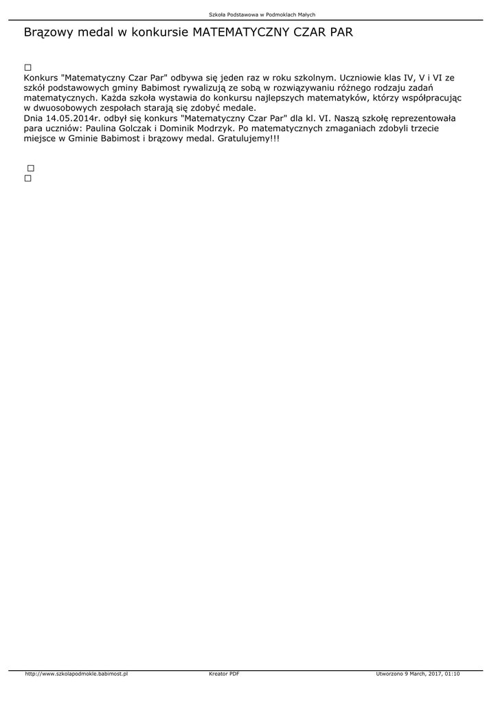Szkoła Podstawowa w Podmoklach Małych Brązowy medal w konkursie MATEMATYCZNY CZAR PAR Konkurs "Matematyczny Czar Par" odbywa się jeden raz w roku szkolnym. Uczniowie klas IV, V i VI ze szkół podstawowych gminy Babimost rywalizują ze sobą w rozwiązywaniu różnego rodzaju zadań matematycznych. Każda szkoła wystawia do konkursu najlepszych matematyków, którzy współpracując w dwuosobowych zespołach starają się zdobyć medale. Dnia 14.05.2014r. odbył się konkurs "Matematyczny Czar Par" dla kl. VI. Naszą szkołę reprezentowała para uczniów: Paulina Golczak i Dominik Modrzyk. Po matematycznych zmaganiach zdobyli trzecie miejsce w Gminie Babimost i brązowy medal. Gratulujemy!!! http://www.szkolapodmokle.babimost.pl Kreator PDF Utworzono 9 March, 2017, 01:10