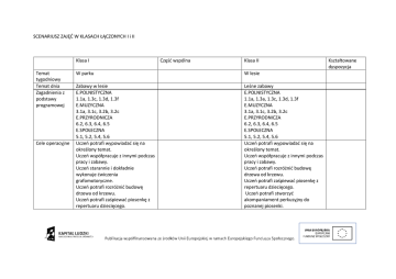 SCENARIUSZ ZAJĘĆ W KLASACH ŁĄCZONYCH I i II Klasa I Temat tygodniowy Temat dnia Zagadnienia z podstawy programowej Cele operacyjne Część wspólna Klasa II W parku W lesie Zabawy w lesie E.POLNISTYCZNA 1.1a, 1.3c, 1.3d, 1.3f E.MUZYCZNA 3.1a, 3.1c, 3.2b, 3.2c E.PRZYRODNICZA 6.2, 6.3, 6.4, 6.5 E.SPOŁECZNA 5.1, 5.2, 5.4, 5.6 Uczeń potrafi wypowiadać się na określony temat. Uczeń współpracuje z innymi podczas pracy i zabawy. Uczeń starannie i dokładnie wykonuje ćwiczenia grafomotoryczne. Uczeń potrafi rozróżnić budowę drzewa od krzewu. Uczeń potrafi zaśpiewać piosenkę z repertuaru dziecięcego. Leśne zabawy E.POLNISTYCZNA 1.1a, 1.3a, 1.3c, 1.3d, 1.3f E.MUZYCZNA 3.1a, 3.1c, 3.2b, 3.2c E.PRZYRODNICZA 6.2, 6.3, 6.4, 6.5 E.SPOŁECZNA 5.1, 5.2, 5.4, 5.6 Uczeń potrafi wypowiadać się na określony temat. Uczeń współpracuje z innymi podczas pracy i zabawy. Uczeń potrafi rozróżnić budowę drzewa od krzewu. Uczeń potrafi zaśpiewać piosenkę z repertuaru dziecięcego. Uczeń potrafi stworzyć akompaniament perkusyjny do poznanej piosenki. Kształtowane dyspozycja Pomoce dydaktyczne Przebieg zajęć Uczeń potrafi stworzyć akompaniament perkusyjny do poznanej piosenki. Uczeń potrafi wymyśleć inscenizacje ruchowa do poznanej piosenki. Podręcznik „Nasz Elementarz – klasa I, materiały plastyczne, karty pracy Temat: Witamy Panią Jesień. Praca z podręcznikiem „Nasz elementarz” s. 30. Ćwiczenia kaligraficzne z poznanymi literami, ćwiczenia grafomotoryczne – uczniowie pogrubiają mazakami kontury liści, a następnie ozdabia je szlaczkami. Uczeń potrafi wymyśleć inscenizacje ruchowa do poznanej piosenki. e. polonistyczna Podręcznik klasa II, materiały plastyczne, karty pracy Temat: Jesień wokół nas. Nauczyciel wita uczniów powitaną piosenką, przedstawia temat lekcji i zaprasza uczniów do wysłuchania wiersza „Jesień” – J. Czechowicza Rozmowa na temat wysłuchanego wiersza oraz wspólne zastanawianie się nad charakterystycznymi cechami jesieni, na podstawie zdjęć z Internetu oraz doświadczeń dzieci. Nauczyciel zaprasza uczniów do stolików. Po wykonaniu zadania nauczyciel zaprasza uczniów do zabawy „Jesienne drzewa”. Uczniowie stoją Nauczyciel prosi uczniów aby podzielili się parami i wymyślili na kartkach rymowankę dotycząca jesieni. Po wykonaniu zadania nauczyciel sprawdza poprawność i prosi uczniów, aby przepisali rymowani do zeszytów. DOCIEKLIWOŚC PLANOWANIE KORYGOWANIE WSPÓŁDZIAŁAN IE w rozsypce z uniesionymi rękami do góry, będą jesiennymi drzewami. Uczniowie uważnie słuchają opowieści nauczyciela i za pomocą ruchów pantomimicznych pokazują, co dzieje się z drzewami. Temat: Listkowa piosenka. e. muzyczna Zabawy taneczne przy piosence „Listkowa piosenka”- M. Tomaszewskiej (http://www.edumuz.pl/shop_items. php?cat_id=73) Temat: Listkowa piosenka. Nauka słów piosenki, tworzenie akompaniamentu perkusyjnego do piosenki oraz próby tworzenia inscenizacji ruchowej do piosenki. Temat: Jesienna mandala - spacer e. przyrodnicza Edukacja w plenerze – spacer do lasu połączony z obserwacją zmian zachodzących jesienią. Obserwacja drzew, krzewów (zastanawianie się Temat: Jesienna mandala – spacer. nad różnicami w budowie drzew i krzewów) zwierząt oraz ptaków. Zbieranie materiałów przyrodniczych. Nauczyciel zaprasza uczniów do wykonania jesiennej mandali. Wyjaśnia pojęcie mandali, następnie prosi uczniów, aby wspólnie ustalili co powinna zawierać jesienna mandala, zebrali potrzebne materiały i wykonali pracę. Powrót ze spaceru, nauczyciel dziękuje uczniom za aktywny udział w zajęciach.