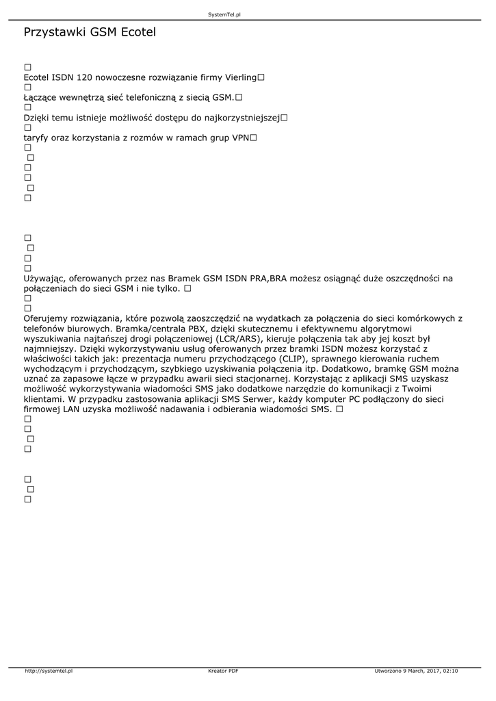 SystemTel.pl Przystawki GSM Ecotel Ecotel ISDN 120 nowoczesne rozwiązanie firmy Vierling Łączące wewnętrzą sieć telefoniczną z siecią GSM. Dzięki temu istnieje możliwość dostępu do najkorzystniejszej taryfy oraz korzystania z rozmów w ramach grup VPN Używając, oferowanych przez nas Bramek GSM ISDN PRA,BRA możesz osiągnąć duże oszczędności na połączeniach do sieci GSM i nie tylko. Oferujemy rozwiązania, które pozwolą zaoszczędzić na wydatkach za połączenia do sieci komórkowych z telefonów biurowych. Bramka/centrala PBX, dzięki skutecznemu i efektywnemu algorytmowi wyszukiwania najtańszej drogi połączeniowej (LCR/ARS), kieruje połączenia tak aby jej koszt był najmniejszy. Dzięki wykorzystywaniu usług oferowanych przez bramki ISDN możesz korzystać z właściwości takich jak: prezentacja numeru przychodzącego (CLIP), sprawnego kierowania ruchem wychodzącym i przychodzącym, szybkiego uzyskiwania połączenia itp. Dodatkowo, bramkę GSM można uznać za zapasowe łącze w przypadku awarii sieci stacjonarnej. Korzystając z aplikacji SMS uzyskasz możliwość wykorzystywania wiadomości SMS jako dodatkowe narzędzie do komunikacji z Twoimi klientami. W przypadku zastosowania aplikacji SMS Serwer, każdy komputer PC podłączony do sieci firmowej LAN uzyska możliwość nadawania i odbierania wiadomości SMS. http://systemtel.pl Kreator PDF Utworzono 9 March, 2017, 02:10