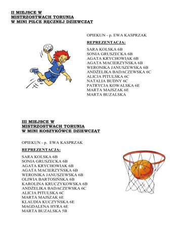 II MIEJSCE W MISTRZOSTWACH TORUNIA W MINI PIŁCE RĘCZNEJ DZIEWCZĄT OPIEKUN - p. EWA KASPRZAK REPREZENTACJA: SARA KOLSKA 6B SONIA GRUSZECKA 6B AGATA KRYCHOWIAK 6B AGATA MACIERZYŃSKA 6B WERONIKA JANUSZEWSKA 6B ANDŻELIKA BADACZEWSKA 6C ALICJA PITULSKA 6C NATALIA BUDNY 6C PATRYCJA KOWALSKA 6E MARTA MAJSZAK 6E MARTA BUZALSKA III MIEJSCE W MISTRZOSTWACH TORUNIA W MINI KOSZYKÓWCE DZIEWCZĄT OPIEKUN - p. EWA KASPRZAK REPREZENTACJA: SARA KOLSKA 6B SONIA GRUSZECKA 6B AGATA KRYCHOWIAK 6B AGATA MACIERZYŃSKA 6B WERONIKA JANUSZEWSKA 6B OLIWIA BARTOSIŃSKA 6B KAROLINA KRUCZYKOWSKA 6B ANDŻELIKA BADACZEWSKA 6C ALICJA PITULSKA 6C MARTA MAJSZAK 6E KLAUDIA KUCZYŃSKA 6E MAGDALENA HYRA 6E MARTA BUZALSKA 5B I MIEJSCE W MISTRZOSTWACH TORUNIA W UNIHOKU CHŁOPCÓW I MIEJSCE W PÓŁFINALE WOJEWÓDZKIM W UNIHOKU IV MIEJSCE W FINALE WOJEWÓDZKIM W UNIHOKU OPIEKUN p. SŁAWEK SZACHNIEWICZ REPREZENTACJA: DAWID RYDER 6D TOMASZ WIECZOREK 6D MIŁOSZ STAWSKI 5E JAKUB LEWANDOWSKI 5E HUBERT DUDEK 5E JAKUB WENKER 4D KACPER RUMIŃSKI 4D MIKOŁAJ KOŁYBSKI 4D PATRYK RUTKOWSKI 4D PATRYK KALCZYŃSKI 6D HALOWE MISTRZOSTWA TORUNIA W LA I M-CE W BIEGU PRZEZ PŁOTKI MATEUSZ PIASECKI 6A II M-CE W SKOKU W DAL Z M-CA ROBERT PAPRZYCKI 6A III M-CE W BIEGU NA 30 M. DAWID RYDER 6D II M-CE W BIEGU NA 30 M. MATEUSZ PIASECKI 6A I M-CE W BIEGU PRZEZ PŁOTKI KAROLINA SZPEJNA 6D III M-CE W BIEGU PRZEZ PŁOTKI KAROLINA SZPEJNA 6D II M-CE W BIEGU PRZEZ PLOTKI NADIA SAWKA 5B III MIEJSCE W MISTRZOSTWACH TORUNIA W MINI PIŁCE NOŻNEJ CHŁOPCÓW OPIEKUN – p. ANDRZEJ SMARDZEWSKI, p. ADAM MARCINIAK REPREZENTACJA IGOR WŁOSIŃSKI 6B PRZEMEK PIWOŃSKI 6B MICHAŁ CHODKIEWICZ 6C KUBA GRUZLEWSKI 6B MATEUSZ PIASECKI 6A TYMON SZCZEPANOWSKI 6A ADAM MATYS 5C IGOR KUNA 5A III MIEJSCE W SZTAFETOWYCH BIEGACH PRZEŁAJOWYCH OPIEKUN p. ANDRZEJ SMARDZEWSKI REPREZENTACJA MICHAŁ CHODKIEWICZ 6C KUBA GRUZLEWSKI 6B IGOR WŁOSIŃSKI 6B MATEUSZ PIASECKI 6A TYMON SZCZEPANOWSKI 6A ROBERT PAPRZYCKI 6A FILIP JABŁOŃSKI 5A IGOR KUNA 5A DAWID STANGRICKI 5B SEBASTIAN RUMIŃSKI 6E KAROL TUROWSKI 6E