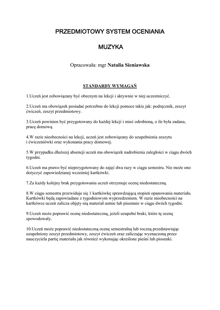 PRZEDMIOTOWY SYSTEM OCENIANIA MUZYKA Opracowała: mgr Natalia Sieniawska STANDARDY WYMAGAŃ 1.Uczeń jest zobowiązany być obecnym na lekcji i aktywnie w niej uczestniczyć. 2.Uczeń ma obowiązek posiadać potrzebne do lekcji pomoce takie jak: podręcznik, zeszyt ćwiczeń, zeszyt przedmiotowy. 3.Uczeń powinien być przygotowany do każdej lekcji i mieć odrobioną, o ile była zadana, pracę domową. 4.W razie nieobecności na lekcji, uczeń jest zobowiązany do uzupełnienia zeszytu i ćwiczeniówki oraz wykonania pracy domowej. 5.W przypadku dłuższej absencji uczeń ma obowiązek nadrobienia zaległości w ciągu dwóch tygodni. 6.Uczeń ma prawo być nieprzygotowany do zajęć dwa razy w ciągu semestru. Nie może ono dotyczyć zapowiedzianej wcześniej kartkówki. 7.Za każdy kolejny brak przygotowania uczeń otrzymuje ocenę niedostateczną. 8.W ciągu semestru przewiduje się 1 kartkówkę sprawdzającą stopień opanowania materiału. Kartkówki będą zapowiadane z tygodniowym wyprzedzeniem. W razie nieobecności na kartkówce uczeń zalicza objęty nią materiał ustnie lub pisemnie w ciągu dwóch tygodni. 9.Uczeń może poprawić ocenę niedostateczną, jeżeli uzupełni braki, które tę ocenę spowodowały. 10.Uczeń może poprawić niedostateczną ocenę semestralną lub roczną przedstawiając uzupełniony zeszyt przedmiotowy, zeszyt ćwiczeń oraz zaliczając wyznaczoną przez nauczyciela partię materiału jak również wykonując określone pieśni lub piosenki. 1. Kontrakt z uczniami: a) każdy uczeń jest oceniany zgodnie z zasadami sprawiedliwości, b) ocenie podlegają wszystkie wymienione niżej formy aktywności, c) każdy uczeń powinien otrzymać w ciągu semestru 3 oceny, a na bieżąco uczeń oceniany jest również na plusy i minusy (3 plusy - piątka, 3 minusy - jedynka), d) nie ocenia się ucznia na pierwszych zajęciach po dłuższej nieobecności w szkole. 2. Obszary aktywności: a) poznanie podstawowych zagadnień teoretycznych. Edukacja muzyczna obejmuje: - śpiew, - grę na instrumentach, - aktywność twórczą, - słuchanie muzyki, - ruch z muzyką. 3.Kryteria oceny Ocena uczniów na lekcjach muzyki jest utrudniona ze względu na różnice w uzdolnieniach. Uwzględnić należy jednak obiektywizm - oceniając realne osiągnięcia ucznia i subiektywizm - oceniając postawę ucznia wobec stawianych zadań oraz pracę wkładaną w ich wykonanie oraz bieżące przygotowanie do zajęć. Ocenie podlega: śpiew - nauczyciel sprawdza stopień opanowania rytmu, melodii, tekstu, intonacji , dykcji, podczas, wykonywania piosenek solo i w małych grupach 2- 3 osobowych, gra na instrumentach dzwonkach krótkich fragmentów melodii oraz motywów rytmicznych na instrumentarium Orffa (instrumenty perkusyjne), aktywność twórcza (tworzenie melodii do wierszy, przysłów), słuchanie muzyki (zapamiętywanie charakterystycznych melodii), ruch z muzyką (układ ruchowy do piosenek i elementy tańców ), opanowanie podstawowych wiadomości teoretycznych. Ocenę celującą może uzyskać uczeń który: posiada wiedzę i umiejętności wykraczające poza program nauczania przedmiotu w danej klasie, samodzielnie i twórczo rozwija indywidualne uzdolnienia artystyczne, szczególnie aktywnie bierze udział w : pozalekcyjnych zajęciach muzycznych – chórze szkolnym, konkursach piosenki, -programach artystycznych prezentowanych w szkole i środowisku, życiu kulturalnym poprzez udział w koncertach i spektaklach. Ocenę bardzo dobrą otrzymuje uczeń, który: opanował pełen zakres wiedzy i umiejętności określony w programie nauczania danej klasy, umiejętnie wykorzystuje posiadaną wiedzę w ćwiczeniach praktycznych, Ocenę dobrą otrzymuje uczeń, który: nie opanował w pełni wiadomości określonych w programie nauczania danej klasy, poprawnie wykorzystuje zdobyte wiadomości w ćwiczeniach praktycznych, bierze czynny udział w zajęciach lekcyjnych. Ocenę dostateczną otrzymuje uczeń, który: częściowo opanował wiadomości zawarte w programie nauczania danej klasy, potrafi wykonać niektóre zadania z zakresu śpiewu, gry na instrumentach, tworzenia i percepcji, muzyki przy pomocy nauczyciela, wykazuje małe zainteresowanie przedmiotem. Ocenę dopuszczającą otrzymuje uczeń, który: ma duże braki w opanowaniu minimum programowego, nie potrafi samodzielnie wykonać działań w poszczególnych formach aktywności, niechętnie uczestniczy w zajęciach lekcyjnych oraz ma lekceważący stosunek do przedmiotu. Ocenę niedostateczną otrzymuje uczeń, który: pomimo starań nauczyciela nie przejawiał zainteresowania przedmiotem oraz żadnej aktywności na lekcjach muzyki, nie opanował żadnych umiejętności muzycznych, nie potrafi, nawet przy pomocy nauczyciela, zaśpiewać żadnej piosenki, nie opanował minimum wiadomości określonych programem nauczania. FORMY SPRAWDZANIA WIADOMOŚCI I UMIEJĘTNOŚCI UCZNIÓW. 1.Śpiew piosenek na ocenę (dwie oceny za śpiew i znajomość tekstu). 2.Gra na instrumencie 3. Kartkówki: 1 w semestrze. 4. Prace domowe: 1-2 razy w semestrze. 5. Uczestnictwo w zajęciach: szczególna aktywność na lekcji nagradzana plusami i oceną bardzo dobrą. 6. Brak aktywności na lekcji karane jest minusami i oceną niedostateczną. 7.Za dodatkową pracę na lekcji uczeń otrzymuje plusa. Trzy plusy to ocena bardzo dobra. 8. Udział w konkursach lub występach chóru szkolnego jest premiowany oceną celującą. 9. Prace dodatkowe: nie więcej niż 1 w semestrze. 10. Inne: zeszyt przedmiotowy : 1 raz w semestrze. Moje dobre rady: Proszę o solidną i systematyczną pracę w ciągu całego semestru, gdyż dzięki temu można będzie uniknąć konieczności poprawiania ocen niedostatecznych lub słabych. Ze względu na 1 godzinę muzyki w tygodniu stanowi to czasami problem. Proszę o przygotowywanie powierzonych zadań na bieżąco, odrabianie prac domowych oraz noszenia zeszytu, książki i ćwiczeń. Proszę o aktywną pracę na l