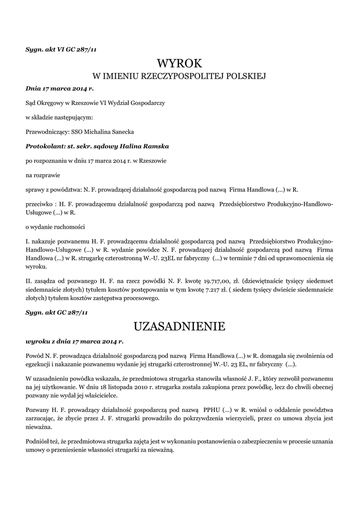 Sygn. akt VI GC 287/11 WYROK W IMIENIU RZECZYPOSPOLITEJ POLSKIEJ Dnia 17 marca 2014 r. Sąd Okręgowy w Rzeszowie VI Wydział Gospodarczy w składzie następującym: Przewodniczący: SSO Michalina Sanecka Protokolant: st. sekr. sądowy Halina Ramska po rozpoznaniu w dniu 17 marca 2014 r. w Rzeszowie na rozprawie sprawy z powództwa: N. F. prowadzącej działalność gospodarczą pod nazwą Firma Handlowa (...) w R. przeciwko : H. F. prowadzącemu działalność gospodarczą pod nazwą Przedsiębiorstwo Produkcyjno-HandlowoUsługowe (...) w R. o wydanie ruchomości I. nakazuje pozwanemu H. F. prowadzącemu działalność gospodarczą pod nazwą Przedsiębiorstwo ProdukcyjnoHandlowo-Usługowe (...) w R. wydanie powódce N. F. prowadzącej działalność gospodarczą pod nazwą Firma Handlowa (...) w R. strugarkę czterostronną W.-U. 23EL nr fabryczny (...) w terminie 7 dni od uprawomocnienia się wyroku. II. zasądza od pozwanego H. F. na rzecz powódki N. F. kwotę 19.717,00, zł. (dziewiętnaście tysięcy siedemset siedemnaście złotych) tytułem kosztów postępowania w tym kwotę 7.217 zł. ( siedem tysięcy dwieście siedemnaście złotych) tytułem kosztów zastępstwa procesowego. Sygn. akt GC 287/11 UZASADNIENIE wyroku z dnia 17 marca 2014 r. Powód N. F. prowadząca działalność gospodarczą pod nazwą Firma Handlowa (...) w R. domagała się zwolnienia od egzekucji i nakazanie pozwanemu wydanie jej strugarki czterostronnej W.-U. 23 EL, nr fabryczny (...). W uzasadnieniu powódka wskazała, że przedmiotowa strugarka stanowiła własność J. F., który zezwolił pozwanemu na jej użytkowanie. W dniu 18 listopada 2010 r. strugarka została zakupiona przez powódkę, lecz do chwili obecnej pozwany nie wydał jej właścicielce. Pozwany H. F. prowadzący działalność gospodarczą pod nazwą PPHU (...) w R. wniósł o oddalenie powództwa zarzucając, że zbycie przez J. F. strugarki prowadziło do pokrzywdzenia wierzycieli, przez co umowa zbycia jest nieważna. Podniósł też, że przedmiotowa strugarka zajęta jest w wykonaniu postanowienia o zabezpieczeniu w procesie uznania umowy o przeniesienie własności strugarki za nieważną. Na rozprawie w dniu 10 lutego 2012 r. Sąd zawiesił postępowanie do czasu zakończenia sprawy zawisłej pod sygn. akt VI GC 14/12 o uznanie czynności za nieważną, tj. o ustalenie właściciela przedmiotowej strugarki. W sprawie z powództwa H. F. prowadzącego działalność gospodarczą pod nazwą PPHU (...) w R. p-ko N. F. prowadzącej działalność gospodarczą pod nazwą Firma Handlowa (...) w R. o uznanie czynności za bezskuteczną, Sąd Okręgowy w Rzeszowie VI Wydział Gospodarczy wyrokiem z dnia 7 grudnia 2012 r, sygn. akt VI GC 14/12 powództwo oddalił. Z uzasadnienia wyroku wynika, że umowa z dnia 18.11.2010 r. o zakup strugarki jest ważna, a wiec właścicielką strugarki jest powódka. Od wyroku tego apelację złożył H. F.. Sąd Okręgowy w Rzeszowie postanowieniem z dnia 5 czerwca 2013 r, sygn. akt VI GC 14/12 odrzucił apelację powoda, ponieważ nie została opłacona. Postanowieniem z dnia 22 lipca 2013 r. Sąd nadał klauzulę wykonalności wyrokowi z dnia 7 grudnia 2012 r, sygn. akt VI GC 14/12. Sprawa VI GC 287/11 została podjęta postanowieniem z dnia 6 września 2013 r. Na rozprawie w dniu 17 marca 2014 r. pełnomocnik powoda sprecyzował swoje roszczenie w ten sposób, że domaga się nakazania wydania strugarki przez pozwanego. Słuchany na rozprawie w dniu 17 marca 2014 r. w charakterze strony pozwany H. F. przyznał, że przedmiotowa strugarka nigdy nie była jego własnością i nie ma żadnego tytułu do jej posiadania. Strugarkę zatrzymał, bo uważał, że ma takie prawo ponieważ ma roszczenia wobec jej byłego właściciela. Sąd dał wiarę zeznaniom pozwanego, gdyż znajduje potwierdzenie w zebranym w sprawie materiale dowodowym. Sąd zważył co następuje : Ponieważ zgodnie z art. 744 § 1 kpc postępowanie zabezpieczające polegające na zajęciu strugarki upadło, uzasadnione było sprecyzowanie żądania pozwu przez powoda, że dochodzi wydania strugarki. Jak ustalono wyżej, przedmiotowa strugarka nigdy nie była własnością pozwanego, a pozwany miał tego pełną świadomość. Zatrzymując bez podstawy prawnej cudzą rzecz, pozwany dopuścił się czynu niedozwolonego. Zgodnie z art. 415 kc kto z winy swojej wyrządził drugiemu szkodę, obowiązany jest do jej naprawienia. Wydanie rzeczy bezprawnie zatrzymanej właścicielce jest naprawieniem szkody. W tym stanie rzeczy Sąd orzekł jak w sentencji. O kosztach orzeczono w myśl art. 98§ 1 kpc. (...) (...) (...).