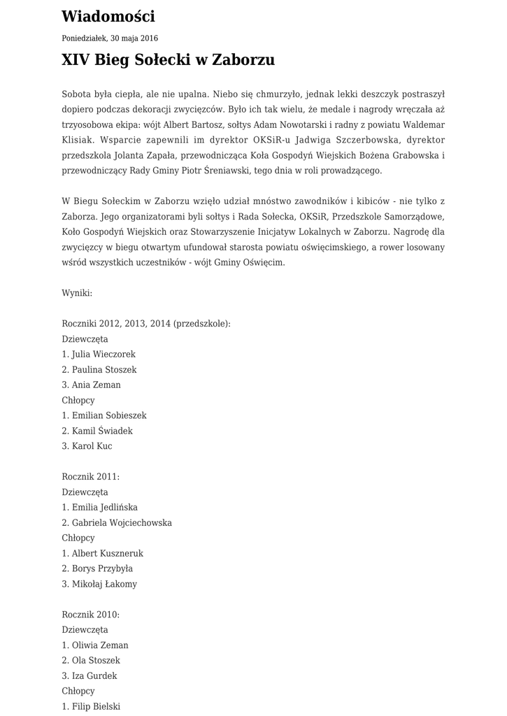 Wiadomości Poniedziałek, 30 maja 2016 XIV Bieg Sołecki w Zaborzu Sobota była ciepła, ale nie upalna. Niebo się chmurzyło, jednak lekki deszczyk postraszył dopiero podczas dekoracji zwycięzców. Było ich tak wielu, że medale i nagrody wręczała aż trzyosobowa ekipa: wójt Albert Bartosz, sołtys Adam Nowotarski i radny z powiatu Waldemar Klisiak. Wsparcie zapewnili im dyrektor OKSiR-u Jadwiga Szczerbowska, dyrektor przedszkola Jolanta Zapała, przewodnicząca Koła Gospodyń Wiejskich Bożena Grabowska i przewodniczący Rady Gminy Piotr Śreniawski, tego dnia w roli prowadzącego. W Biegu Sołeckim w Zaborzu wzięło udział mnóstwo zawodników i kibiców - nie tylko z Zaborza. Jego organizatorami byli sołtys i Rada Sołecka, OKSiR, Przedszkole Samorządowe, Koło Gospodyń Wiejskich oraz Stowarzyszenie Inicjatyw Lokalnych w Zaborzu. Nagrodę dla zwycięzcy w biegu otwartym ufundował starosta powiatu oświęcimskiego, a rower losowany wśród wszystkich uczestników - wójt Gminy Oświęcim. Wyniki: Roczniki 2012, 2013, 2014 (przedszkole): Dziewczęta 1. Julia Wieczorek 2. Paulina Stoszek 3. Ania Zeman Chłopcy 1. Emilian Sobieszek 2. Kamil Świadek 3. Karol Kuc Rocznik 2011: Dziewczęta 1. Emilia Jedlińska 2. Gabriela Wojciechowska Chłopcy 1. Albert Kuszneruk 2. Borys Przybyła 3. Mikołaj Łakomy Rocznik 2010: Dziewczęta 1. Oliwia Zeman 2. Ola Stoszek 3. Iza Gurdek Chłopcy 1. Filip Bielski 2. Wojtuś Kajta 3. Dawid Przybyła Rocznik 2009: Dziewczęta 1. Zuzia Stachura 2. Klara Kuszneruk 3. Asia Woźniak Chłopcy 1. Franio Tobiasz 2. Mateusz Kotyza 3. Maciej Janus Rocznik 2008: Dziewczęta 1. Roksana Zajas 2. Dagmara Krawczyk 3. Matylda Kwadrans Chłopcy 1. Kacper Sadek 2. Szymon Pater 3. Błażej Świadek Rocznik 2007: Dziewczęta 1. Emilia Kiełbaśnik 2. Martyna Cieśla 3. Małgorzata Zemła Chłopcy 1. Szymon Konopczyński 2. Paweł Woźniak 3. Łukasz Bratek Rocznik 2006: Dziewczęta 1. Sandra Sporysz 2. Gabrysia Kuszneruk 3. Wiktoria Szczerbowska Chłopcy 1. Patryk Wieczorek 2. Jakub Szczerbowski 3. Michał Szczepaniak Rocznik 2005: Dziewczęta 1. Milena Stachura 2. Kamila Zając 3. Magda Dynakowska Chłopcy 1. Igor Kukla 2. Marcin Nowotarski 3. Bartosz Jarosz Rocznik 2004: Dziewczęta 1. Weronika Błasiak 2. Sara Matlak 3. Agata Stachura Chłopcy 1. Damian Grubka 2. Marcin Błasiak 3. Damian Nidecki Rocznik 2003: Dziewczęta 1. Weronika Ptaszyńska 2. Martyna Sadlik 3. Julia Przybyła Chłopcy 1. Artur Zemła 2. Krystian Podstawa 3. Dawid Enson Gimnazjum: Dziewczęta 1. Klaudia Podstawa 2. Marlena Sporysz 3. Katarzyna Porowska Chłopcy 1. Mikołaj Dusik 2. Paweł Chrapczyński 3. Kamil Jakubowski Kategoria OPEN: Magdalena Gutowska - medal dla najbardziej wytrwałej zawodniczki. Mirosław Smolarek - medal dla biegacza-samorządowca. Kobiety 1. Iwona Januszyk 2. Karolina Opalska 3. Kinga Cichoń Mężczyźni 1. Adrian Bartuś 2. Przemysław Mendyk 3. Paweł Wójcik