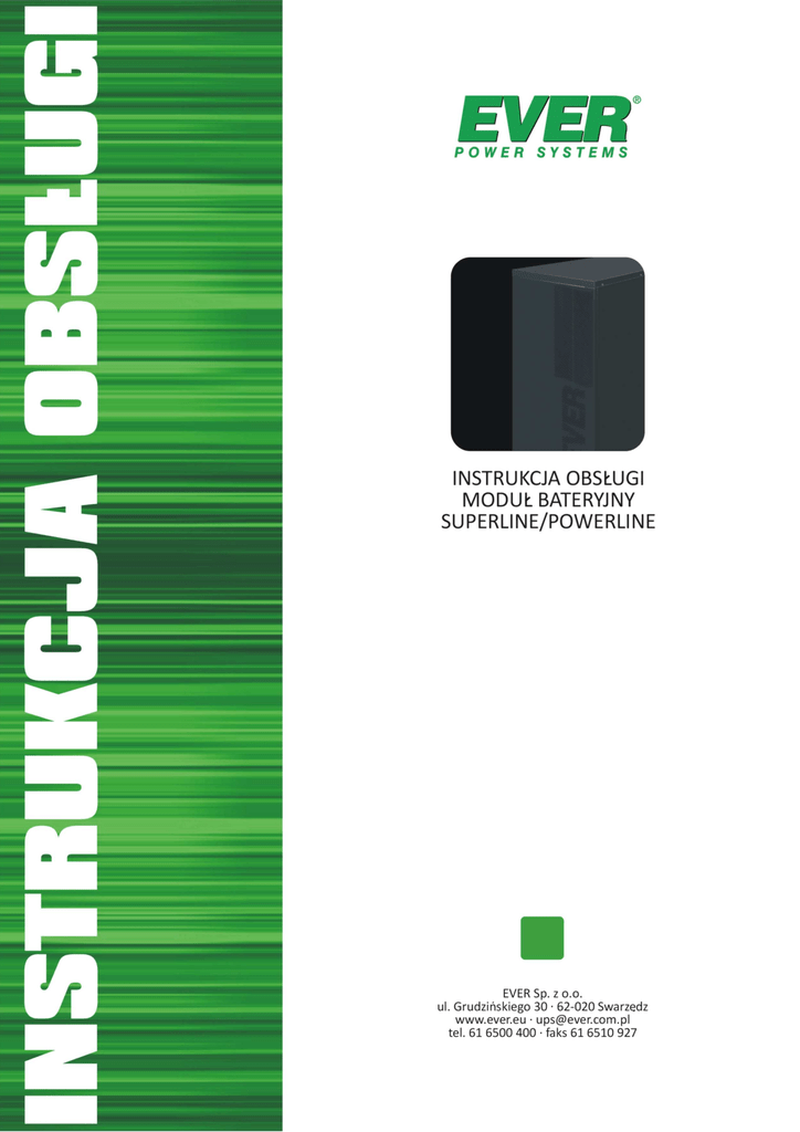 Instrukcja obsługi Modułu Bateryjnego SPIS TREŚCI SPIS TREŚCI ............................................................................................................................. 2 INFORMACJE OGÓLNE ......................................................................................................... 3 PRZEZNACZENIE................................................................................................................ 3 OGÓLNA CHARAKTERYSTYKA ..................................................................................... 3 BUDOWA MODUŁU BATERYJNEGO.................................................................................. 3 PANEL TYLNY .................................................................................................................... 3 Wejście DC ................................................................................................................................ 4 Wyjście DC ................................................................................................................................ 4 INSTRUKCJA BHP................................................................................................................... 5 PRZENOSZENIE................................................................................................................... 5 BEZPIECZEŃSTWO ELEKTRYCZNE ............................................................................... 5 INSTALACJA............................................................................................................................ 6 ROZPAKOWANIE................................................................................................................ 6 MONTAŻ............................................................................................................................... 7 Podłączenie modułów ................................................................................................................ 8 Odłączenie modułów.................................................................................................................. 9 UWAGI EKSPLOATACYJNE ............................................................................................... 10 ZABEZPIECZENIA ............................................................................................................ 10 PRZECHOWYWANIE, KONSERWACJA I TRANSPORT ............................................. 10 UTYLIZACJA ..................................................................................................................... 11 PARAMETRY TECHNICZNE ............................................................................................... 12 INFORMACJE DOTYCZĄCE PRZEPISÓW I GWARANCJI ............................................. 13 DEKLARACJA ZGODNOŚCI............................................................................................ 13 GWARANCJA..................................................................................................................... 13 KARTA REJESTRACYJNA................................................................................................... 14 2010/06/30 Pomoc Techniczna, tel.: 0048 61 6500 400 www.ever.eu 2 Instrukcja obsługi Modułu Bateryjnego INFORMACJE OGÓLNE PRZEZNACZENIE Moduł bateryjny przeznaczony jest do zasilaczy POWERLINE. Zasilacze te mają możliwość podłączenia równocześnie kilku modułów, co pozwala na znaczne wydłużenie czasu pracy zasilacza w trybie pracy bateryjnej. OGÓLNA CHARAKTERYSTYKA Moduły oferowane są w obudowach typu Tower. W zależności od pożądanego czasu podtrzymania dobiera się moduł bateryjny o odpowiedniej ilości akumulatorów. Złącze umieszczone na panelu tylnym służy do podłączenia modułu. Moduł jest przelotowy, tzn. połączenia wykonywane są między zasilaczem a pierwszym modułem, między pierwszym a drugim modułem, drugim i trzecim itd. Zamontowane skrętne kółka ułatwiają przemieszczanie modułu według potrzeb użytkownika. BUDOWA MODUŁU BATERYJNEGO PANEL TYLNY Rysunek 1: Panel tylny 1) Korpus modułu bateryjnego 2) Oprawy bezpieczników topikowych 3) Zaciski przyłączeniowe 4) Uchwyty mocowania przewodów 2010/06/30 Pomoc Techniczna, tel.: 0048 61 6500 400 www.ever.eu 3 Instrukcja obsługi Modułu Bateryjnego Rysunek 2: Złącza przyłączeniowe z zabezpieczeniami Wejście DC F1- zabezpieczenie przeciwzwarciowe zacisków wejściowych (oprawa bezpiecznika topikowego) + - wejściowy biegun dodatni modułu bateryjnego - - wejściowy biegun ujemny modułu bateryjnego Wyjście DC F2 - zabezpieczenie przeciwzwarciowe zacisków wyjściowych (oprawa bezpiecznika topikowego) + - wyjściowy biegun dodatni modułu bateryjnego - - wyjściowy biegun ujemny modułu bateryjnego - punkt uziemienia ochronnego urządzenia, podłączenie poprzez przykręcenie przewodu zakończonego konektorem oczkowym za pomocą śruby M6 2010/06/30 Pomoc Techniczna, tel.: 0048 61 6500 400 www.ever.eu 4 Instrukcja obsługi Modułu Bateryjnego INSTRUKCJA BHP PRZENOSZENIE • przy przenoszeniu należy zachować szczególną ostrożność; • nie należy przenosić ciężkiego sprzętu samodzielnie; • praca urządzenia oraz jego magazynowanie powinno odbywać się w warunkach zgodnych ze specyfikacją urządzenia; BEZPIECZEŃSTWO ELEKTRYCZNE • w warunkach zagrażających zdrowiu i/lub życiu nigdy nie należy pracować samodzielnie; • przy krótkotrwałym zwarciu duży prąd może spowodować poważne oparzenia; • przed podłączeniem urządzenia należy sprawdzić stan techniczny przewodów, wtyków i gniazd zasilania oraz stan samego urządzenia; UWAGA! Urządzenia nie wolno instalować w pobliżu materiałów łatwopalnych! Wszelkie czynności naprawcze dokonywane przez użytkownika są zabronione i grożą utratą zdrowia lub życia. Wszystkie naprawy oraz wymiana baterii powinny być dokonywane wyłącznie przez wykwalifikowany personel serwisu.