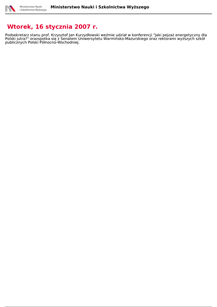 Wtorek, 16 stycznia 2007 r. - Ministerstwo Nauki i Szkolnictwa