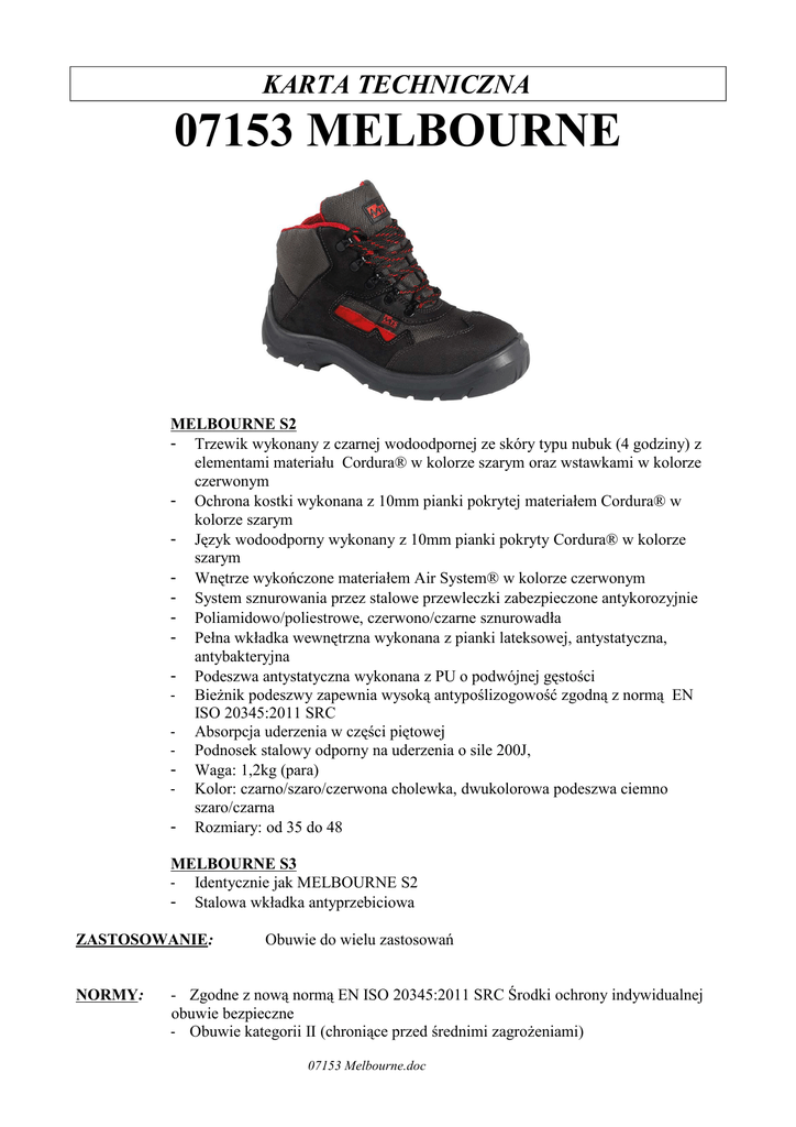 KARTA TECHNICZNA 07153 MELBOURNE MELBOURNE S2 - Trzewik wykonany z czarnej wodoodpornej ze skóry typu nubuk (4 godziny) z elementami materiału Cordura® w kolorze szarym oraz wstawkami w kolorze czerwonym - Ochrona kostki wykonana z 10mm pianki pokrytej materiałem Cordura® w kolorze szarym - Język wodoodporny wykonany z 10mm pianki pokryty Cordura® w kolorze szarym - Wnętrze wykończone materiałem Air System® w kolorze czerwonym - System sznurowania przez stalowe przewleczki zabezpieczone antykorozyjnie - Poliamidowo/poliestrowe, czerwono/czarne sznurowadła - Pełna wkładka wewnętrzna wykonana z pianki lateksowej, antystatyczna, antybakteryjna - Podeszwa antystatyczna wykonana z PU o podwójnej gęstości - Bieżnik podeszwy zapewnia wysoką antypoślizogowość zgodną z normą EN ISO 20345:2011 SRC - Absorpcja uderzenia w części piętowej - Podnosek stalowy odporny na uderzenia o sile 200J, - Waga: 1,2kg (para) - Kolor: czarno/szaro/czerwona cholewka, dwukolorowa podeszwa ciemno szaro/czarna - Rozmiary: od 35 do 48 MELBOURNE S3 Identycznie jak MELBOURNE S2 - Stalowa wkładka antyprzebiciowa - ZASTOSOWANIE: NORMY: Obuwie do wielu zastosowań - Zgodne z nową normą EN ISO 20345:2011 SRC Środki ochrony indywidualnej obuwie bezpieczne - Obuwie kategorii II (chroniące przed średnimi zagrożeniami) 07153 Melbourne.doc