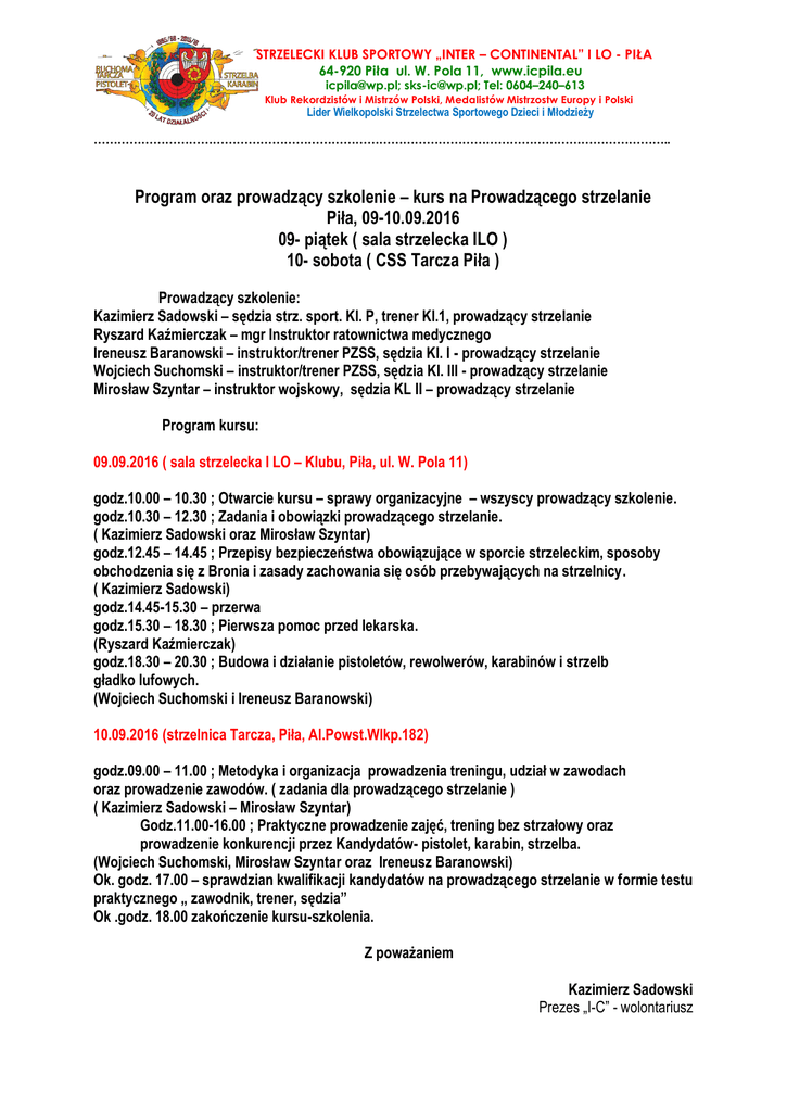 STRZELECKI KLUB SPORTOWY „INTER – CONTINENTAL” I LO - PIŁA 64-920 Piła ul. W. Pola 11, www.icpila.eu [email protected]; [email protected]; Tel: 0604–240–613 Klub Rekordzistów i Mistrzów Polski, Medalistów Mistrzostw Europy i Polski Lider Wielkopolski Strzelectwa Sportowego Dzieci i Młodzieży ……………………………………………………………………………………………………………………………….. Program oraz prowadzący szkolenie – kurs na Prowadzącego strzelanie Piła, 09-10.09.2016 09- piątek ( sala strzelecka ILO ) 10- sobota ( CSS Tarcza Piła ) Prowadzący szkolenie: Kazimierz Sadowski – sędzia strz. sport. Kl. P, trener Kl.1, prowadzący strzelanie Ryszard Kaźmierczak – mgr Instruktor ratownictwa medycznego Ireneusz Baranowski – instruktor/trener PZSS, sędzia Kl. I - prowadzący strzelanie Wojciech Suchomski – instruktor/trener PZSS, sędzia Kl. III - prowadzący strzelanie Mirosław Szyntar – instruktor wojskowy, sędzia KL II – prowadzący strzelanie Program kursu: 09.09.2016 ( sala strzelecka I LO – Klubu, Piła, ul. W. Pola 11) godz.10.00 – 10.30 ; Otwarcie kursu – sprawy organizacyjne – wszyscy prowadzący szkolenie. godz.10.30 – 12.30 ; Zadania i obowiązki prowadzącego strzelanie. ( Kazimierz Sadowski oraz Mirosław Szyntar) godz.12.45 – 14.45 ; Przepisy bezpieczeństwa obowiązujące w sporcie strzeleckim, sposoby obchodzenia się z Bronia i zasady zachowania się osób przebywających na strzelnicy. ( Kazimierz Sadowski) godz.14.45-15.30 – przerwa godz.15.30 – 18.30 ; Pierwsza pomoc przed lekarska. (Ryszard Kaźmierczak) godz.18.30 – 20.30 ; Budowa i działanie pistoletów, rewolwerów, karabinów i strzelb gładko lufowych. (Wojciech Suchomski i Ireneusz Baranowski) 10.09.2016 (strzelnica Tarcza, Piła, Al.Powst.Wlkp.182) godz.09.00 – 11.00 ; Metodyka i organizacja prowadzenia treningu, udział w zawodach oraz prowadzenie zawodów. ( zadania dla prowadzącego strzelanie ) ( Kazimierz Sadowski – Mirosław Szyntar) Godz.11.00-16.00 ; Praktyczne prowadzenie zajęć, trening bez strzałowy oraz prowadzenie konkurencji przez Kandydatów- pistolet, karabin, strzelba. (Wojciech Suchomski, Mirosław Szyntar oraz Ireneusz Baranowski) Ok. godz. 17.00 – sprawdzian kwalifikacji kandydatów na prowadzącego strzelanie w formie testu praktycznego „ zawodnik, trener, sędzia” Ok .godz. 18.00 zakończenie kursu-szkolenia. Z poważaniem Kazimierz Sadowski Prezes „I-C” - wolontariusz