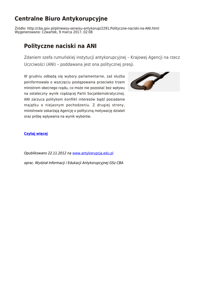 Centralne Biuro Antykorupcyjne Źródło: http://cba.gov.pl/pl/newsy-serwisu-antykorup/2291,Polityczne-naciski-na-ANI.html Wygenerowano: Czwartek, 9 marca 2017, 02:08 Polityczne naciski na ANI Zdaniem szefa rumuńskiej instytucji antykorupcyjnej – Krajowej Agencji na rzecz Uczciwości (ANI) – poddawana jest ona politycznej presji. W grudniu odbędą się wybory parlamentarne, zaś służba poinformowała o wszczęciu postępowania przeciwko trzem ministrom obecnego rządu, co może nie pozostać bez wpływu na ostateczny wynik rządzącej Partii Socjaldemokratycznej. ANI zarzuca politykom konflikt interesów bądź posiadanie majątku o niejasnym pochodzeniu. Z drugiej strony, ministrowie oskarżają Agencję o polityczną motywację działań oraz próbę wpływania na wynik wyborów. Czytaj więcej Opublikowano 22.11.2012 na www.antykorupcja.edu.pl oprac. Wydział Informacji i Edukacji Antykorupcyjnej GSz CBA