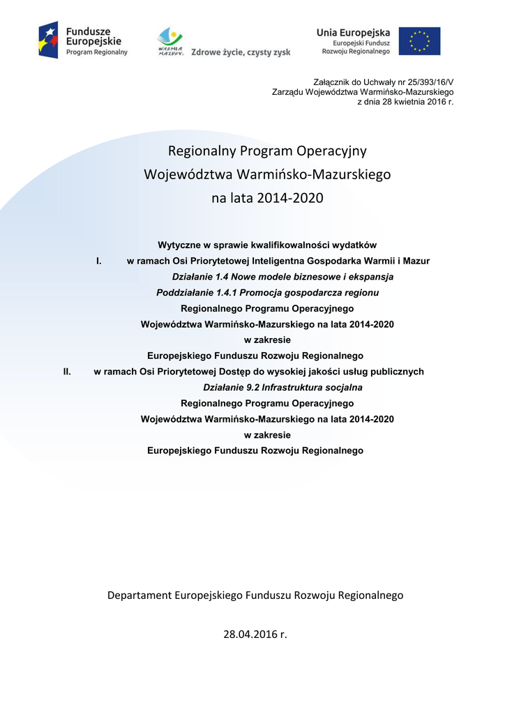 Załącznik do Uchwały nr 25/393/16/V Zarządu du Województwa Warmi Warmińsko-Mazurskiego z dnia 28 kwietnia 2016 r. Regionalny Program Operacyjny Województwa Warmińsko-Mazurskiego Warmińsko Mazurskiego na lata 2014-2020 Wytyc Wytyczne w sprawie kwalifikowalności wydatków I. w ramach Osi Priorytetowej Inteligentna Gospodarka Warmii i Mazur Działanie 1.4 1.4 Nowe modele biznesowe i ekspansja Poddziałanie 1.4.1 1. Promocja gospodarcza regionu Regionalnego Programu Operacyjnego Województwa Warmińsko-Mazurskiego Warmi na lata 2014-2020 2014 w zakresie Europejskiego Funduszu Rozwoju Regionalnego II. w ramach Osi Priorytetowej Dostęp do wysokiej jakości ści usług publicznych Działanie 9.2 Infrastruktura socjalna Regionalnego Programu Operacyjnego Województw Warmińsko-Mazurskiego na lata 2014-2020 Województwa 2014 w zakresie Europejskiego Funduszu Rozwoju Regionalnego Departament Europejskiego Funduszu Rozwoju Regionalnego 28.04.2016 r. Wytyczne w sprawie kwalifikowalności wydatków Działanie 1.4 Nowe modele biznesowe, Poddziałanie 1.4.1 Promocja gospodarcza regionu, Działanie 9.2 Infrastruktura socjalna w ramach Regionalnego Programu Operacyjnego Województwa Warmińsko-Mazurskiego na lata 2014-2020 w zakresie Europejskiego Funduszu Rozwoju Regionalnego 2 Spis treści 1. Wykaz skrótów .................................................................................................................................3 2. Wykaz aktów prawnych ....................................................................................................................3 3. Cel i zakres regulacji..........................................................................................................................4 3.1 Zakres stosowania wytycznych ........................................................................................................4 3.2 Termin poniesienia wydatków ........................................................................................................4 4. Zasady kwalifikowalności wydatków dla Działania 1.4 Nowe modele biznesowe i ekspansja, Poddziałanie 1.4.1 Promocja gospodarcza regionu oraz Działania 9.2 Infrastruktura socjalna .................4 4.1 Zastosowanie uproszczonych metod rozliczania wydatków ..............................................................4 4.2 Wydatki niekwalifikowalne dla wszystkich typów projektów ...........................................................5 5.Szczegółowe zasady kwalifikowalności wydatków dla Działania 1.4 Nowe modele biznesowe i ekspansja, Poddziałanie 1.4.1 Promocja gospodarcza regionu ...............................................................5 5.1. Efekt zachęty .................................................................................................................................5 5.2. Wydatki kwalifikowalne związane z realizacją projektu...................................................................5 5.3 Wydatki niekwalifikowalne w ramach Działania 1.4 Nowe modele biznesowe i ekspansja, Poddziałanie 1.4.1 Promocja gospodarcza regionu ................................................................................6 6. Szczegółowe zasady kwalifikowalności wydatków dla Działania 9.2 Infrastruktura socjalna ................7 6.1 Wydatki kwalifikowalne związane z realizacją projektu....................................................................7 6.1.1. Nadzór........................................................................................................................................7 6.1.2 Inwestor zastępczy oraz Inżynier kontraktu ..................................................................................7 6.1.3 Roboty budowlane.......................................................................................................................8 6.1.4 Zakup wyposażenia ......................................................................................................................8 6.2 Wydatki niekwalifikowalne w ramach Działania 9.2 Infrastruktura socjalną .....................................8 Wytyczne w sprawie kwalifikowalności wydatków Działanie 1.4 Nowe modele biznesowe, Poddziałanie 1.4.1 Promocja gospodarcza regionu, Działanie 9.2 Infrastruktura socjalna w ramach Regionalnego Programu Operacyjnego Województwa Warmińsko-Mazurskiego na lata 2014-2020 w zakresie Europejskiego Funduszu Rozwoju Regionalnego 3 1. Wykaz skrótów 1) MR – Ministerstwo Rozwoju; 2) RPO WiM 2014-2020 – Regionalny Program Operacyjny Województwa Warmińsko3) 4) 5) 6) 7) 8) Mazurskiego na lata 2014-2020; IZ RPO WiM – Instytucja Zarządzająca Regionalnym Programem Operacyjnym Województwa Warmińsko-Mazurskiego na lata 2014-2020; Wytyczne horyzontalne – Wytyczne w zakresie kwalifikowalności wydatków w ramach Europejskiego Funduszu Rozwoju Regionalnego, Europejskiego Funduszu Społecznego oraz Funduszu Spójności na lata 2014-2020; Wytyczne programowe – Wytyczne w sprawie kwalifikowalności wydatków w ramach Osi Priorytetowej Inteligentna Gospodarka Warmii i Mazur Działanie 1.4 Nowe modele biznesowe i ekspansja, Poddziałanie 1.4.1 Promocja gospodarcza regionu, Osi Priorytetowej Dostęp do wysokiej jakości usług publicznych Działanie 9.2 Infrastruktura socjalna Regionalnego Programu Operacyjnego Województwa Warmińsko-Mazurskiego na lata 20142020 w zakresie Europejskiego Funduszu Rozwoju Regionalnego; SZOOP Inteligentna Gospodarka Warmii i Mazur - Szczegółowy Opis Osi Priorytetowej Inteligentna Gospodarka Warmii i Mazur; SZOOP Dostęp do wysokiej jakości usług publicznych - Szczegółowy Opis Osi Priorytetowej Dostęp do wysokiej jakości usług publicznych; EFRR – Europejski Fundusz Rozwoju Regionalnego. 2. Wykaz aktów prawnych Wytyczne zostały wydane na podstawie art. 7 ust. 1 ustawy z dnia 11 lipca 2014 roku o zasadach realizacji programów w zakresie polityki spójności finansowanych w perspektywie 2014-2020 