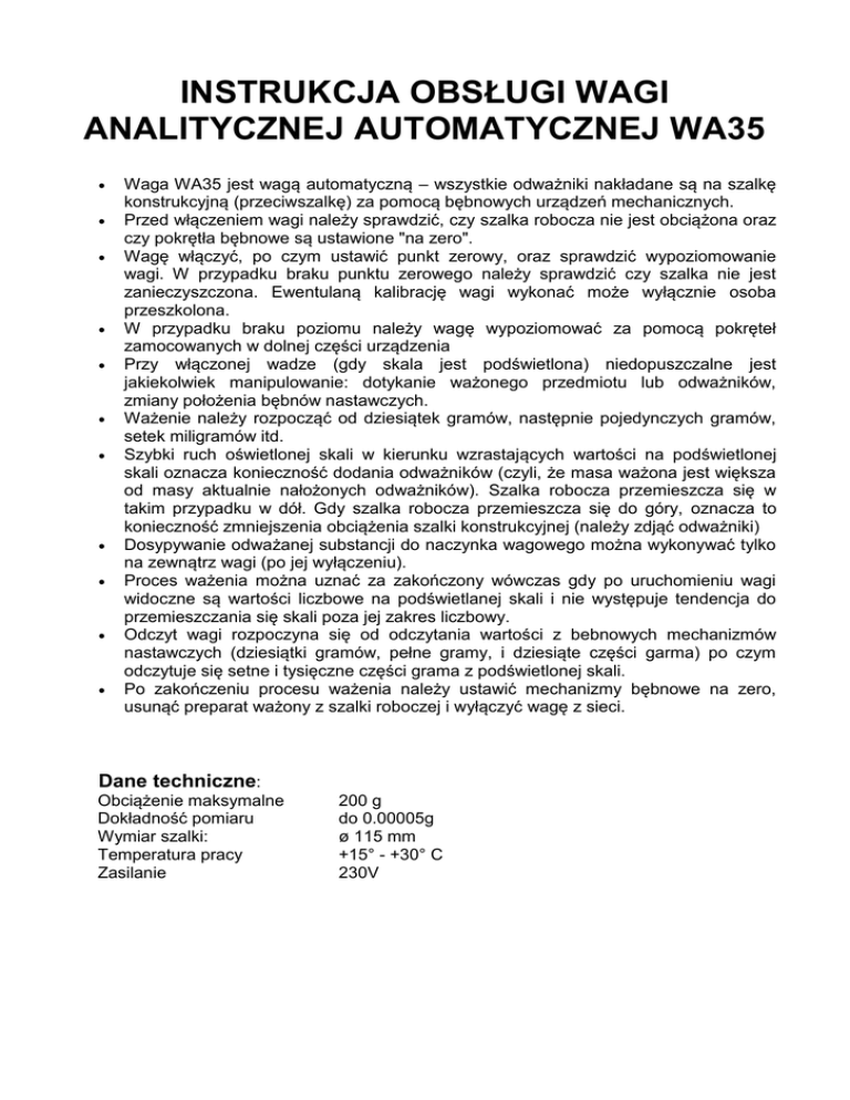 INSTRUKCJA OBSŁUGI WAGI ANALITYCZNEJ AUTOMATYCZNEJ WA35            Waga WA35 jest wagą automatyczną – wszystkie odważniki nakładane są na szalkę konstrukcyjną (przeciwszalkę) za pomocą bębnowych urządzeń mechanicznych. Przed włączeniem wagi należy sprawdzić, czy szalka robocza nie jest obciążona oraz czy pokrętła bębnowe są ustawione "na zero". Wagę włączyć, po czym ustawić punkt zerowy, oraz sprawdzić wypoziomowanie wagi. W przypadku braku punktu zerowego należy sprawdzić czy szalka nie jest zanieczyszczona. Ewentulaną kalibrację wagi wykonać może wyłącznie osoba przeszkolona. W przypadku braku poziomu należy wagę wypoziomować za pomocą pokręteł zamocowanych w dolnej części urządzenia Przy włączonej wadze (gdy skala jest podświetlona) niedopuszczalne jest jakiekolwiek manipulowanie: dotykanie ważonego przedmiotu lub odważników, zmiany położenia bębnów nastawczych. Ważenie należy rozpocząć od dziesiątek gramów, następnie pojedynczych gramów, setek miligramów itd. Szybki ruch oświetlonej skali w kierunku wzrastających wartości na podświetlonej skali oznacza konieczność dodania odważników (czyli, że masa ważona jest większa od masy aktualnie nałożonych odważników). Szalka robocza przemieszcza się w takim przypadku w dół. Gdy szalka robocza przemieszcza się do góry, oznacza to konieczność zmniejszenia obciążenia szalki konstrukcyjnej (należy zdjąć odważniki) Dosypywanie odważanej substancji do naczynka wagowego można wykonywać tylko na zewnątrz wagi (po jej wyłączeniu). Proces ważenia można uznać za zakończony wówczas gdy po uruchomieniu wagi widoczne są wartości liczbowe na podświetlanej skali i nie występuje tendencja do przemieszczania się skali poza jej zakres liczbowy. Odczyt wagi rozpoczyna się od odczytania wartości z bebnowych mechanizmów nastawczych (dziesiątki gramów, pełne gramy, i dziesiąte części garma) po czym odczytuje się setne i tysięczne części grama z podświetlonej skali. Po zakończeniu procesu ważenia należy ustawić mechanizmy bębnowe na zero, usunąć preparat ważony z szalki roboczej i wyłączyć wagę z sieci. Dane techniczne: Obciążenie maksymalne Dokładność pomiaru Wymiar szalki: Temperatura pracy Zasilanie 200 g do 0.00005g ø 115 mm +15° - +30° C 230V