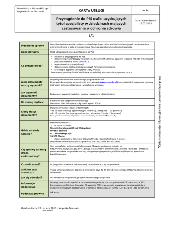 Warmińsko – Mazurski Urząd Wojewódzki w Olsztynie KARTA USŁUGI Przystąpienie do PES osób uzyskujących tytuł specjalisty w dziedzinach mających zastosowanie w ochronie zdrowia Nr 84 Data zatwierdzenia: 16.07.2013 1/1 Przedmiot sprawy Weryfikacja dokumentów osób uzyskujących tytuł specjalisty w dziedzinach mających zastosowanie w ochronie zdrowia w celu przystąpienia do Państwowego Egzaminu Specjalizacyjnego Kogo dotyczy? Osób ubiegających się o przystąpienie do PES wniosek o przystąpienie do PES dokument potwierdzający wniesienie na konto CEM opłaty za egzamin (obecnie 700 zł)K nr konta jest podany na stronie www.cem.edu.pl wypełniona karta specjalizacji dokumentacja realizacji obowiązujących form samokształcenia kserokopia dyplomu ukończenia szkoły wyższej Dokumenty prosimy składać do Wojewody w białej, wiązanej nie podpisanej teczce. Co przygotować? Wypełnij elektronicznie wniosek o przystąpienie do PES Druk wniosku znajduje się na stronie internetowej www.cem.edu.pl Proszę dokładnie przeczytać podaną instrukcję, dotyczącą logowania i wypełniania wniosku. Jakie dokumenty muszę wypełnić? Jak wypełnić dokumenty? Dokumenty wypełnij czytelnie, zgodnie z zawartymi objaśnieniami. Ile muszę zapłacić? Bezpłatnie dla Urzędu Wojewódzkiego Natomiast dla CEM opłata za Egzamin wynosi 700 zł Kiedy złożyć dokumenty? Dokumenty należy złożyć w terminach: - do 15 lipca (na sesję egzaminacyjną jesienną ( 2 listopada - 15 grudnia ) - do 15 stycznia (na sesję egzaminacyjną j wiosenną (2 maja -15 czerwca) Po wydrukowaniu i podpisaniu wniosku należy złożyć do Wojewody. Dokumenty możesz : przesłać na adres: Warmińsko-Mazurski Urząd Wojewódzki Wydział Zdrowia Al. J.Piłsudskiego 7/9 10-575 Olsztyn złożyć osobiście w Kancelarii Głównej Urzędu ( Wydział Zdrowia II piętro) Dodatkowe informacje uzyskasz pod nr tel. 89 - 5232 503, 89 -5232 691 Gdzie załatwię sprawę? Czy sprawę załatwię drogą elektroniczną? Tak, przesyłając wniosek na Elektroniczną Skrzynkę podawczą Urzędu na http://www.olsztyn.uw.gov.pl=> Obsługa interesanta=> Elektroniczna Skrzynka Podawcza - składanie pism i wniosków drogą elektroniczną. Usługa wymaga podpisu profilem zaufanym lub podpisem kwalifikowanym. Co zrobi urząd? W przypadku braków w dokumentacji poprosimy Cię o jej uzupełnienie. Jaki jest czas realizacji? Twoją sprawę załatwimy zgodnie z przepisami, czyli do 14 dni od ostatecznego składania dokumentów do Wojewody. Jak się odwołać? Ustawodawca nie przewiduje trybu odwoławczego w sprawie Informacje dodatkowe Wymogi jakie musisz spełnić w momencie ubiegania się o przystąpienie do PES zawarte są w §23 Rozporządzenia Ministra Zdrowia z 30 września 2002 r. w sprawie uzyskiwania tytułu specjalisty w dziedzinach mających zastosowanie w ochronie zdrowia (Dz.U. z 2002 r., nr 173,poz. 1419 z poźn.zm.) Podstawa prawna Jak wyżej Opiekun Karty: 28 czerwca 2013 r. Angelika Mazurek (data, podpis)
