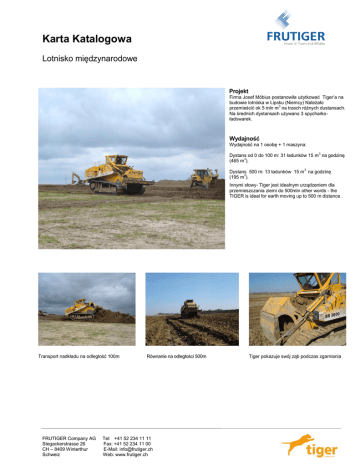 Karta Katalogowa Lotnisko międzynarodowe Projekt Firma Josef Möbius postanowiła użytkować Tiger’a na budowie lotniska w Lipsku (Niemcy) Należało przemieścić ok 5 mln m3 na trzech różnych dustansach. Na średnich dystansach używano 3 spycharkoładowarek. Wydajność Wydajność na 1 osobę + 1 maszyna: Dystans od 0 do 100 m: 31 ładunków 15 m3 na godzinę (465 m3). Dystans 500 m: 13 ładunków 15 m3, na godzinę (195 m3). Innymi słowy- Tiger jest idealnym urządzeniem dla przemieszczania ziemi do 500mIn other words - the TIGER is ideal for earth moving up to 500 m distance . Transport nadkładu na odległość 100m FRUTIGER Company AG Stegackerstrasse 26 CH – 8409 Winterthur Schweiz Równanie na odległości 500m Tel: +41 52 234 11 11 Fax: +41 52 234 11 00 E-Mail: [email protected] Web: www.frutiger.ch Tiger pokazuje swój ząb podczas zgarniania Karta Katalogowa Lotnisko międzynarodowe FRUTIGER Company AG Stegackerstrasse 26 CH – 8409 Winterthur Schweiz Tel: +41 52 234 11 11 Fax: +41 52 234 11 00 E-Mail: [email protected] Web: www.frutiger.ch
