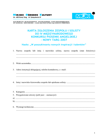 KARTA ZGŁOSZENIA ZESPOŁU I SOLISTY DO IV MIĘDZYNARODOWEGO KONKURSU PIOSENKI ANGIELSKIEJ – NOWY TARG 2007 Hasło: „W poszukiwaniu nowych inspiracji i talentów” 1. Nazwa zespołu lub imię i nazwisko solisty, nazwa zespołu (stan ilościowy) ................................................................................................................................................. ................................................................................................................................................. 2. Wiek uczestnika...................................................................................................................... 3. Adres instytucji delegującej, telefon kontaktowy, e -mail: ................................................................................................................................................. ................................................................................................................................................. 4. Imię i nazwisko kierownika zespołu lub opiekuna solisty: ................................................... ................................................................................................................................................. 5. Kategoria ................................................................................................................................ 5. Przygotowane utwory (jeśli jazz – zaznaczyć): a) .................................................................................................................................................. b) .................................................................................................................................................. 6. Wymogi techniczne................................................................................................................. ................................................................................................................................................. 1 WZÓR ZAPISU PRZESYŁANYCH TEKSTÓW PIOSENEK Jan Kowalski Gimnazjum nr 4 w Zakopanem MADONNA „SORRY” (wykonawca tytuł) I don’t wanna hear, I don’t wanna know 7. Uwagi związane z konkursem: - kolejność występów podana przez organizatorów jest niezmienna; - solista lub zespół zgłasza się do organizatora na godzinę przed występem; Przy rejestracji podaje: nazwę szkoły, imię i nazwisko solisty lub nazwę zespołu; - kolejne 3 zespoły lub soliści czekają na występ w wyznaczonym miejscu (nie zjawienie się powoduje dyskwalifikację); - za dyscyplinę danej grupy odpowiedzialny jest opiekun. 2
