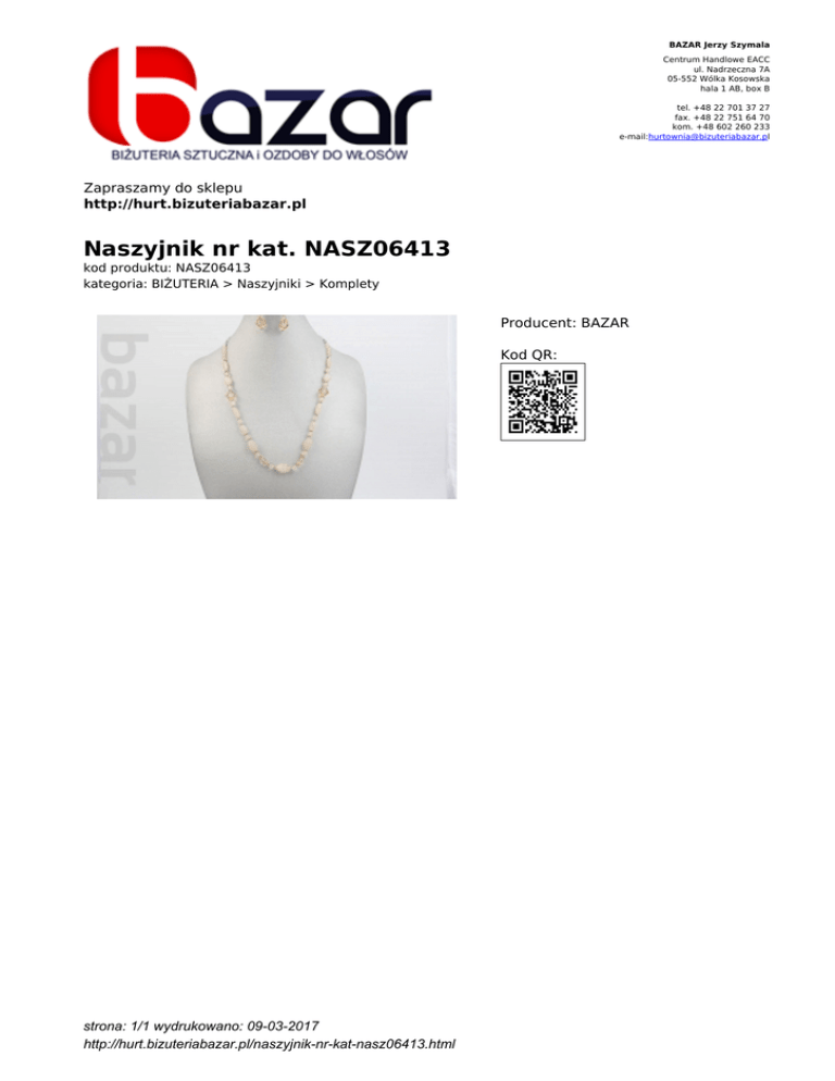 BAZAR Jerzy Szymala Centrum Handlowe EACC ul. Nadrzeczna 7A 05-552 Wólka Kosowska hala 1 AB, box B tel. +48 22 701 37 27 fax. +48 22 751 64 70 kom. +48 602 260 233 e-mail:[email protected] Zapraszamy do sklepu http://hurt.bizuteriabazar.pl Naszyjnik nr kat. NASZ06413 kod produktu: NASZ06413 kategoria: BIŻUTERIA > Naszyjniki > Komplety Producent: BAZAR Kod QR: strona: 1/1 wydrukowano: 09-03-2017 http://hurt.bizuteriabazar.pl/naszyjnik-nr-kat-nasz06413.html