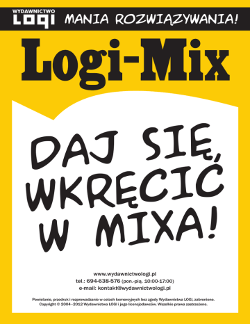 MANIA ROZWIĄZYWANIA! Ę I S DAJ Ć I C Ę WKR ! A X I W M www.wydawnictwologi.pl tel.: 694-638-576 (pon.-pią. 10:00-17:00) e-mail: [email protected] Powielanie, przedruk i rozprowadzanie w celach komercyjnych bez zgody Wydawnictwa LOGI, zabronione. Copyright © 2004–2012 Wydawnictwa LOGI i jego licencjodawców. Wszelkie prawa zastrzeżone. WIELOKROPKI ZASADY ROZWIĄZYWANIA Cyfry w kratkach oznaczają po ilu bokach kratki będzie biegła linia. Połączone linie utworzą pętlę. Pętla nie może się nigdzie przecinać ani urywać. Może być tylko jedna pętla. Dla ułatwienia możesz zastosować takie podejście, że pomiędzy sąsiednimi kropkami musi być albo linia albo x. Wokół kratek, które nie mają żadnej cyfry nie wiadomo po ilu bokach będzie biegła linia. 3 2 1 2 1 2 3 2 2 3 2 2 3 2 2 2 1 2 1 2 2 1 2 2 3 2 2 3 1 2 1 3 2 1 1 3 2 2 2 2 2 2 3 w01894 www.lamiglowki.net 2 ŁAMIGŁÓWKI ARCHITEKTA ZASADY ROZWIĄZYWANIA Przy każdym domku umieść zbiornik z gazem (służącym do ogrzewania domków). Każdy domek musi być połączony ze swoim zbiornikiem jednym z boków (nie rogiem!). Pola ze zbiornikami nie mogą stykać się ze sobą ani bokiem ani rogiem. Liczby przy brzegach określają ile powinno być zbiorników w rzędzie. 3 1 1 2 2 1 1 2 2 1 3 0 3 0 3 1 a02670 5 1 3 2 4 2 3 1 4 1 4 0 6 0 5 6 2 5 2 5 1 6 2 5 1 6 www.lamiglowki.net a02671 3 OBRAZKI LOGICZNE ZASADY ROZWIĄZYWANIA Zamaluj niektóre kratki, a na innych postaw iksy według podanych liczb. Zamalowane kratki po rozwiązaniu utworzą obrazek. Liczby określają ile kratek powinno być zamalowanych w rzędzie. Kratki tworzą grupy rozdzielone krzyżykami. Kolejność grup musi się zgadzać z kolejnością liczb. Wskazówka: zacznij od największych liczb. Zobacz tutoriale on-line i wskazówki na www.wydawnictwologi.pl www.lamiglowki.net 4 PIRAMIDY ZASADY ROZWIĄZYWANIA Ustaw piramidy o wysokościach od 1 do n (przykładzie od 1 do 4) – w każdym rzędzie muszą się znaleźć cztery piramidy różnej wysokości. Kieruj się podanymi liczbami. Oznaczają one ile piramid widać w rzędzie z tego miejsca (1 – widać jedną, najwyższą piramidę; 4 - widać cztery piramidy, czyli ustawione są „według wzrostu”). Wyższe piramidy zasłaniają niższe. 1 3 3 1 2 3 2 3 2 1 2 2 p00155 www.lamiglowki.net 5 4 3 3 p00196 ZADANIA LOGICZNE ZASADY ROZWIĄZYWANIA Rozwiąż zadanie na podstawie wskazówek. Kółkiem zaznaczaj powiązanie a krzyżykiem brak powiązania. Zobacz tutoriale on-line i wskazówki na www.wydawnictwologi.pl www.lamiglowki.net 6 KRZYŻÓWKI LICZBOWE ZASADY ROZWIĄZYWANIA W puste kratki wpisz cyfry od 1 do 9. Białe liczby w czarnych kratkach są sumami wpisanych cyfr (na przykład 23= 9+6+8). Liczba nad ukośną kreską jest sumą cyfr znajdujących się na prawo, a liczba pod ukośną kreską jest sumą cyfr znajdujących się pod nią. W obrębie jednej sumy cyfry nie mogą się powtarzać. Zobacz tutoriale on-line i wskazówki na www.wydawnictwologi.pl 21 17 4 5 Tabelka pomocnicza 31 12 8 17 4 11 23 6 9 3 15 17 25 31 26 15 21 27 16 8 9 7 4 22 38 15 14 11 25 8 9 24 4 15 17 8 k00935 7 www.lamiglowki.net LAMPKI ZASADY ROZWIĄZYWANIA Ustaw lampki tak, żeby każde białe pole było oświetlone. Lampka oświetla pola znajdujące się w tym samym wierszu i kolumnie co pole z lampką, aż do pierwszego czarnego pola, które blokuje światło. Żadna lampka nie może oświetlać innej lampki. Liczby oznaczają ile lampek stoi przy polu z liczbą (od 0 do 4). Żadne białe pole nie może pozostać nieoświetlone. www.lamiglowki.net 8 ROZWIĄZANIA 3 1 0 2 2 2 1 1 2 2 1 0 3 3 2 1 2 2 1 1 2 2 3 2 0 1 1 2 1 3 rw00975 1 2 3 2 2 3 2 2 3 3 2 2 2 1 2 2 1 2 2 1 2 2 3 2 1 2 3 1 2 1 3 2 2 2 1 1 3 2 2 2 2 2 3 3 2 3 3 rw01894 rw00976 5 1 3 2 4 2 3 1 4 1 4 0 6 0 5 6 2 5 2 5 1 6 2 5 1 6 3 1 1 2 2 1 1 2 2 1 3 0 3 0 3 1 ra02670 Miska z kością 3 4 2 1 5 5 1 4 3 2 4 5 3 2 1 1 2 5 4 3 2 3 1 5 4 rp00155 3 1 2 4 5 1 3 5 2 4 9 5 2 4 3 1 4 5 3 1 2 2 4 1 5 3 rp00196 ra02671 1 » garaż » szuflada 2 » komórka » torebka 3 » mieszkanie » stół 4 » piwnica » lodówka 5 » biuro » kieszeń 4 1 1 9 7 2 8 9 7 4 7 2 1 9 6 7 3 9 5 8 7 6 2 3 1 9 3 9 1 3 5 7 8 9 1 2 4 2 8 5 4 7 1 6 8 2 1 8 7 9 3 8 1 3 9 5 8 1 6 rk00935 Te łamigłówki to dopiero przedsmak tego, co znajdziesz w "Logi-Mixie"! Wpraw się teraz na prostych łamigłówkach, aby po wytrwałym treningu móc rozwiązywać te najtrudniejsze, z większą liczbą gwiazdkek! Zamów swój egzemplarz pod numerem 694-638-576 lub przejdź do sklepu online! 10 11