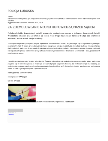 POLICJA LUBUSKA Źródło: http://www.lubuska.policja.gov.pl/go/serwis-informacyjny/aktualnosci/8403,Za-zdemoloweanie-neonu-odpowiedza-przed-Sad em.html Wygenerowano: Czwartek, 9 marca 2017, 02:10 ZA ZDEMOLOWEANIE NEONU ODPOWIEDZĄ PRZED SĄDEM Policjanci służby kryminalnej ustalili sprawców uszkodzenia neonu w jednym z żagańskich hoteli. Wandalami okazali się 15-latek i 18-latek. Ten drugi dewastacji dokonał będąc pod wpływem alkoholu, bo obchodził swoje urodziny. 22 sierpnia tego roku policjanci przyjęli zgłoszenie o uszkodzeniu neonu, znajdującego się na ogrodzeniu jednego z żagańskich hoteli. W czasie prowadzonych działań w tej sprawie policjanci ustalili, że dewastacji cudzego mienia dokonało dwóch młodych mężczyzn. Przez prawie 2 miesiące policjanci służby kryminalnej z żagańskiego zespołu do spraw nieletnich nie odpuszczali sprawy. Efektem ich pracy było ustalenie danych osobowych i dotarcie do 15-latka i 18 – latka, podejrzanych o uszkodzenie neonu. 19 października tego roku 18-letni mieszkaniec Żagania usłyszał zarzut uszkodzenia cudzego mienia. Młody mężczyzna przyznał się do winy i wyjaśnił, że feralnego wieczora był pod wpływem alkoholu, bo obchodził swoje 18. urodziny. Za uszkodzenie cudzego mienia grozi mu kara pozbawienia wolności do lat 5. Natomiast nieletni współsprawca uszkodzenia neonu za swój czyn odpowie przed sądem rodzinnym. źródło; podinsp. Sylwia Woroniec oficer prasowy KPP Żagań tel. 695 870 058 Za zdemoloweanie neonu odpowiedzą przed Sądem Ocena: 0/5 (0) Tweetnij