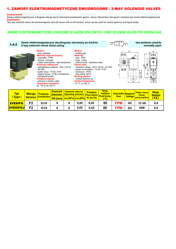 1. ZAWORY ELEKTROMAGNETYCZNE DWUDROGOWE \ 2-WAY SOLENOID VALVES Zastosowanie: Zawory elektromagnetyczne 2-drogowe stosuje się do sterowania przepływem gazów i cieczy. Elementem sterującym zaworem jest cewka elektromagnetyczna. Application: Two way solenoid valves are electromagnetic shut-off valves with on-off function, which can be used for neutral gasevus and liquid media. ZAWORY ELEKTROMAGNETYCZNE 2-DROGOWE DO GAZÓW OPA ŁOWYCH \ 2-WAY SOLENOID VALVES FOR HEATING GAS 1.4-2 Zawór elektromagnetyczny dwudrogowy sterowany po średnio 2-way solenoid valves direct acting Medium - gazy opałowe Materiały użyte do budowy - uszczelka - FPM - korpus - mosiądz - części wewnętrzne - stal nierdzewna Parametry elektryczne - standardowe zasilanie - 230 V, 50 Hz 24 VDC - pobór mocy - 15 VA; 10 W - stopień krycia - IP 65 z konektorem - obciążenie trwałe Położenie robocze - pionowe z cewką u góry Temperatura otoczenia od -10 °C do +50 °C Typ \ Type \ 2VE6IFG 2VE6IFGJ F2 F2 1 Medium - heating gas Materials - seal - FPM - body - brass - internal parts - stainlesss steel Electric data - standard voltage - 230 V, 50 Hz ; 24 VDC - power consumption - 15 VA; 10 W - enclosure - IP 65 - duty rating 100 % Mouting position - vertical solenoid up Ambient temperature -10 °C to +50 °C Prześwit Ciśnienie robocze Wersja Przyłącze Diameter Version Connection DN [mm] bez zasilania otwarty normally open Przepływ Operating pressure Flow factor 3 min.[MPa] max.[MPa] Kv [m /h] G1/4 6 0 0,05 0,45 G1/4 6 0 0,05 0,45 Temp. medium Uszczelka Napięcie Pobór mocy Power Fluid temp. Seal Voltage consumption [°C] 60 60 FPM FPM Waga Weight [ Kg ] AC 15 VA 0,4 DC 10W 0,4