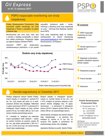 Oil Express nr 41, 6 czerwca 2011 PSPO rozpoczęło monitoring cen śruty rzepakowej Polskie Stowarzyszenie Producentów Oleju uruchomiło system monitoringu cen śruty rzepakowej w Polsce z podziałem na północ i południe kraju. wszystkim hodowcom bydła i trzody, informacji o aktualnej cenie śruty rzepakowej na rynku – informuje Ewa Myśliwiec dyrektor biura PSPO. Monitorowana jest cena śruty netto spot z cennika z kaŜdego poniedziałku w złotych loco zakład produkcyjny. Programem objęte są olejarnie będące członkami PSPO. Ceny śruty rzepakowej będą na bieŜąco zamieszczane na stronie internetowej www.paszerzepakowe.pl oraz w newsletterze Stowarzyszenia „Oil Express”. Zamiarem PSPO jest dostarczanie Ewa Myśliwiec zainteresowanym podmiotom, w tym przede PSPO rozpoczęło monitoring cen śruty rzepakowej ………………..……...………..str.1 Handel zagraniczny w I kwartale 2011 ………………………….……..str.1 Średnie ceny śruty rzepakowej 850 PLN netto / tona W numerze 800 PSPO Północ Stagnacja w plonowaniu wynikiem nietrafnych wyborów odmian rzepaku …………………...……....…...str.2 750 PSPO Południe 700 Rzepakowe prognozy …………………...….…...…...str.3 650 French Grenelle 8.03.2011 29.03.2011 19.04.2011 10.05.2011 31.05.2011 …………..…………….….......str.3 Źródło: Polskie Stowarzyszenie Producentów Oleju ………………...…….…...…...str.4 Handel zagraniczny w I kwartale 2011 Według wstępnych danych Sparks Polska, import rzepaku w I kwartale br. wyniósł 27,5 tys. ton, czyli prawie tyle samo co w analizowanym okresie roku ubiegłego. Natomiast w ujęciu sezonowym 2010/11 w pierwszych 9 miesiącach import rzepaku do kraju wyniósł ponad 216 tys. ton wobec 296 tys. ton w tym samym okresie poprzedniego sezonu. W I kwartale br. zwiększył się natomiast import pozostałych roślin oleistych – nasion soi wzrósł 2-krotnie do poziomu prawie 20 tys. ton, zaś nasion słonecznika o 30% do 7 tys. ton. O 22% do 8,3 tys. ton wzrósł równieŜ import oleju rzepakowego. Notowania Eksport rzepaku w miesiącach styczeńmarzec br. wyniósł niemal 20 tys. ton i był o 47% mniejszy od poziomu eksportu w tym samym okresie ubiegłego roku. W ujęciu sezonowym – w pierwszych 9 miesiącach sezonu 2010/11 eksport wyniósł 268 tys. ton wobec 329 tys. ton poprzedniego sezonu. Jednocześnie zmniejszył się równieŜ eksport oleju rzepakowego – za pierwszy trzy miesiące br. wynosi on 21 tys. ton, co oznacza 70% spadek w porównaniu do analizowanego okresu roku ubiegłego. Agnieszka Słodowa na podst. Sparks Polska Polskie Stowarzyszenie Producentów Oleju ul. Grzybowska 2 lok. 49 00-131 Warszawa tel. : 223130788 fax: 224363966 e-mail: [email protected] www.pspo.com.pl Oil Express Kierownik projektu: Ewa Myśliwiec Redakcja: Agnieszka Słodowa Zdjęcia: własne PSPO Czerwiec 2011 Strona 1 Oil Express Stagnacja w plonowaniu wynikiem nietrafnych wyborów odmian rzepaku Polskie Stowarzyszenie Producentów Oleju obserwuje stagnację w plonowaniu rzepaku ozimego w ostatnich 6 latach. Rynek materiału siewnego rzepaku w Polsce uległ niebezpiecznemu rozregulowaniu. Aktualnie rolnicy mogą skorzystać z szerokiej oferty odmianowej zawartej we Wspólnotowym Katalogu Odmian Roślin Rolniczych (CCA) oraz w Krajowym Rejestrze. niem rozwiązań zaistniałych problemów. Eksperci zgadzają się, Ŝe istnieje realna moŜliwość zmniejszenia dysproporcji PSPO postanowiło takŜe zaangaŜować pomiędzy wynikami COBORU a plonami swoje siły jeszcze w tym sezonie dla uzyskiwanymi przez rolników na polach promowania wyników plonowania produkcyjnych o ok. 10 punktów proc. poszczególnych odmian uzyskanych w niezaleŜnych stacjach COBORU. Ewa Myśliwiec Przy czym doświadczenia prowadzone w stacjach doświadczalnych oceny odmian COBORU pokazują, Ŝe odmiany z CCA wypadają w naszym kraju znacznie gorzej niŜ odmiany z Krajowego Rejestru. Niestety, rolnicy przekonywani marketingowymi „sztuczkami” łatwo padają ofiarą firm handlujących tymi odmianami. Analizując problematykę, Roman Rybacki prezes zarządu PSPO stwierdza Kolejną przyczyną jest zbyt małe wykorzystanie wyŜej plonujących odmian mieszańcowych w strukturze zasiewów, które w Polsce wynosi ok. 20-30%, natomiast w Niemczech i Rumunii ok. 70%, a nawet na Ukrainie blisko 50%. Dostrzegamy teŜ fakt, iŜ umoŜliwienie dystrybutorom przez hodowców wybranych odmian na wyłączność skutkuje wzrostem cen materiału siewnego – dodaje prezes PSPO. Niestety bałagan panujący na rynku materiału siewnego często pociąga za sobą decyzje producentów o rozmnoŜeniach własnych zwiększających ilość kolejnych obszarów o słabszym plonie. Wszystko to dzieje się w momencie kiedy popyt na rzepak stale wzrasta podobnie jak i jego ceny. Celem poprawy obecnej sytuacji, PSPO i KZPR wraz z ekspertami COBORU rozpoczęły juŜ dyskusję nad wypracowa- PSPO Czerwiec 2011 Strona 2 Oil Express Rzepakowe prognozy Z kolei u wschodnich sąsiadów naszego kraju, tj. w krajach WNP, na czele z Ukrainą i Rosją, zbiory rzepaku w zbliŜającym się sezonie mogą osiągnąć około 3,5 mln ton wobec 2,7 mln ton w bieŜącym sezonie. W sezonie 2011/12 produkcja rzepaku na świecie będzie na zbliŜonym jak w bieŜącym sezonie poziomie - 59,2 mln ton, jednak światowa podaŜ rzepaku oraz canoli zmniejszy się. Skutkiem tego będzie spadek globalnego przerobu o około 1,5 mln ton, co oznacza redukcję produkcji oleju oraz śruty rzepakowej. W Kanadzie miały miejsce przymrozki we wschodnich rejonach prerii, jednak straty będą ograniczone nawet przy opóźnionych siewach, a zbiory mogą osiągnąć 13,2 mln ton. zbiorów w najwaŜniejszych rejonach uprawy Niemiec, Francji czy innych państw, zaliczanych do wiodących producentów rzepaku w Unii. Pogorszenie perspektyw dla letnich zbiorów spowodowało zwyŜkę notowań W Australii produkcja rzepaku prawdo- s