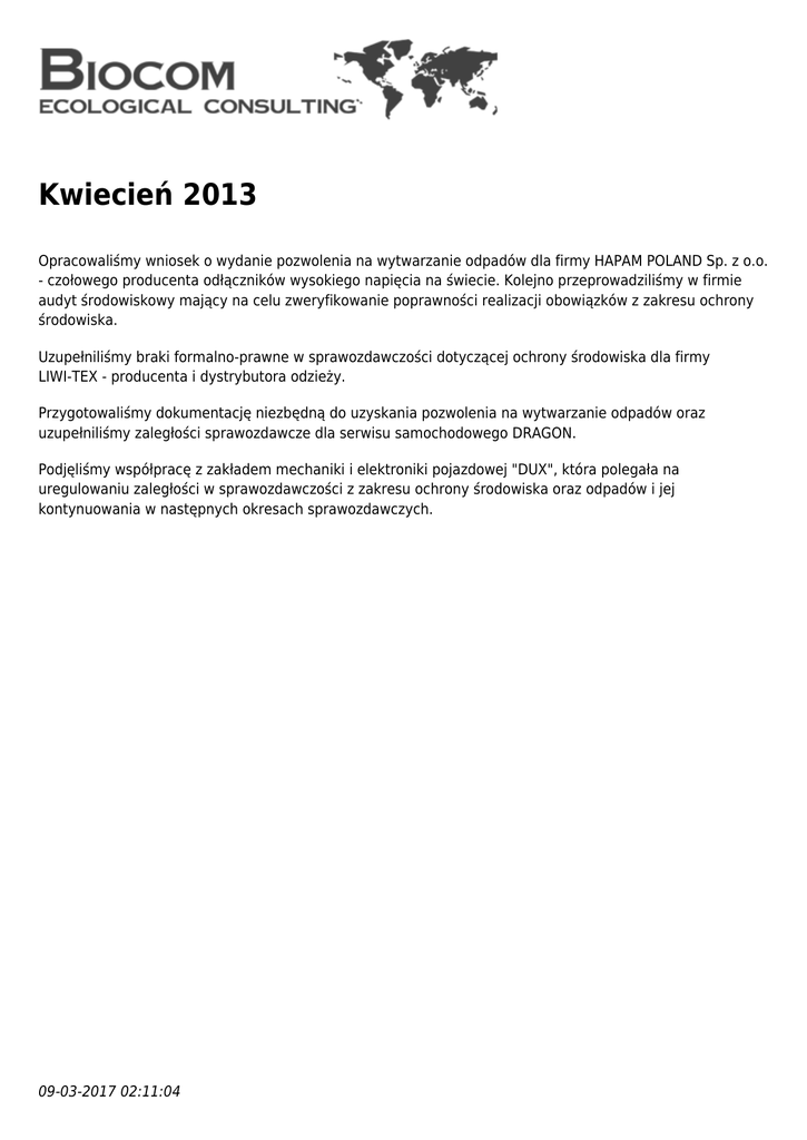 Kwiecień 2013 Opracowaliśmy wniosek o wydanie pozwolenia na wytwarzanie odpadów dla firmy HAPAM POLAND Sp. z o.o. - czołowego producenta odłączników wysokiego napięcia na świecie. Kolejno przeprowadziliśmy w firmie audyt środowiskowy mający na celu zweryfikowanie poprawności realizacji obowiązków z zakresu ochrony środowiska. Uzupełniliśmy braki formalno-prawne w sprawozdawczości dotyczącej ochrony środowiska dla firmy LIWI-TEX - producenta i dystrybutora odzieży. Przygotowaliśmy dokumentację niezbędną do uzyskania pozwolenia na wytwarzanie odpadów oraz uzupełniliśmy zaległości sprawozdawcze dla serwisu samochodowego DRAGON. Podjęliśmy współpracę z zakładem mechaniki i elektroniki pojazdowej "DUX", która polegała na uregulowaniu zaległości w sprawozdawczości z zakresu ochrony środowiska oraz odpadów i jej kontynuowania w następnych okresach sprawozdawczych. 09-03-2017 02:11:04
