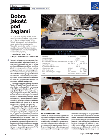 Żagle maj 2010 P r z e gl ą d Targi „Wiatr i Woda” 2010 Dobra jakość pod żaglami Aż 31 jachtów żaglowych, oraz jeden pojazd napędzany żaglem, naliczyliśmy na 22. Targach „Wiatr i Woda” 2010. W tych statystykach zarejestrowaliśmy sześć produktów premierowych. Wszystkie łączy jedna cecha – wysoka jakość wykonania. Oto najciekawsze, naszym zdaniem, konstrukcje żaglowe warszawskiej wystawy. Tekst Dominik Życki Zdjęcia Seweryn Czarnocki Wniosek, jaki nasunął się zaraz po obejrzeniu wszystkich jachtów żaglowych wystawionych na targach, jest taki, że polscy producenci kładą coraz większy nacisk na jakość swoich produktów. Coraz większą uwagę poświęcają nowoczesnemu projektowi wnętrza, wysokiej jakości wykończeń, obić i zabudowy. Wymaga tego konkurencja i oczekiwania klientów, a za sprawą zebranych przez lata doświadczeń stoczniowych te cele są dziś możliwe do osiągnięcia dla większości polskich producentów. Na szczególną uwagę zasługują Gwoździe Targów „Wiatr i Woda”. Nagrodę Miesięcznika „Żagle” im. Jerzego Fijki przyznajemy w dwóch kategoriach żaglowych. W pierwszej – Jachty Żaglowe Małe, czyli do 7,5 m długości, zgłoszono 7 jednostek, w tym aż 5, które do maksimum wykorzystują możliwość żeglowania bez patentu żeglarskiego i mierzą nie więcej niż 7,5 m. Wydaje się, że sztukę konstruowania jachtów o tej długości doskonale opanował Wojciech Spisak, bo do nagrody zgłoszono aż 4 jednostki jego projektu... W kategorii Jachty Żaglowe Duże zgłoszono 7 jednostek o długości powyżej 7,5 m, przy czym dwie z nich miały w trakcie wystawy swoje premiery. Wszystkie, z wyjątkiem jednej, to typowe jachty kabinowe, stworzone głównie z myślą o żeglowaniu po jeziorach i tylko Comet 35 S ze stoczni Comar Poland zaprojektowany został od razu z myślą o morzu (ma kategorię A). Jedyny jacht niekabinowy wśród tej siódemki to pochodzący ze Stoczni Ustka Sp. z o.o. sportowy CYD 3308, nowoczesna łódź regatowa klasy GP33 wykonana z włókien węglowych. Janmor 25 dane techniczne parametr długość kadłuba szerokość kadłuba zanurzenie bez miecza (z mieczem/kilem) masa jachtu wysokość w kabinie wysokość masztu nad KLW powierzchnia żagli silnik stacjonarny silnik pomocniczy (na pawęży) cena W nowym wydaniu w. mieczowa w. kilowa 7,49 m 2,52 m 0,31 m/1,41 m 1,20 m ok. 1750 kg ok. 1800 kg 1,78 m 9,05 m 27,0 m² 27,5 m² brak 8 – 13 KM 4,0 – 9,8 KM 6,0 – 9,8 KM od 83 tys. zł (w tym 22% VAT) Janmor 25 otrzymał najwięcej punktów u pięcioosobowego jury i zdobył nagrodę – Gwoździa Targów w kategorii Jachtów Małych. Ma dość wysoki kadłub o szerokiej wodnicy i niewielkiej szerokości całkowitej – tylko 2,52 m, umożliwiającej transport drogowy. To powoduje, że burty jednostki są niemal pionowe, ale cały kształt nie jest przysadzisty i znakomicie nawiązuje do tradycyjnych łodzi produkowanych od 35 lat przez stocznię Janmor. Jak zwykle u Spisaka do maksimum wykorzystano wnętrze. Laminatowa wkładka mieści 6 koi, stół, kambuz z kuchenką na kardanie, zlewozmywak, lodówkę i… oczywiście osobną kabinę toaletową, co jest już standardem na polskim rynku jachtów tej wielkości. Kokpit jest podniesiony, by nad Żagle | www.zagle.com.pl