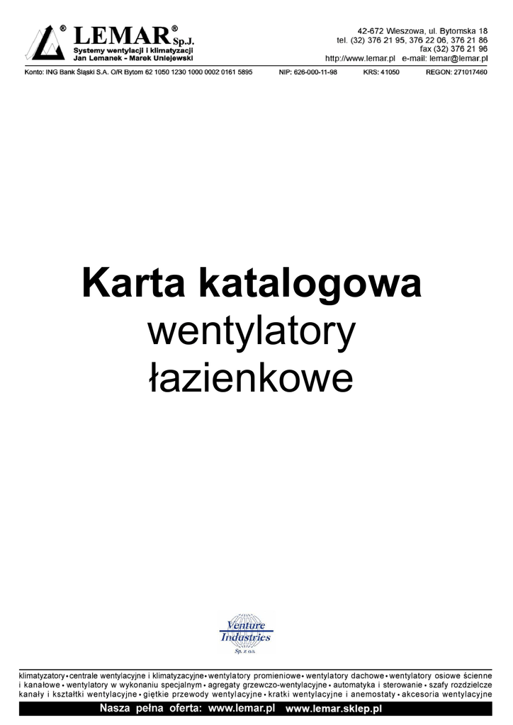 Karta katalogowa wentylatory łazienkowe wentylatory ³azienkowe EDM Zastosowanie Przeznaczone s¹ do monta¿u w ³azienkach, pralniach, pomieszczeniach mieszkalnych i biurowych. Mog¹ byæ montowane na œcianie lub suficie. Konstrukcja Wentylatory EDM przystosowane s¹ do pracy w dowolnej pozycji i monta¿u bezpoœrednio w kana³ach wentylacyjnych (O90, O100 i O125). Wentylatory EDM wykonane s¹ z tworzywa sztucznego. Do kabin prysznicowych przeznaczone s¹ wentylatory EDM 100S-12V i EDM 100C-12V, zasilane napiêciem 12V ze stopniem ochrony IP 57, i posiadaj¹ zabezpieczenie przed pora¿eniem pr¹du w klasie III. Wentylatory z higrostatem (wersja H) - stopieñ ochrony IP40. Silnik elektryczny Silnik elektryczny 230 V, 50 Hz z ³o¿yskami kulkowymi. Silnik posiada zabezpieczenie przed pora¿eniem pr¹dem w klasie II, izolacjê uzwojenia w klasie B, stopieñ IP44. Przystosowany do pracy w temp. do 40oC. Schemat pod³¹czenia elektrycznego: rys. 3, 4, 5 str. 775, rys. 6, 7, 8, 8a str. 776. Propozycja monta¿u Bezpoœrednie wyprowadzenie kana³u na zewn¹trz Wyprowadzenie na zewn¹trz poprzez krótki kana³ Wyprowadzenie do wspólnego systemu wentylacji Wyprowadzenie kana³u na zewn¹trz przez podwójn¹ siatkê Dane techniczne prêdkoœæ obrotowa [obr./min] pobór mocy max. [W] napiêcie [V] EDM 80 2350 9 230 EDM 100 2450 13 EDM 200 2500 25 Typ natê¿enie [A] wydajnoœæ max. [m3/h] ciœnienie max. [Pa] poziom ciœnienia akustycznego [dB(A)] masa 0,07 80 24 33 0,4 230 0,08 95 33 40 0,5 220-240 0,15 180 50 46 0,9 [kg] Wyposa¿enie NZ 80 NTZ SZ Lampka kontrolna • OpóŸnienie czasowe TZ • HZ • CZ • • CTZ • 100 MZ • ECZ CHZ VMZ • • • CRZ • • • SZ • • Automatyczna ¿aluzja • TZ • HZ • 200 CZ • • OpóŸnienie czasowe regulowane • • • • • • CTZ CHZ CRZ • • • • • • • • • • • Czujnik œwiat³a Czujnik wilgotnoœci, regulowany • W³¹cznik sznurkowy • • • • • • • • • • Monta¿ okienny £o¿yska kulkowe RZ • • • • • • • • • • • • • • • • • • • • • 432 Venture Industries Sp. z o.o. ul. Mokra 27, 05-092 £omianki - Kie³pin tel. +48 22 751 95 50, 751 20 31 fax +48 22 751 22 59, 751 12 02 e-mail: [email protected] wentylatory ³azienkowe EDM Charakterystyki pracy Wymiary [mm] EDM 80 121,5 121,5 Q [m3/h] Q [m3/s] EDM 100 Q [m3/h] Q [m3/s] EDM 200 Q [m3/h] Q [m3/s] www.venture.pl 433