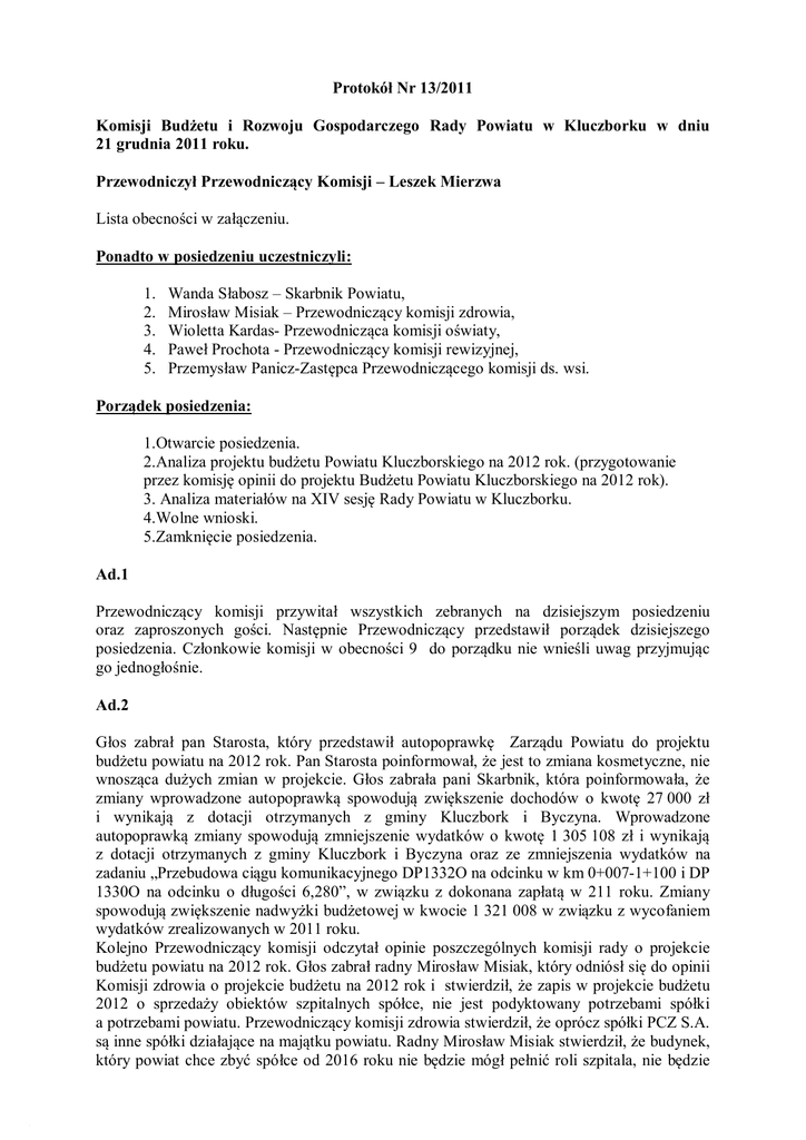 Protokół Nr 13/2011 Komisji Budżetu i Rozwoju Gospodarczego Rady Powiatu w Kluczborku w dniu 21 grudnia 2011 roku. Przewodniczył Przewodniczący Komisji – Leszek Mierzwa Lista obecności w załączeniu. Ponadto w posiedzeniu uczestniczyli: 1. 2. 3. 4. 5. Wanda Słabosz – Skarbnik Powiatu, Mirosław Misiak – Przewodniczący komisji zdrowia, Wioletta Kardas- Przewodnicząca komisji oświaty, Paweł Prochota - Przewodniczący komisji rewizyjnej, Przemysław Panicz-Zastępca Przewodniczącego komisji ds. wsi. Porządek posiedzenia: 1.Otwarcie posiedzenia. 2.Analiza projektu budżetu Powiatu Kluczborskiego na 2012 rok. (przygotowanie przez komisję opinii do projektu Budżetu Powiatu Kluczborskiego na 2012 rok). 3. Analiza materiałów na XIV sesję Rady Powiatu w Kluczborku. 4.Wolne wnioski. 5.Zamknięcie posiedzenia. Ad.1 Przewodniczący komisji przywitał wszystkich zebranych na dzisiejszym posiedzeniu oraz zaproszonych gości. Następnie Przewodniczący przedstawił porządek dzisiejszego posiedzenia. Członkowie komisji w obecności 9 do porządku nie wnieśli uwag przyjmując go jednogłośnie. Ad.2 Głos zabrał pan Starosta, który przedstawił autopoprawkę Zarządu Powiatu do projektu budżetu powiatu na 2012 rok. Pan Starosta poinformował, że jest to zmiana kosmetyczne, nie wnosząca dużych zmian w projekcie. Głos zabrała pani Skarbnik, która poinformowała, że zmiany wprowadzone autopoprawką spowodują zwiększenie dochodów o kwotę 27 000 zł i wynikają z dotacji otrzymanych z gminy Kluczbork i Byczyna. Wprowadzone autopoprawką zmiany spowodują zmniejszenie wydatków o kwotę 1 305 108 zł i wynikają z dotacji otrzymanych z gminy Kluczbork i Byczyna oraz ze zmniejszenia wydatków na zadaniu „Przebudowa ciągu komunikacyjnego DP1332O na odcinku w km 0+007-1+100 i DP 1330O na odcinku o długości 6,280”, w związku z dokonana zapłatą w 211 roku. Zmiany spowodują zwiększenie nadwyżki budżetowej w kwocie 1 321 008 w związku z wycofaniem wydatków zrealizowanych w 2011 roku. Kolejno Przewodniczący komisji odczytał opinie poszczególnych komisji rady o projekcie budżetu powiatu na 2012 rok. Głos zabrał radny Mirosław Misiak, który odniósł się do opinii Komisji zdrowia o projekcie budżetu na 2012 rok i stwierdził, że zapis w projekcie budżetu 2012 o sprzedaży obiektów szpitalnych spółce, nie jest podyktowany potrzebami spółki a potrzebami powiatu. Przewodniczący komisji zdrowia stwierdził, że oprócz spółki PCZ S.A. są inne spółki działające na majątku powiatu. Radny Mirosław Misiak stwierdził, że budynek, który powiat chce zbyć spółce od 2016 roku nie będzie mógł pełnić roli szpitala, nie będzie stanowił o dochodach spółki. Przewodniczący komisji stwierdził, że zakup budynku nie pozwoli spółce na zaciągnięcie jakiegokolwiek kredytu na rozwój. Przewodniczący komisji zdrowia zwrócił uwagę, że zarząd spółki nie wyraził zgody na zaciągnięcie kredytu na 2,5 mln. zł na zakup budynku i z analiz , które posiada spółka starci ona płynność finansową. Przewodniczący komisji zdrowia poinformował, że na sesji padnie wniosek o wycofanie z porządku obrad sesji punktu dotyczącego sprzedaży budynku szpitala spółce. Przewodniczący komisji zdrowia dodał, że nie można sprzedawać budynku wbrew analizom finansowym i woli zarządu spółki. Radny Stanisław Konarski stwierdził, że na komisji rolnictwa pan Starosta poinformował, że zarząd spółki wyraził zgodę na zakup tego budynku, natomiast tak nie jest i zapytał z czego to wynika. Pan Starosta wyjaśnił, że propozycja zbycia i wyposażenia spółki w majątek jest propozycją realną, zarząd szpitala złożył wniosek o zakup tego obiektu, dostał pozytywną opinię rady nadzorczej spółki, podjęta została uchwała walnego zgromadzenia w tej sprawie, ale po tygodniu zarząd spółki wycofał się ze swojej propozycji i stwierdził, że nie chce kupić tego budynku szpitalnego. Przewodniczący komisji zdrowia poinformował, że zarząd spółki wycofał się po przeprowadzonych analizach, z których wynika, że spółka starci płynność finansową. Przewodniczący komisji zdrowia dodał, że sprzedaż budynku szpitalnego spółce PCZ S.A. wyniknęła z tego, że nie udało się sprzedać stacji paliw. Przewodniczący komisji zdrowia dodał, że jest to urocze rozwiązanie z punktu widzenia zarządu powiatu, gdyż powiat jest właścicielem spółki, natomiast z punktu widzenia spółki nie jest to dla spółki korzystne. Pan Starosta powiedział, że ekspertyzy finansowe mogą być różne w zależności od tego jakie wskaźniki zostaną założone w jej przeprowadzeniu, argument, że wszystko drożeje dotyczy wszystkich nie tylko służby zdrowia. Pan Starosta poinformował, że w ramach budżetu 2011 rozważana była możliwość zbycia obiektów szpitalnych spółce, aby w ten sposób wyposażyć spółkę w majątek oraz odzyskać choć część pieniędzy włożonych przez powiat. Pan Starosta dodał, że wcześniej, zanim sytuacja była taka napięta, były rozważania zarządu spółki co do zakupu budynków szpitalnych i zaciągnięcia kredytu na wartość o wiele wyższą niż 2,5 mln. zł w oparciu o analizy różnych banków. Rady Tadeusz Konarski zapytał, kto był inicjatorem kupna tej nieruchomości. Pan Starosta odpowiedział, że zarząd powiatu, jednak rozmowy w tym temacie trwały od dawna. Radny Leszek Mierzwa zapytał, na ile wyceniono nieruchomości. Pan Starosta odpowiedział, ze budynek główny szpitala wyceniono na 9 mln. 600 tys. wraz z gruntem, natomiast budynek laryngologii i pediatrii na 3 mln.71 tys. Przewodniczący komisji zdrowia stwierdził, że jeżeli budynek spełnia warunki to można w niego inwestować w tym wypadku tak nie jest. Głos zabrał pan Starosta, który stwierdził, że budynek ten jest szpitalowi potrzebny na rożnego rodzaju działalności. Pan Starosta zwrócił uwagę n