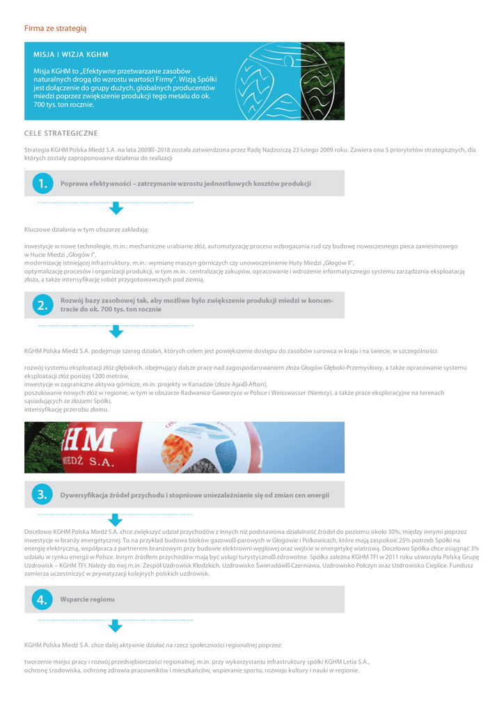 Firma ze strategią MISJA I WIZJA KG H M Misja KGHM to „Efektywne przetwarzanie zasobów naturalnych drogą do wzrostu wartości Firmy”. Wizją Spółki jest dołączenie do grupy dużych, globalnych producentów miedzi poprzez zwiększenie produkcji tego metalu do ok. 700 tys. ton rocznie. C ELE STRATEG IC ZNE Strategia KGHM Polska Miedź S.A. na lata 2009 –2018 została zatwierdzona przez Radę Nadzorczą 23 lutego 2009 roku. Zawiera ona 5 priorytetów strategicznych, dla których zostały zaproponowane działania do realizacji . Kluczowe działania w tym obszarze zakładają: inwestycje w nowe technologie, m.in.: mechaniczne urabianie złóż, automatyzację procesu wzbogacania rud czy budowę nowoczesnego pieca zawiesinowego w Hucie Miedzi „Głogów I”, modernizację istniejącej infrastruktury, m.in.: wymianę maszyn górniczych czy unowocześnienie Huty Miedzi „Głogów II”, optymalizację procesów i organizacji produkcji, w tym m.in.: centralizację zakupów, opracowanie i wdrożenie informatycznego systemu zarządzania eksploatacją złoża, a także intensyfikację robót przygotowawczych pod ziemią. KGHM Polska Miedź S.A. podejmuje szereg działań, których celem jest powiększenie dostępu do zasobów surowca w kraju i na świecie, w szczególności: rozwój systemu eksploatacji złóż głębokich, obejmujący dalsze prace nad zagospodarowaniem złoża Głogów Głęboki‐Przemysłowy, a także opracowanie systemu eksploatacji złóż poniżej 1200 metrów, inwestycje w zagraniczne aktywa górnicze, m.in. projekty w Kanadzie (złoże Ajax -Afton), poszukiwanie nowych złóż w regionie, w tym w obszarze Radwanice‐Gaworzyce w Polsce i Weisswasser (Niemcy), a także prace eksploracyjne na terenach sąsiadujących ze złożami Spółki, intensyfikację przerobu złomu. Docelowo KGHM Polska Miedź S.A. chce zwiększyć udział przychodów z innych niż podstawowa działalność źródeł do poziomu około 30%, między innymi poprzez inwestycje w branży energetycznej. To na przykład budowa bloków gazowo -parowych w Głogowie i Polkowicach, które mają zaspokoić 25% potrzeb Spółki na energię elektryczną, współpraca z partnerem branżowym przy budowie elektrowni węglowej oraz wejście w energetykę wiatrową. Docelowo Spółka chce osiągnąć 3% udziału w rynku energii w Polsce. Innym źródłem przychodów mają być usługi turystyczno -zdrowotne. Spółka zależna KGHM TFI w 2011 roku utworzyła Polską Grupę Uzdrowisk – KGHM TFI. Należy do niej m.in. Zespół Uzdrowisk Kłodzkich, Uzdrowisko Świeradów -Czerniawa, Uzdrowisko Połczyn oraz Uzdrowisko Cieplice. Fundusz zamierza uczestniczyć w prywatyzacji kolejnych polskich uzdrowisk. KGHM Polska Miedź S.A. chce dalej aktywnie działać na rzecz społeczności regionalnej poprzez: tworzenie miejsc pracy i rozwój przedsiębiorczości regionalnej, m.in. przy wykorzystaniu infrastruktury spółki KGHM Letia S.A., ochronę środowiska, ochronę zdrowia pracowników i mieszkańców, wspieranie sportu, rozwoju kultury i nauki w regionie. Priorytetem zmian jest wprowadzenie mechanizmu zarządzania przez cele, programy rozwoju kadr i stworzenie przejrzystej struktury holdingowej. Według założeń Spółki łączne nakłady inwestycyjne na realizację projektów strategicznych w latach 2009–2018 wyniosą około 19,8 mld złotych. Realizacja strategii poprawi w krótkim okresie konkurencyjność kosztową Spółki. W wyniku realizacji strategii KGHM Polska Miedź S.A. stanie się międzynarodowym holdingiem miedziowym o zdywersyfikowanych źródłach przychodów, co uniezależni Firmę od wahań cen miedzi.
