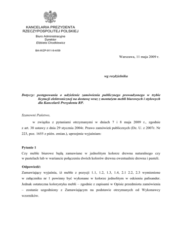 KANCELARIA PREZYDENTA RZECZYPOSPOLITEJ POLSKIEJ Biuro Administracyjne Dyrektor ElŜbieta Chodkiewicz BA-WZP-911-9-4/09 Warszawa, 11 maja 2009 r. wg rozdzielnika Dotyczy: postępowania o udzielenie zamówienia publicznego prowadzonego w trybie licytacji elektronicznej na dostawę wraz z montaŜem mebli biurowych i stylowych dla Kancelarii Prezydenta RP. Szanowni Państwo, w związku z pytaniami otrzymanymi w dniach 7 i 8 maja 2009 r., zgodnie z art. 38 ustawy z dnia 29 stycznia 2004r. Prawo zamówień publicznych (Dz. U. z 2007r. Nr 223, poz. 1655 z późn. zmian.), uprzejmie wyjaśniam: Pytanie 1 Czy meble biurowe będą zamawiane w jednolitym kolorze drewna naturalnego czy w pastelach lub w wariancie połączeniu dwóch kolorów drewna ewentualnie drewna i pasteli. Odpowiedź: Zamawiający wyjaśnia, iŜ meble z pozycji 1.1, 1.2, 1.3, 1.4, 2.1 2.2, 2.3 wymienione w załączniku nr 1 powinny być wykonane w kolorze jednolitym w odcieniu palisander. Jednak ostateczna kolorystyka mebli – zgodnie z zapisami w Opisie przedmiotu zamówienia – zostanie uzgodniony z Zamawiającym na podstawie otrzymanych od Wykonawcy wzorników. Pytanie 2 Czy dopuszczacie Państwo wymiar szafy metalowej BHP 800x490x1800h (są to standardowe wymiary takiej szafy stosowane przez wiodących producentów mebli metalowych, a podane przez Państwa wymiary i przykładowa szafa nie są juŜ stosowane przez danego producenta). Odpowiedź: Zamawiający dopuszcza szafę metalową BHP o wymiarach 800x490x1800h Pytanie 3 Do jakich powierzchni mają być kółka w krzesłach obrotowych (wpływa to na cenę)? Odpowiedź: Zamawiający wyjaśnia, Ŝe kółka w krzesłach muszą być przystosowane do powierzchni dywanowych i wykładzinowych. Pytanie 4 Czy dopuszczacie Państwo wymiary krzesła plastikowego składanego: szer. siedziska 45 cm, gł. siedziska 40 cm, wys. siedziska 45 cm (na podstawie w kolorze Alu) lub szer. siedziska 39,5 cm, gł. siedziska 39,5 cm, wys. siedziska 45 cm (na czarnej podstawie) – jaką ma mieć podstawę to krzesło (w jakim kolorze)? Odpowiedź: Zamawiający wyjaśnia, Ŝe podane wymiary z załączniku nr 1: szerokość siedziska – 39 cm, głębokość siedziska – 42 cm, wysokość siedziska – 45 cm są wymiarami minimalnymi. W związku z powyŜszym Zamawiający dopuszcza krzesło plastikowe o podanych powyŜej wymiarach, jednakŜe z zastrzeŜeniem, iŜ zgodnie z wymaganiami Zamawiającego podanymi w Opisie przedmiotu zamówienia w pkt. 5.3 wymagany jest czarny kolor krzesła, tj. siedzisko wraz z podstawą. Pozostałe postanowienia specyfikacji istotnych warunków zamówienia pozostają bez zmian. Z wyrazami szacunku /-/ ElŜbieta Chodkiewicz 2