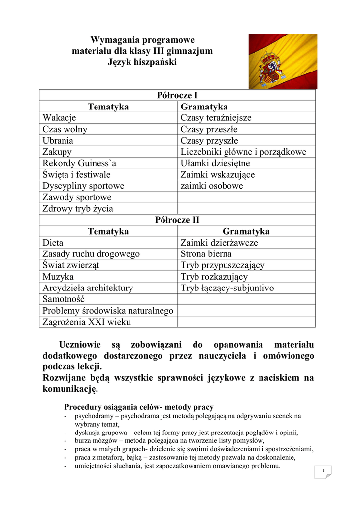 Wymagania programowe materiału dla klasy III gimnazjum Język hiszpański Tematyka Wakacje Czas wolny Ubrania Zakupy Rekordy Guiness`a Święta i festiwale Dyscypliny sportowe Zawody sportowe Zdrowy tryb życia Półrocze I Gramatyka Czasy teraźniejsze Czasy przeszłe Czasy przyszłe Liczebniki główne i porządkowe Ułamki dziesiętne Zaimki wskazujące zaimki osobowe Półrocze II Tematyka Dieta Zasady ruchu drogowego Świat zwierząt Muzyka Arcydzieła architektury Samotność Problemy środowiska naturalnego Zagrożenia XXI wieku Gramatyka Zaimki dzierżawcze Strona bierna Tryb przypuszczający Tryb rozkazujący Tryb łączący-subjuntivo Uczniowie są zobowiązani do opanowania materiału dodatkowego dostarczonego przez nauczyciela i omówionego podczas lekcji. Rozwijane będą wszystkie sprawności językowe z naciskiem na komunikację. Procedury osiągania celów- metody pracy - psychodramy – psychodrama jest metodą polegającą na odgrywaniu scenek na wybrany temat, dyskusja grupowa – celem tej formy pracy jest prezentacja poglądów i opinii, burza mózgów – metoda polegająca na tworzenie listy pomysłów, praca w małych grupach- dzielenie się swoimi doświadczeniami i spostrzeżeniami, praca z metaforą, bajką – zastosowanie tej metody pozwala na doskonalenie, umiejętności słuchania, jest zapoczątkowaniem omawianego problemu. 1