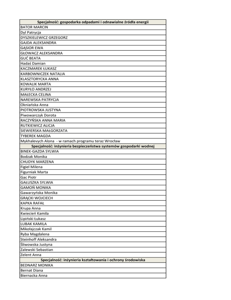 Specjalność: gospodarka odpadami i odnawialne źródła energii BATOR MARCIN Dyl Patrycja DYSZKIELEWICZ GRZEGORZ GAJDA ALEKSANDRA GĄSIOR EWA GŁOWACZ ALEKSANDRA GUĆ BEATA Hadaś Damian KACZMAREK ŁUKASZ KARBOWNICZEK NATALIA KLASZTORYCKA ANNA KOWALIK MARTA KURYŁO ANDRZEJ MAŁECKA CELINA NAREWSKA PATRYCJA Okniańska Anna PIOTROWSKA JUSTYNA Piwowarczyk Dorota RACZYŃSKA ANNA MARIA RUTKIEWICZ ALICJA SIEWIERSKA MAŁGORZATA TYBEREK MAGDA Mykhalevych Alona - w ramach programu teraz Wrocław Specjalność: inżynieria bezpieczeństwa systemów gospodarki wodnej BINEK-GAZDA SYLWIA Bodzak Monika CHUDYK MARZENA Figiel Milena Figurniak Marta Gac Piotr GAŁUSZKA SYLWIA GAMOŃ MONIKA Gawarzyńska Monika GRĄCKI WOJCIECH KAPKA RAFAŁ Krupa Anna Kwiecień Kamila Lipiński Łukasz LUBAK KAMILA Mikołajczak Kamil Ryba Magdalena Steinhoff Aleksandra Śliwowska Justyna Zalewski Sebastian Zelent Anna Specjalność: inżynieria kształtowania i ochrony środowiska BEDNARZ MONIKA Bernat Diana Biernacka Anna CHOŁUJ KATARZYNA Chorociej Anna Ćwirko Marcelina Dziekan Olga Gnoińska Joanna GONTAREK EWA JABŁOŃSKA AGNIESZKA JANIAK DAGMARA Jasińska Sylwia KAPUSTA ALICJA KOCZAN MARTA Królikowska Sandra Mołdach Anna SKRAJNA MAGDALENA SZUL MARTA Szymczak Dominika Wysocka Marta Yushchak Ivan Specjalność: inżynieria wodna Borowska Kornelia Gaweł Anita HELBIN DOMINIKA Hutniczak Wojciech JASKÓLSKA ALEKSANDRA KAWULKA DOROTA KLISZCZYŃSKI PATRYK KOTOWSKA PAULINA KUCHARCZYK JAKUB LISOWSKA KAROLINA Litwin Anna Liwczycka Magdalena Ołdakowski Mateusz OSTRUSZKA WOJCIECH PATER MARTYNA RÓŻYC KAMIL Stulgis Hubert WANJAS PIOTR WIATRAK KAROLINA WOJCIECHOWSKI MARCIN Wolski Krzysztof WOŹNIAK TOMASZ Specjalność: technika sanitarna BOCZKOWSKI MACIEJ CHMIELEWSKA PAULINA DOJNIKOWSKA SYLWIA DOMAŃSKA DARIA DRAGAŃSKI PIOTR GIL MARCIN GLEZMAN PAWEŁ HETNAR MICHAŁ MICHALAK PATRYCJA MICHALSKA JOANNA PABIN KAROLINA PACIA ANNA PESZEK DARIA Piechnat Monika PIĘCIŃSKA MAGDALENA ŚLIWIŃSKA KAROLINA WAL JACEK WITOSZEK ANNA WRÓBEL KAROLINA WRÓBLEWSKA KATARZYNA WRÓBLEWSKI RADOSŁAW ŻAK AGNIESZKA