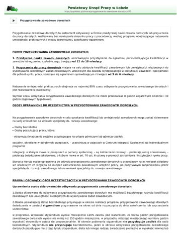Powiatowy Urząd Pracy w Łobzie http://puplobez.pl/strona/przygotowanie-zawodowe-doroslych/70 Przygotowanie zawodowe dorosłych Przygotowanie zawodowe dorosłych to instrument aktywizacji w formie praktycznej nauki zawodu dorosłych lub przyuczenia do pracy dorosłych, realizowany bez nawiązania stosunku pracy z pracodawcą, według programu obejmującego nabywanie umiejętności praktycznych i wiedzy teoretycznej, zakończony egzaminem. FORMY PRZYGOTOWANIA ZAWODOWEGO DOROSŁYCH: 1. Praktyczna nauka zawodu dorosłych umożliwiająca przystąpienie do egzaminu potwierdzającego kwalifikacje w zawodzie lub egzaminu czeladniczego, trwająca od 12 do 18 miesięcy. 2. Przyuczenie do pracy dorosłych mające na celu zdobycie kwalifikacji zawodowych lub umiejętności, niezbędnych do wykonywania określonych zadań zawodowych, właściwych dla zawodu występującego w klasyfikacji zawodów i specjalności dla potrzeb rynku pracy, kończące się egzaminem sprawdzającym i trwające od 3 do 6 miesięcy. Nabywanie umiejętności praktycznych obejmuje co najmniej 80% czasu odbywania przygotowania zawodowego dorosłych i jest realizowane u pracodawcy. Wymiar czasu odbywania przygotowania zawodowego dorosłych nie może przekraczać 8 godzin zegarowych dziennie i 40 godzin zegarowych tygodniowo. OSOBY UPRAWNIONE DO UCZESTNICTWA W PRZYGOTOWANIU ZAWODOWYM DOROSŁYCH: Na przygotowanie zawodowe dorosłych w celu uzyskania kwalifikacji lub umiejętności zawodowych mogą zostać skierowane na swój wniosek lub na wniosek specjalisty ds. rozwoju zawodowego: ● ● Osoby bezrobotne Osoby poszukujące pracy, które: - otrzymują świadczenie socjalne przysługujące na urlopie górniczym lub górniczy zasiłek socjalny, określone w odrębnych przepisach, - uczestniczą w zajęciach w Centrum Integracji Społecznej lub indywidualnym programie integracji, o którym mowa w przepisach o pomocy społecznej, - są żołnierzami rezerwy, - pobierają rentę szkoleniową, pobierają świadczenie szkoleniowe, o którym mowa w art. 70 ust. 6 ustawy o promocji zatrudnienia i instytucjach rynku pracy. Starosta kieruje osobę uprawnioną do odbycia przygotowania zawodowego dorosłych u pracodawcy na jej wniosek składany we właściwym ze względu na miejsce zamieszkania powiatowym urzędzie pracy, po pozytywnym zaopiniowaniu przez specjalistę ds. rozwoju zawodowego lub na wniosek specjalisty ds. rozwoju zawodowego. PRAWA I OBOWIĄZKI OSÓB UCZESTNICZĄCYCH W PRZYGOTOWANIU ZAWODOWYM DOROSŁYCH Uprawnienia osoby skierowanej do odbywania przygotowania zawodowego dorosłych: 1.Osoba skierowana do odbywania przygotowania zawodowego dorosłych ma możliwość bezpłatnego nabycia kwalifikacji zawodowych lub umiejętności niezbędnych do wykonywania zadań zawodowych. 2.Osobie posiadającej status bezrobotnego przysługuje w okresie realizacji programu przygotowania zawodowego dorosłych świadczenie w postaci stypendium przyznawane na okres od dnia rozpoczęcia do dnia zakończenia lub zaprzestania uczestnictwa w programie. Wysokość stypendium wynosi miesięcznie 120% zasiłku pod warunkiem, że liczba godzin przygotowania zawodowego dorosłych wynosi nie mniej niż 150 godzin miesięcznie, w przypadku niższego miesięcznego wymiaru godzin wysokość stypendium ustala się proporcjonalnie. W okresie pobierania stypendium nie przysługuje zasiłek dla osób bezrobotnych. Stypendium nie przysługuje bezrobotnemu, jeżeli w okresie odbywania przygotowania zawodowego dorosłych przysługuje mu z tego tytułu stypendium, dieta lub innego rodzaju świadczenie pieniężne w wysokości równej lub wyższej niż stypendium z tytułu uczestnictwa w przygotowaniu zawodowym dorosłych. 3. Osoba odbywająca przygotowanie zawodowe dorosłych zachowuje prawo do stypendium za okres udokumentowanej niezdolności do pracy, przypadający w okresie jego odbywania, za który na podstawie odrębnych przepisów pracownicy zachowują prawo do wynagrodzenia lub przysługują im zasiłki z ubezpieczenia społecznego w razie choroby lub macierzyństwa. Starosta nie wypłaca stypendium za okres nieusprawiedliwionych nieobecności uczestnika przygotowania zawodowego dorosłych. 4. Osoba skierowana do odbycia przygotowania zawodowego dorosłych może ubiegać się o: ● ● ● zwrot kosztów przejazdu powstałych w związku z dojazdem do miejsca odbywania przygotowania zawodowego dorosłych i powrotem, finansowanie kosztów zakwaterowania i wyżywienia w przypadku odbywania przygotowania zawodowego dorosłych poza miejscem zamieszkania, refundację poniesionych i udokumentowanych kosztów opieki nad osobą zależną lub dziećmi do lat 7 na każde dziecko w wysokości nie wyższej niż 50 % kwoty zasiłku, jeśli bezrobotny z tytułu podjęcia przygotowania zawodowego dorosłych osiąga miesięczne przychody nie przekraczające minimalnego wynagrodzenia za pracę. 5. Uczestnikowi przygotowania zawodowego dorosłych przysługują dni wolne w wymiarze 2 dni za każde 30 dni kalendarzowych zrealizowanego programu, za ostatni miesiąc odbywania przygotowania zawodowego dorosłych pracodawca jest obowiązany udzielić dni wolnych przed upływem terminu zakończenia przygotowania zawodowego dorosłych. Obowiązki osoby skierowanej do odbywania przygotowania zawodowego dorosłych: 1.Osoba skierowana do odbywania przygotowania zawodowego dorosłych zobowiązana jest do: a) brania udziału w zajęciach przewidzianych programem przygotowania zawodowego dorosłych, b) stosowania się do rozkładu czasu pracy i regulaminu pracy obowiązującego u pracodawcy, c) stosowania się do planu nauczania i regulaminów obowiązujących w instytucji szkoleniowej, - na 2 miesiące przed zakończeniem programu przygotowania zawodowego dorosłych składa w instytucji wskazanej do przeprowadzenia egzaminu wniosek o dopuszczenie do egzaminu przewidzianego w programie, a w przypadku egzaminu potwierdzającego kwalifikacje w zawodzie do wniosku składanego w okręgowej k
